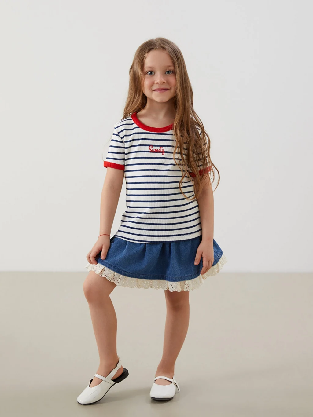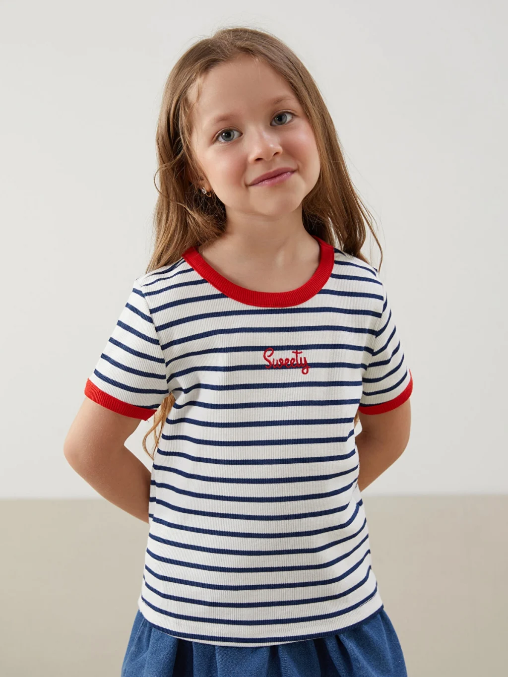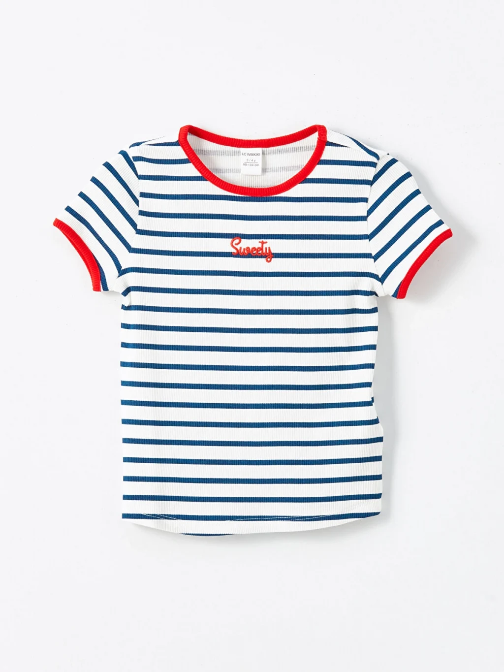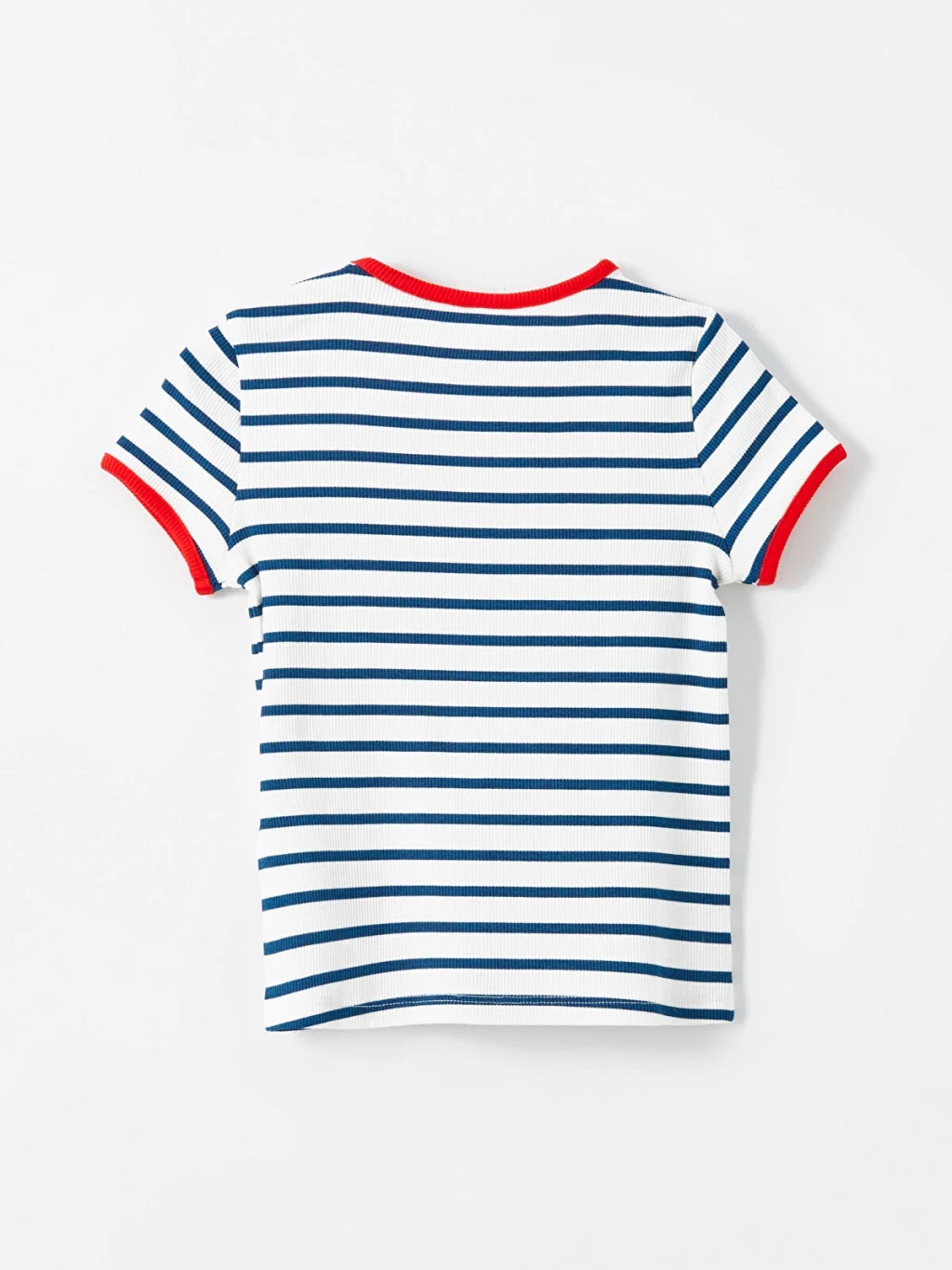 Dar kalıp kız çocuk tişört, yüksek pamuk içerikli kaşkorse kumaştan üretilmiştir. Bisiklet yakalı, kısa kollu ve çizgili desenlidir.