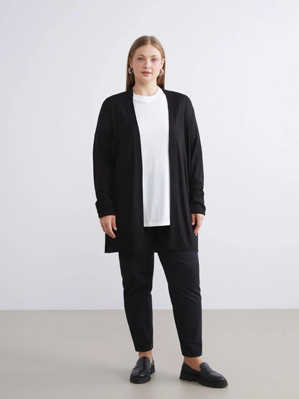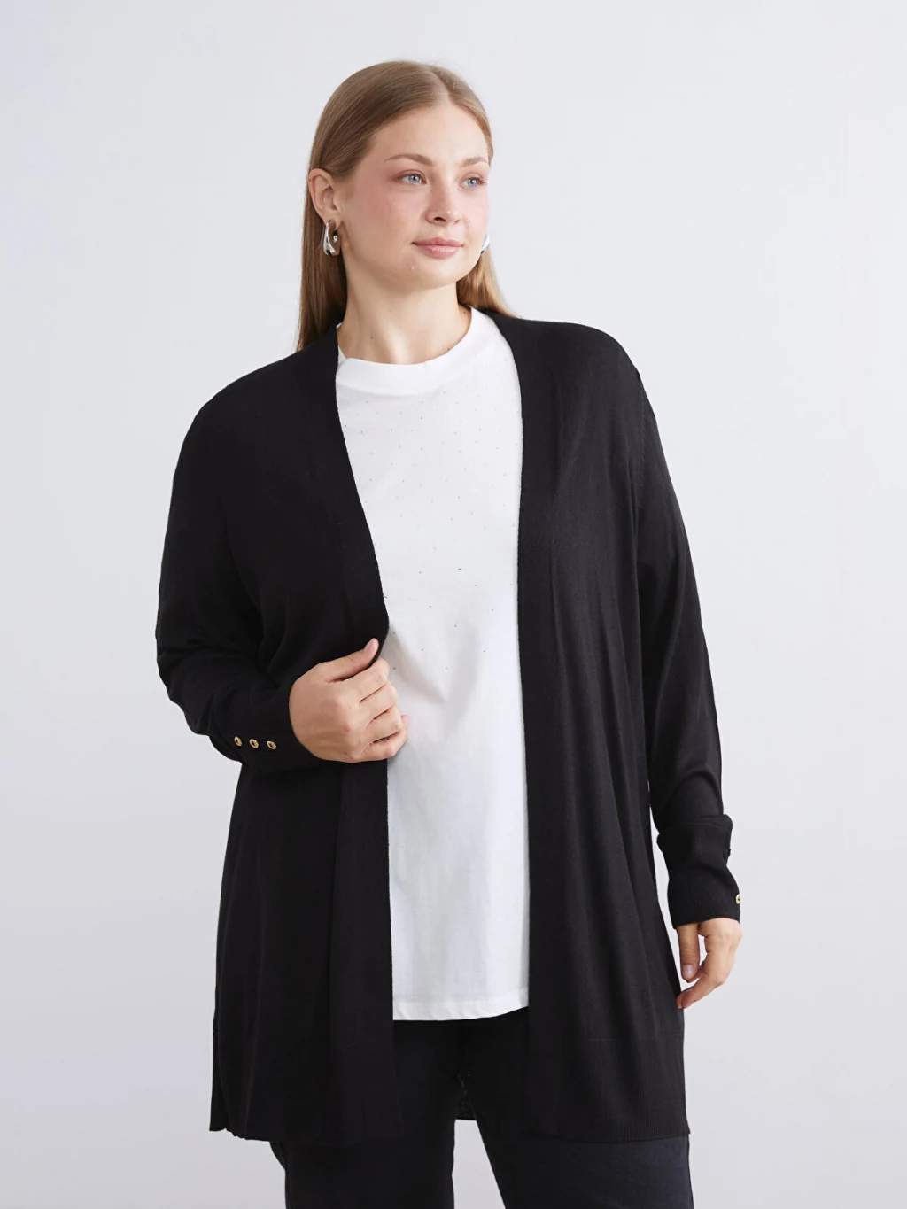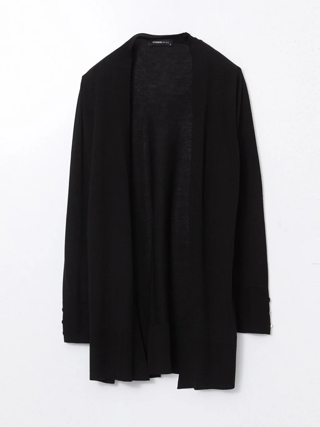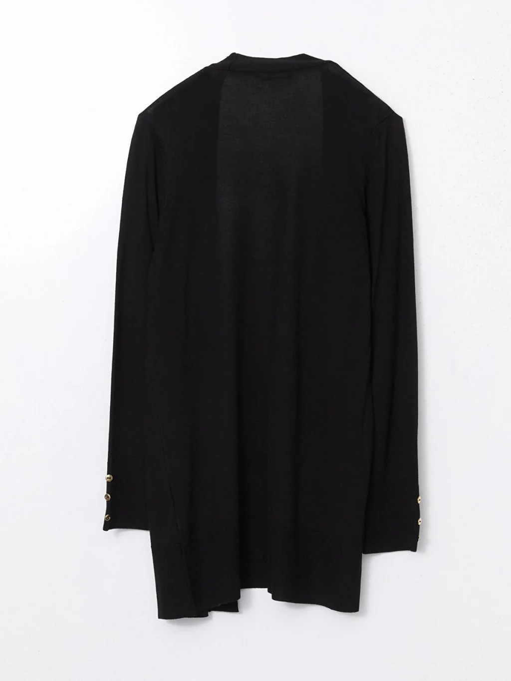 İnce triko kumaştan üretilen kadın hırka, önü açık ve uzun kollu bir tasarıma sahiptir. Kol manşetleri düğmelidir.