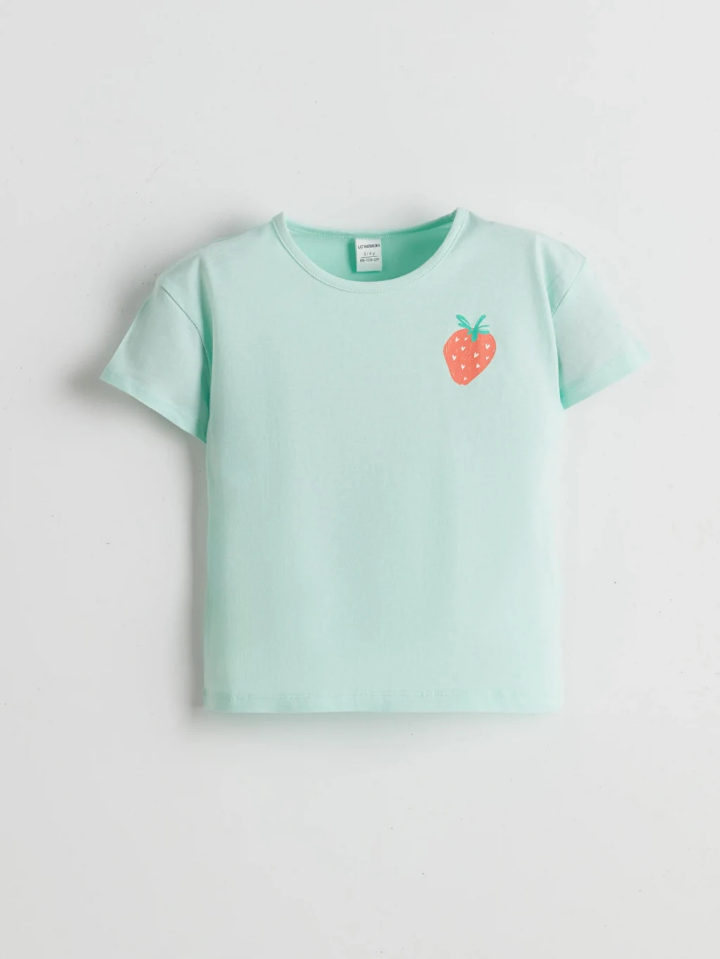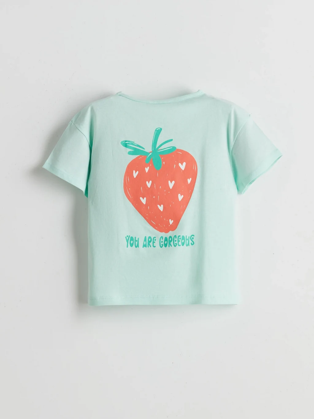 Kız çocuk tişört, %100 pamuklu penye kumaştan üretilmiştir. Bisiklet yaka, kısa kollu ve sırtı çilek baskılıdır.