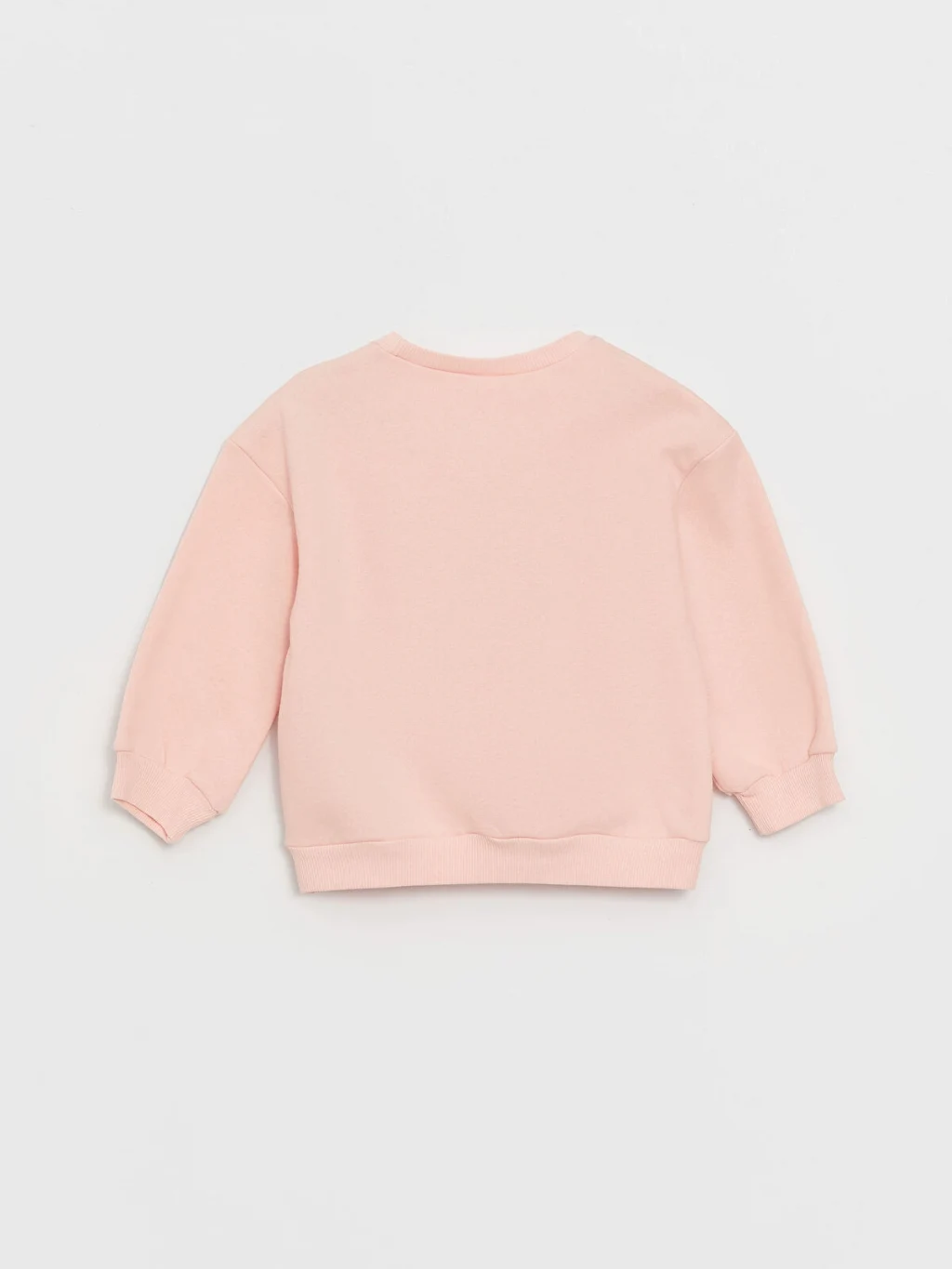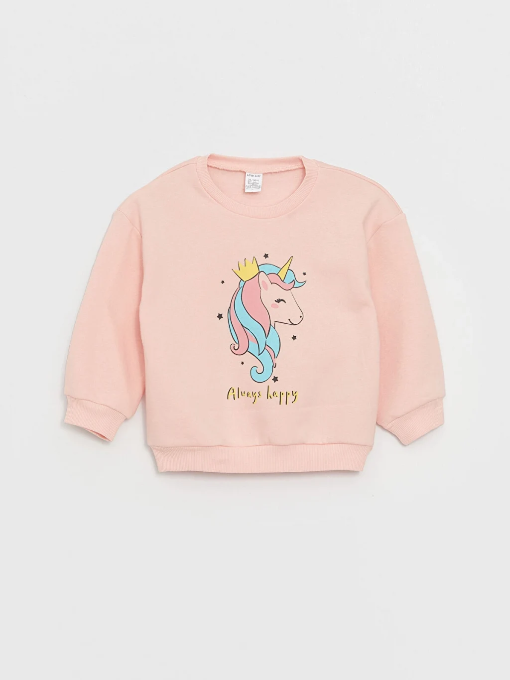 bisiklet yakalı ve uzun kollu kız çocuk sweatshirt, kalın 3 iplik kumaştan üretilmiştir. Önü baskılı olup, kol ve etek ucu ribanalıdır.