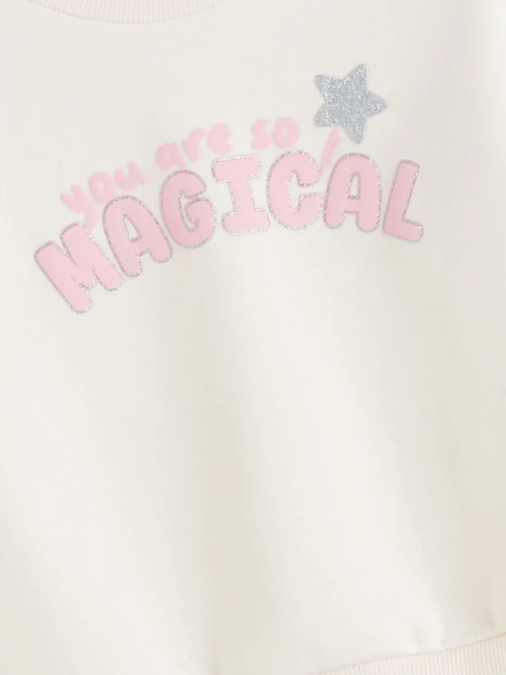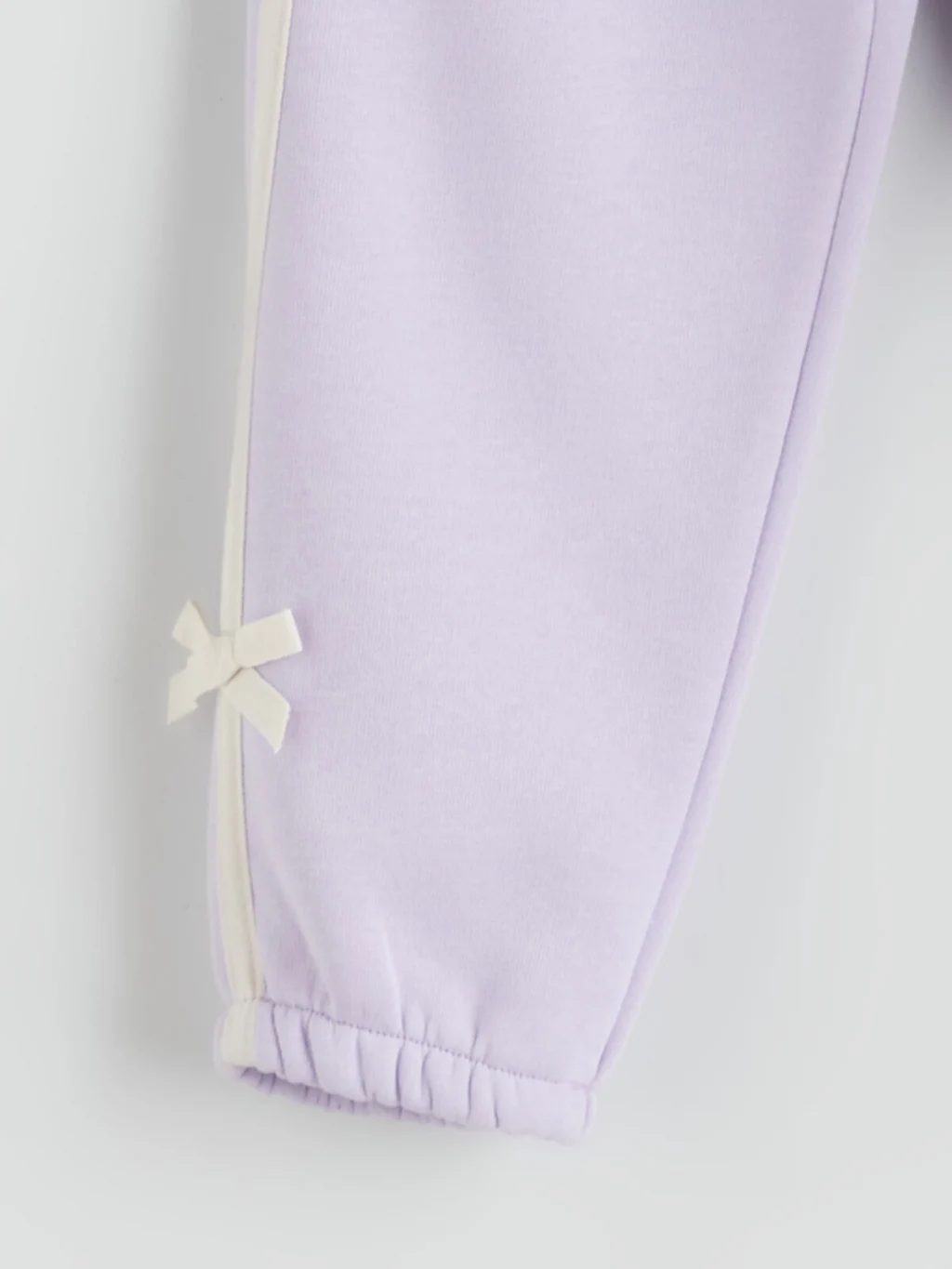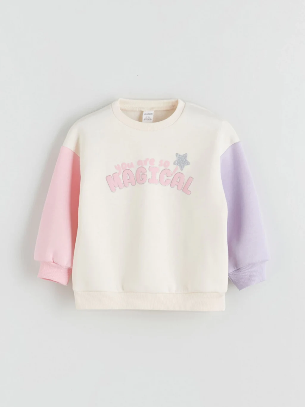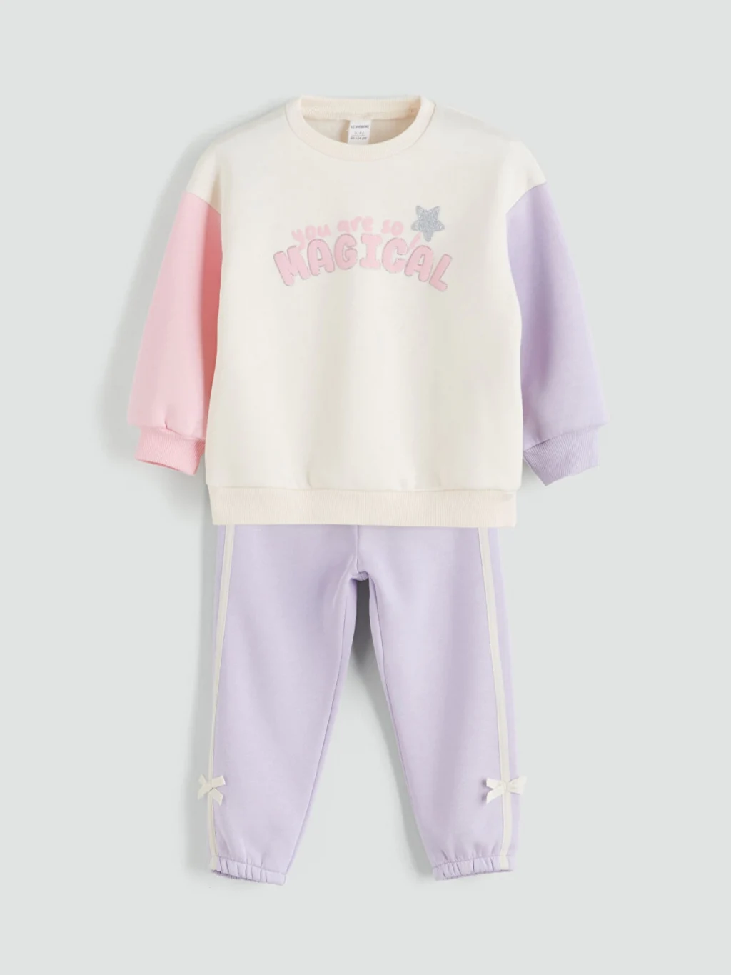 Kız çocuk takım, 3 iplik şardonlu kumaştan üretilmiştir. Jogger eşofman altı, bilekleri ve alt kısmı ribanalı sweatshirtten oluşur.