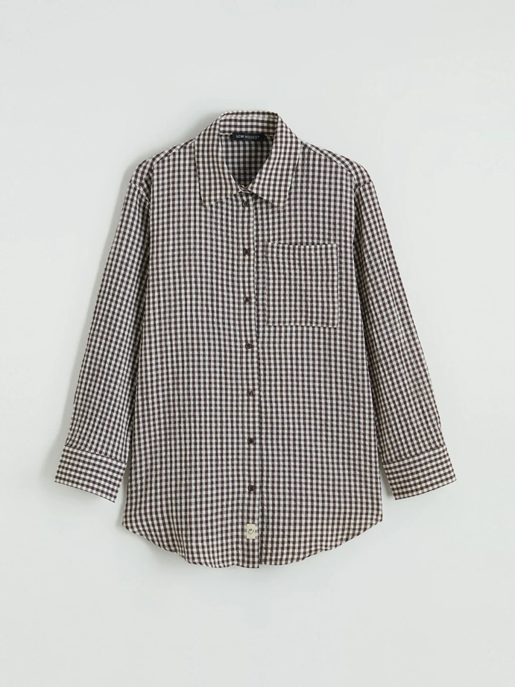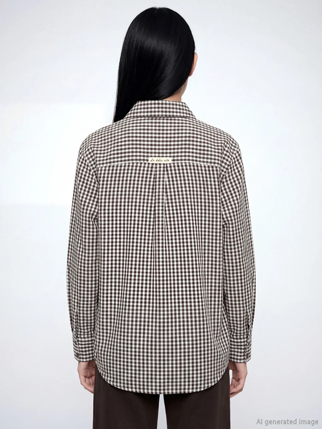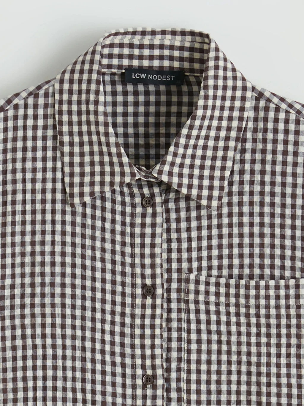 Uzun kollu ve kareli desenli kadın gömlek tunik, tek cepli tasarıma sahip olup önden düğme kapamalıdır.