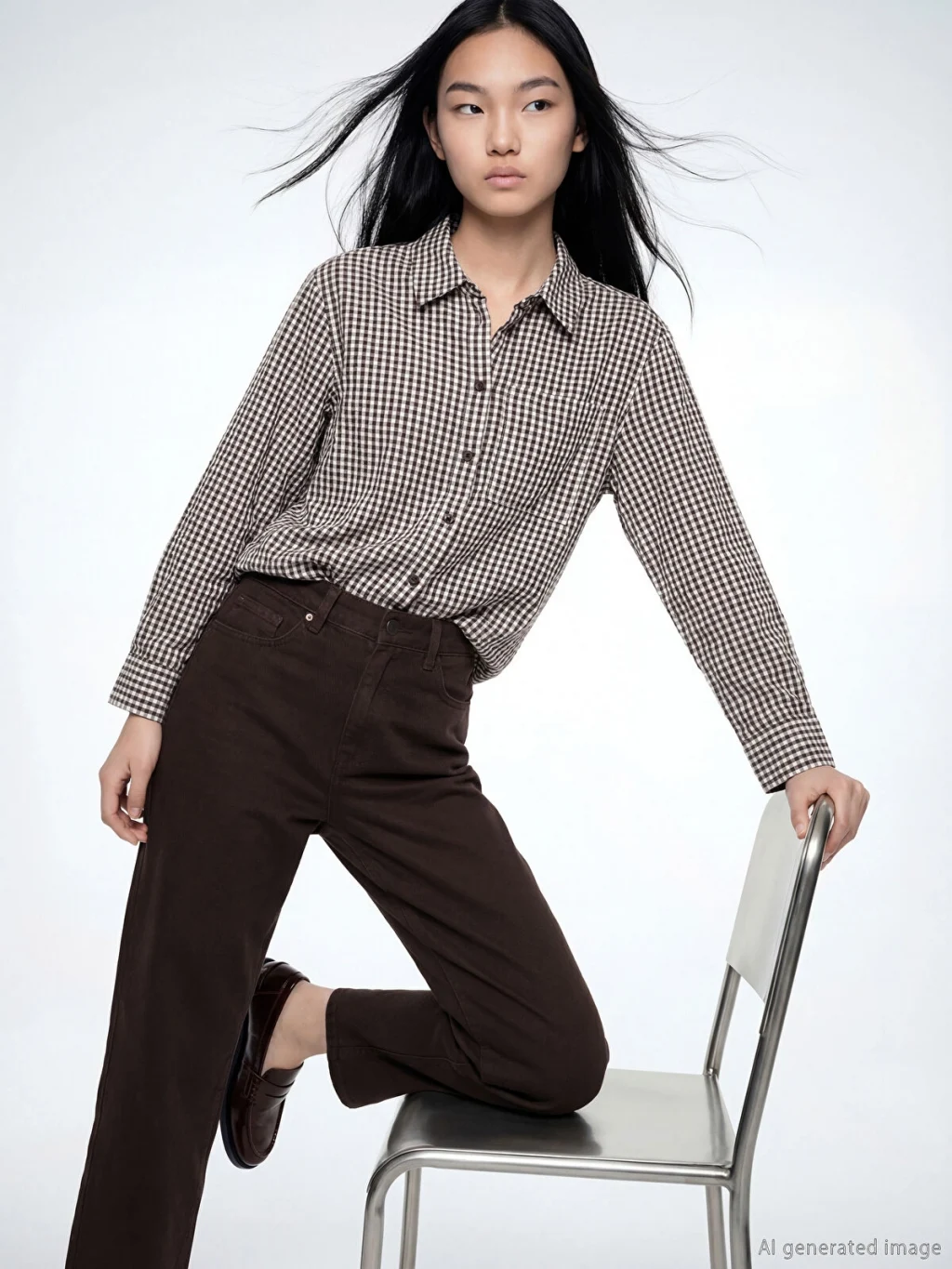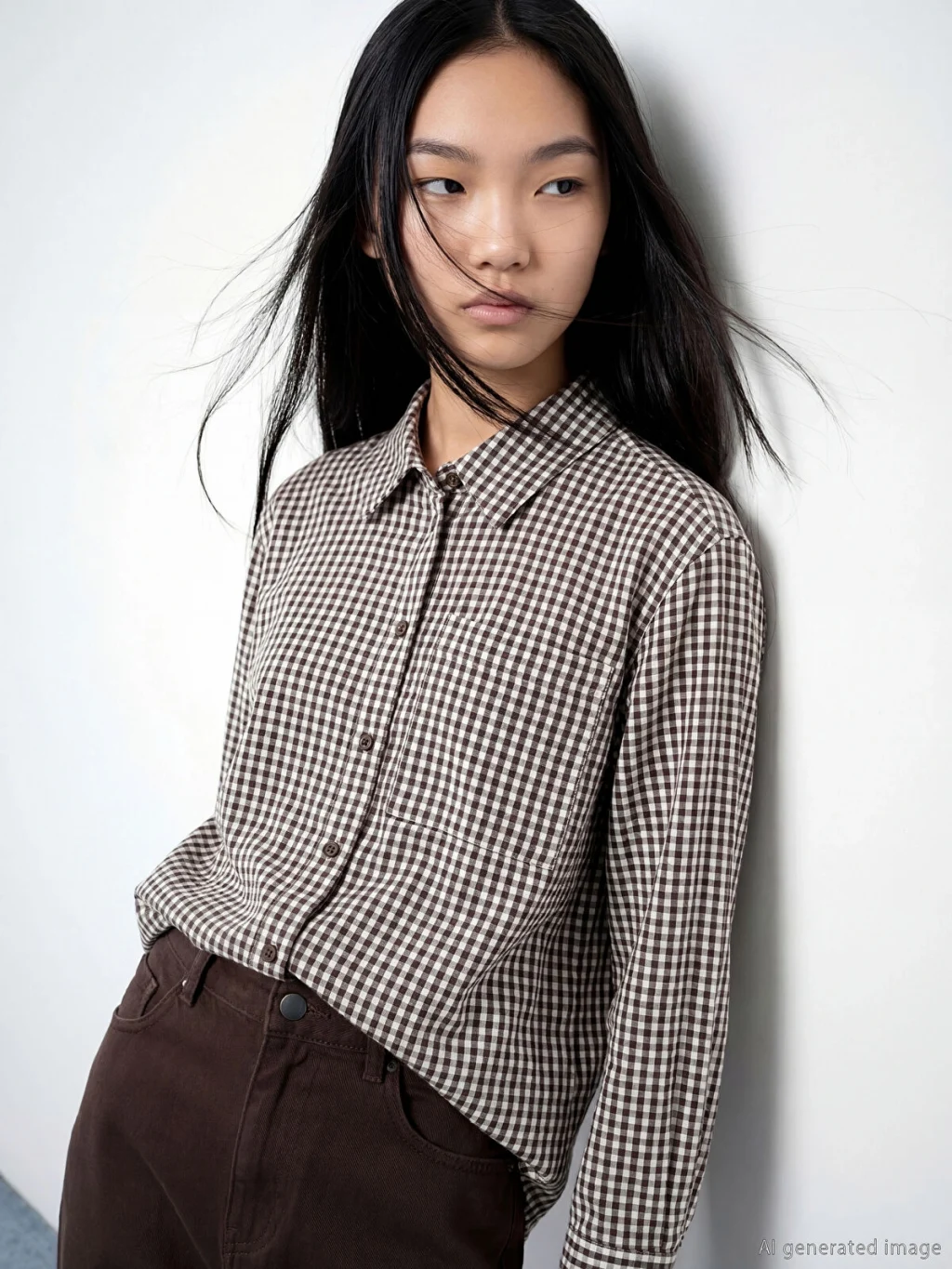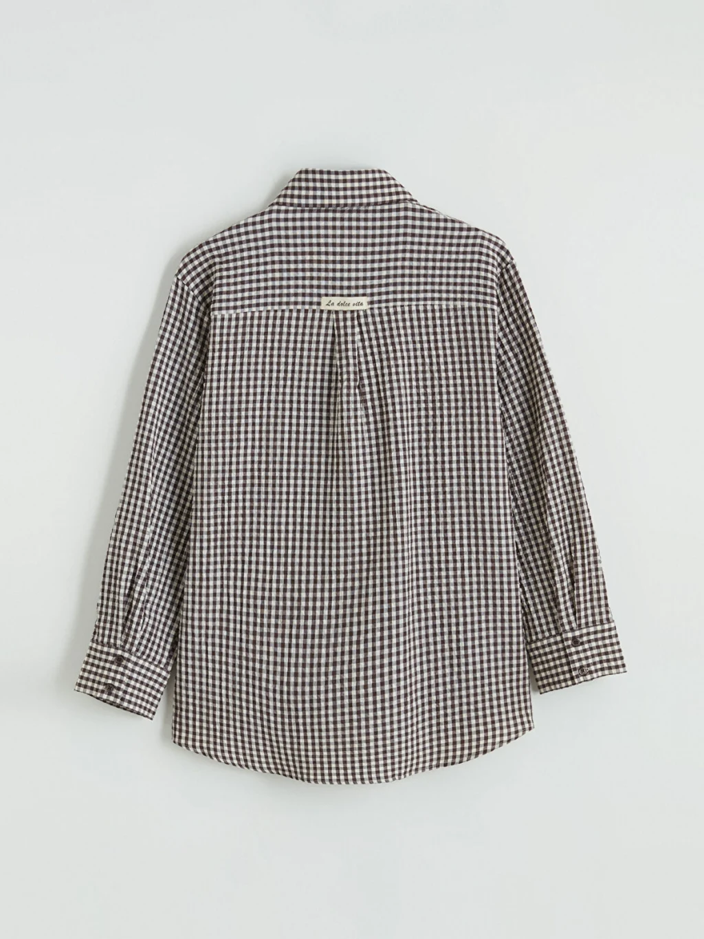 Uzun kollu ve kareli desenli kadın gömlek tunik, tek cepli tasarıma sahip olup önden düğme kapamalıdır.