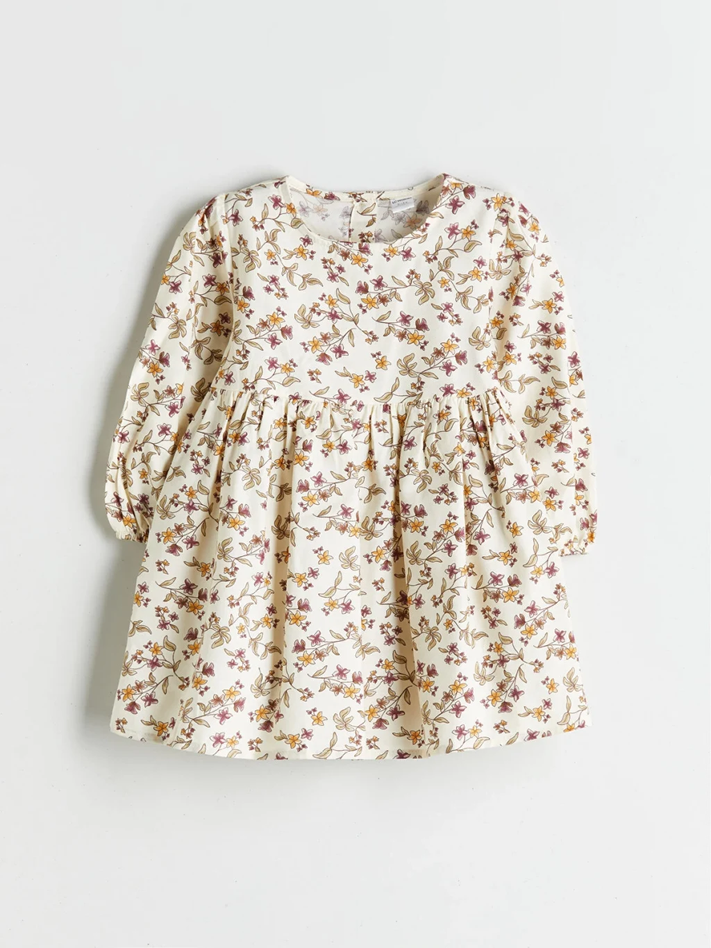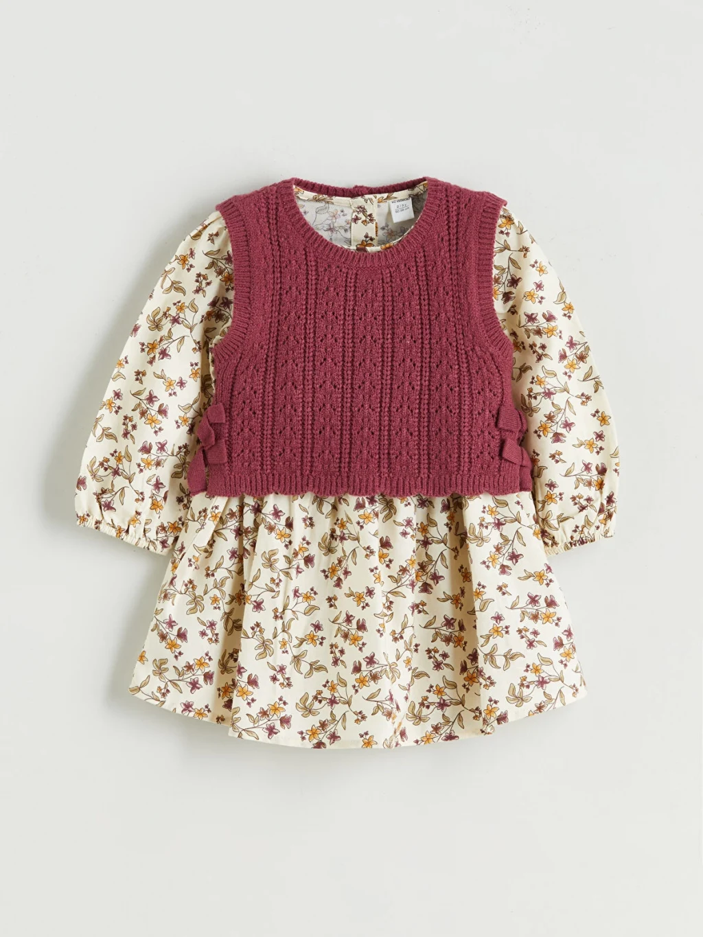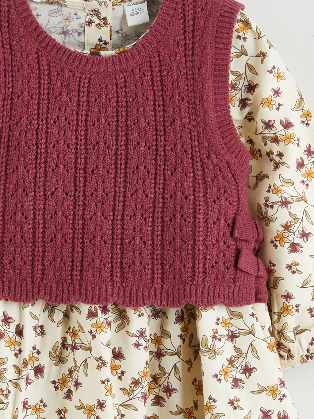 Çiçek desenli, uzun kollu kız çocuk elbise, bisiklet yakalıdır. Enseden düğme kapamalıdır ve üzerinde triko hırka bulunur.