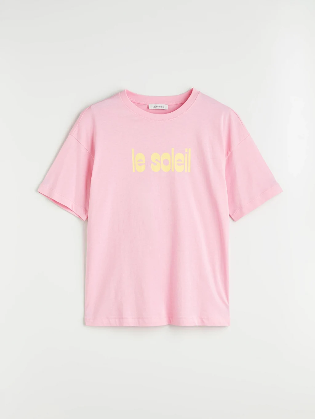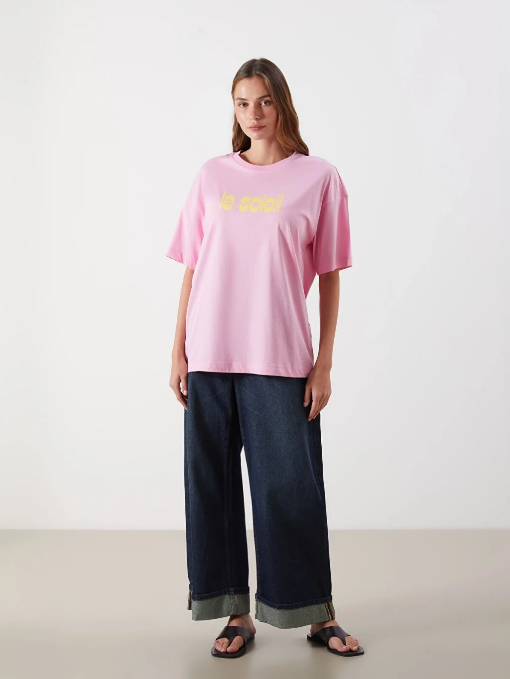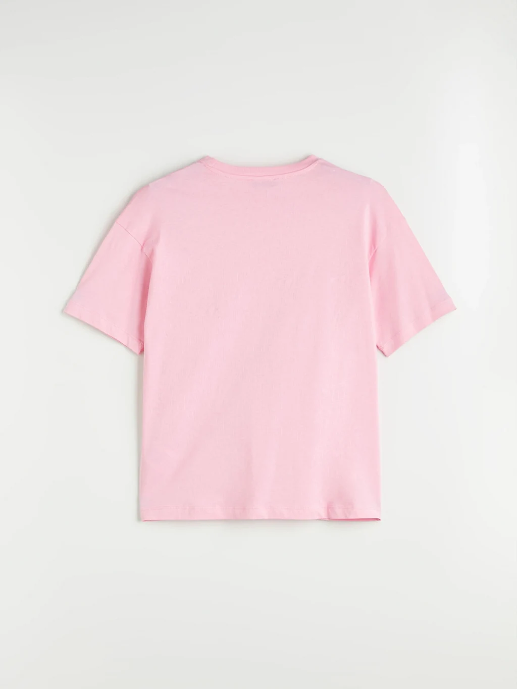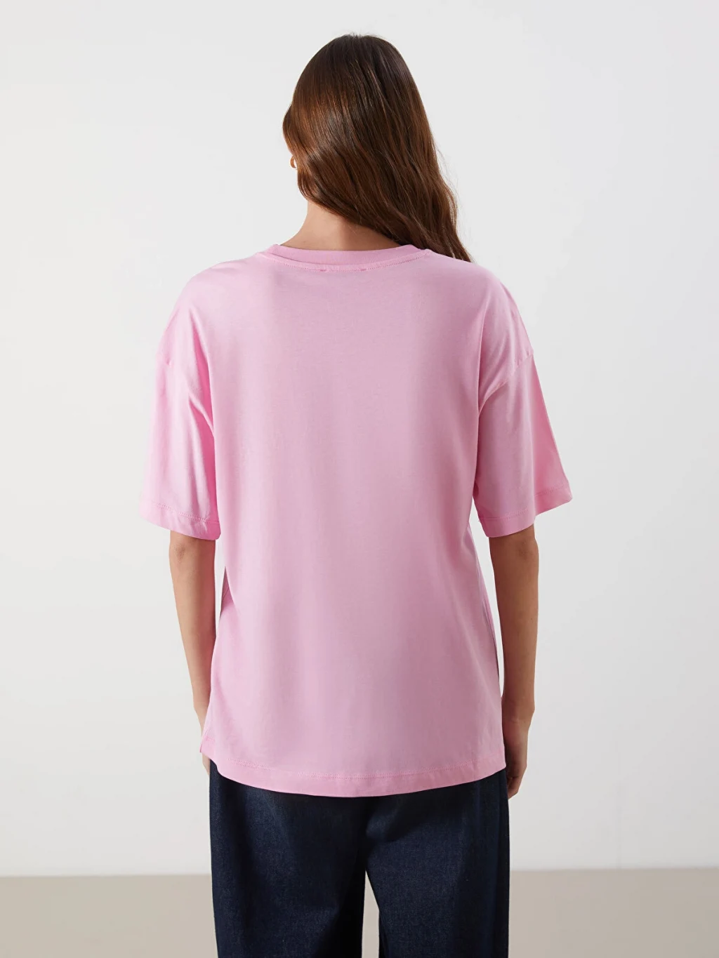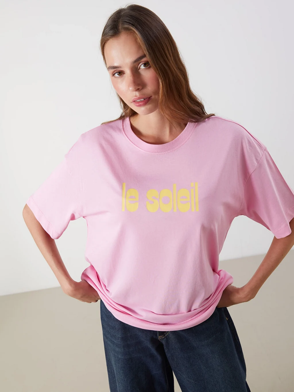 Bisiklet yaka, kısa kollu kadın tişört, oversize kalıplıdır. %100 pamuklu penye kumaştan üretilmiştir ve önü baskılıdır.