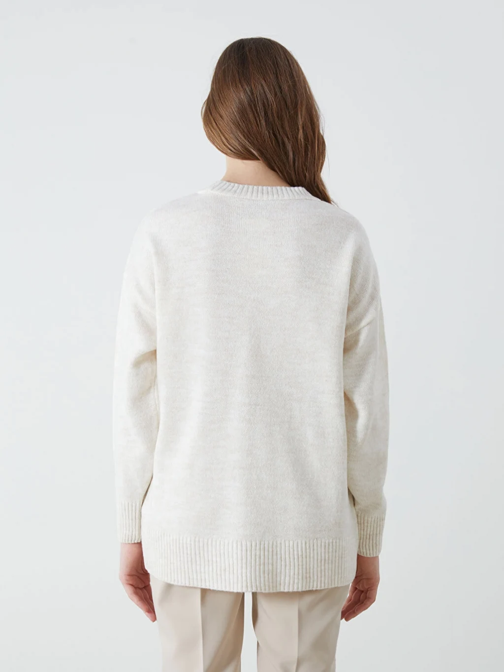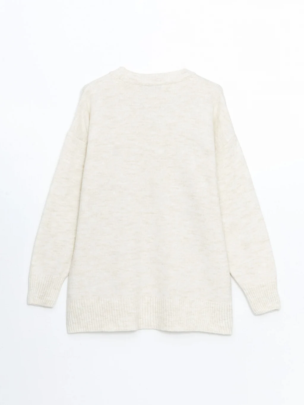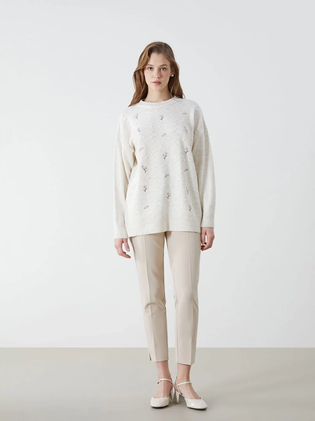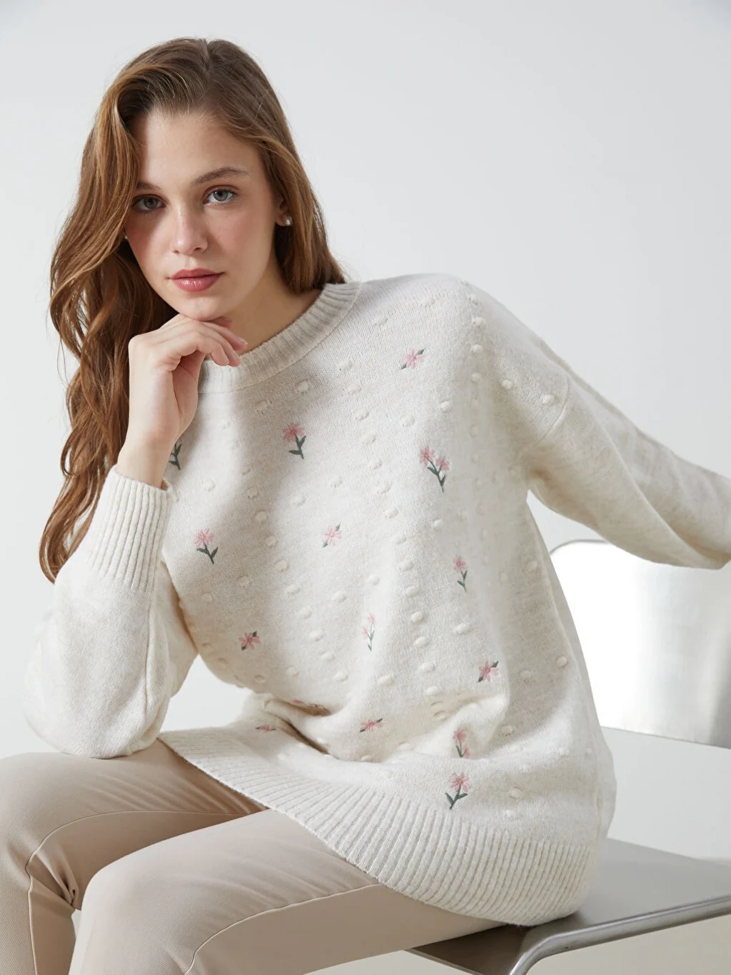 Uzun kollu kadın triko tunik, çiçek nakışları ile dikkat çekiyor. Soğuk günlerde sıcaklığı ve şıklığı bir arada sunan bu tunik, gardırobunuzun vazgeçilmez parçası olacak.