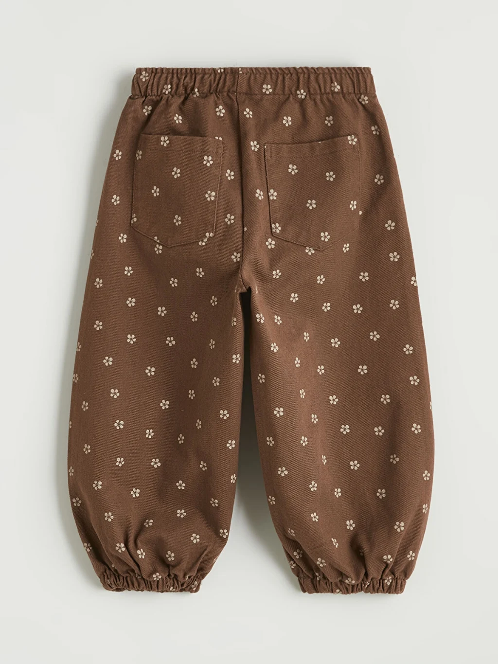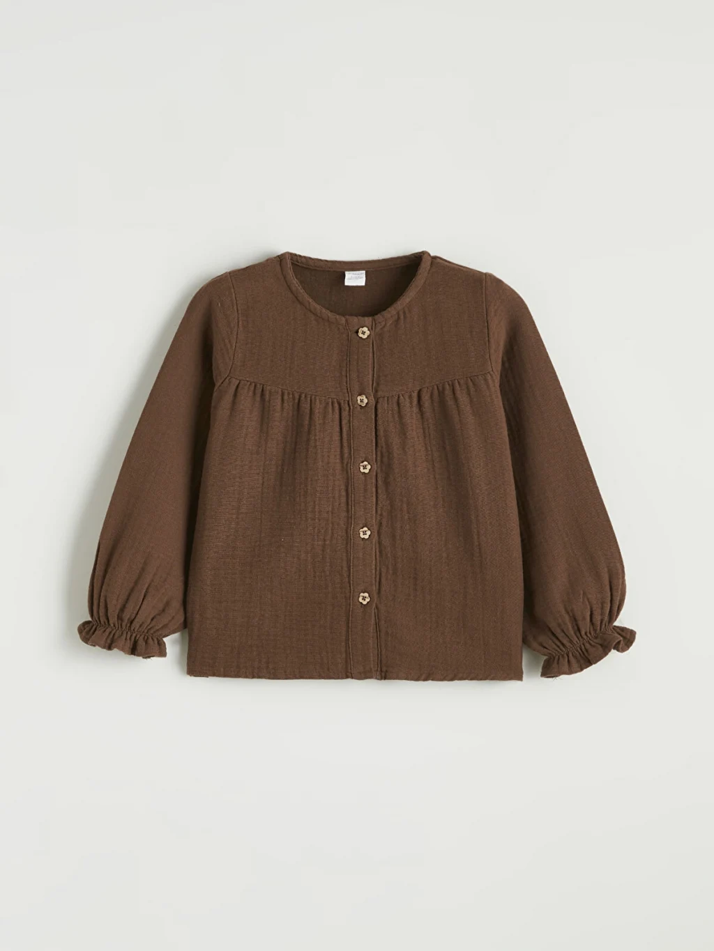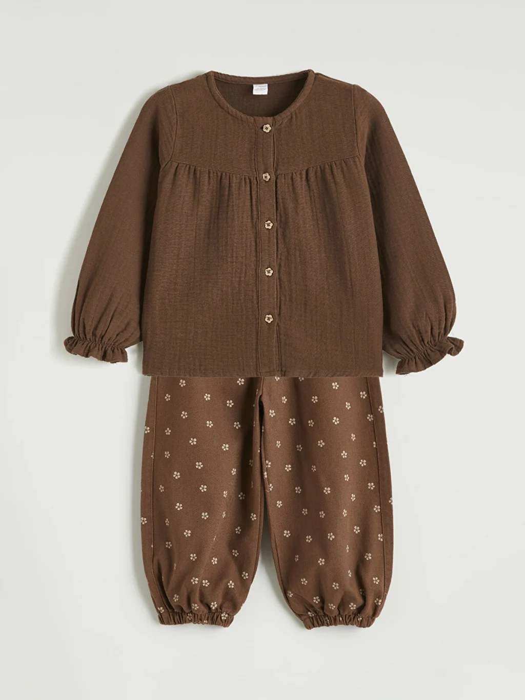 Kolları büzgülü ve düğme kapamalı bluz ile çiçekli jogger pantolondan oluşan kız çocuk takım, %100 pamuklu müslin kumaştan üretilmiştir.