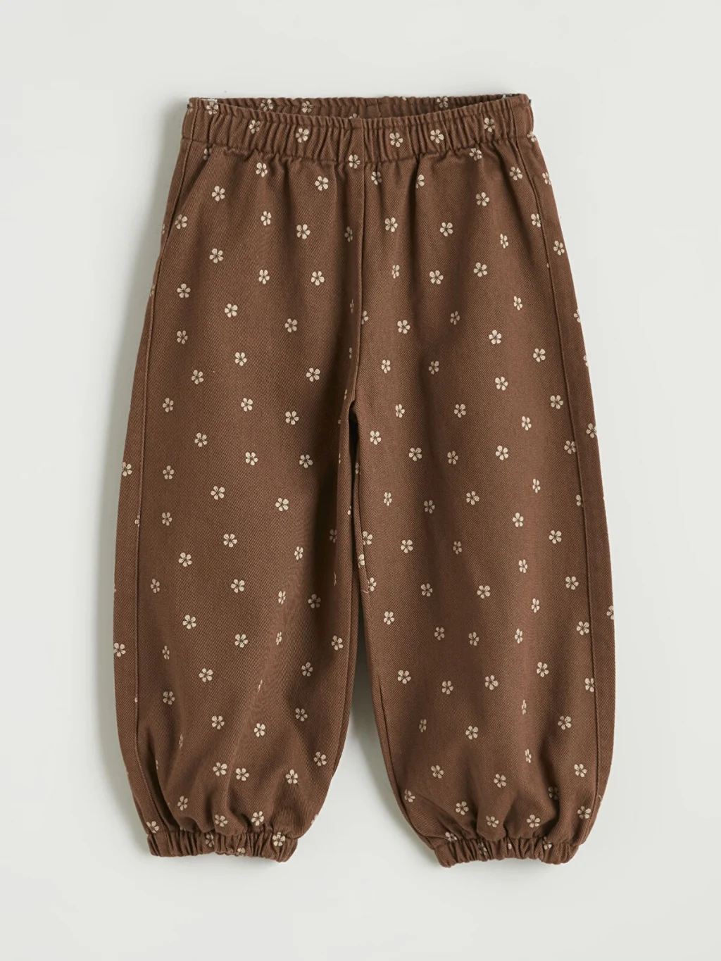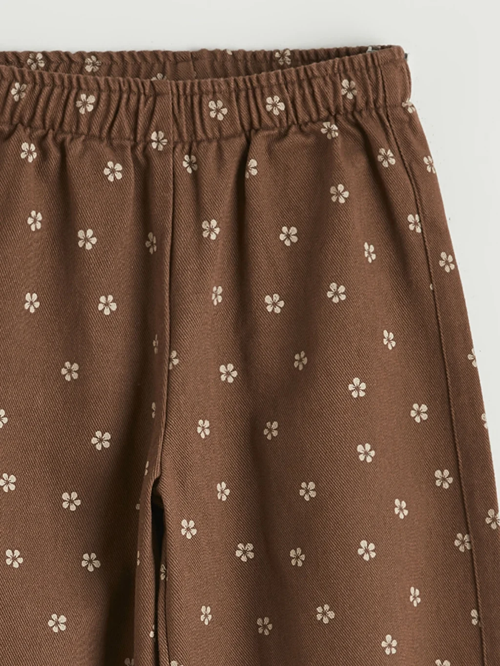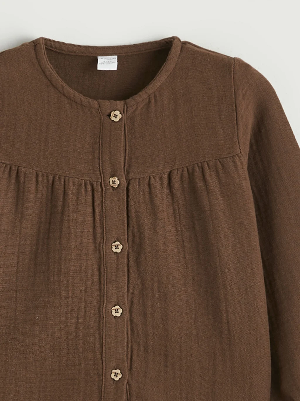 Kolları büzgülü ve düğme kapamalı bluz ile çiçekli jogger pantolondan oluşan kız çocuk takım, %100 pamuklu müslin kumaştan üretilmiştir.