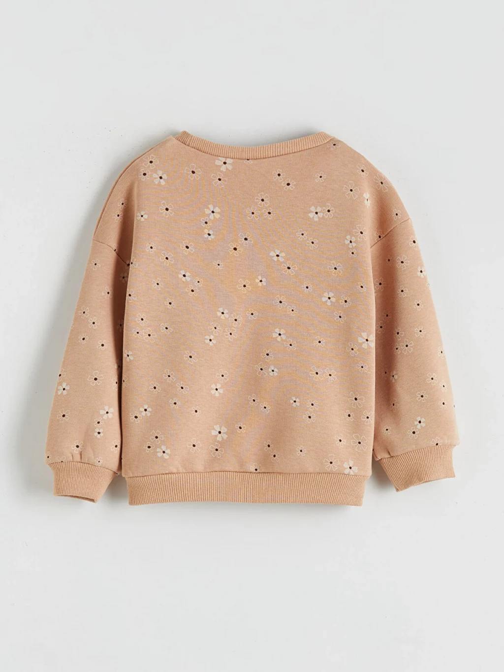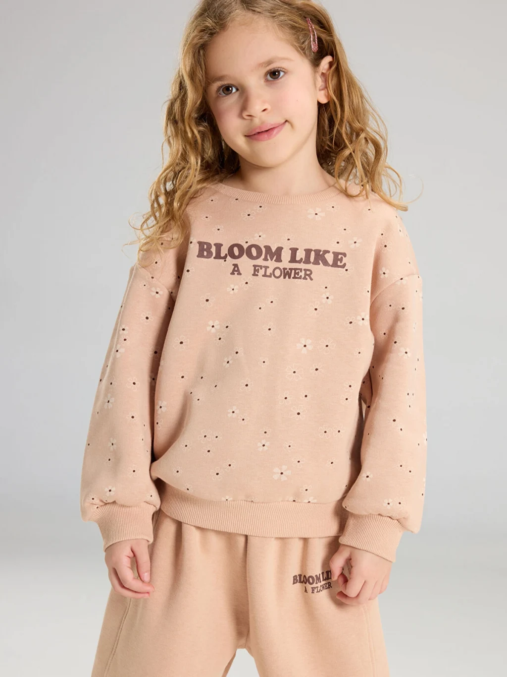 Yüksek pamuk içerikli 3 iplik şardonlu kumaşlı kız çocuk takım, bisiklet yaka, çiçek desenli sweatshirt ve paçaları lastikli eşofman alttan oluşur.