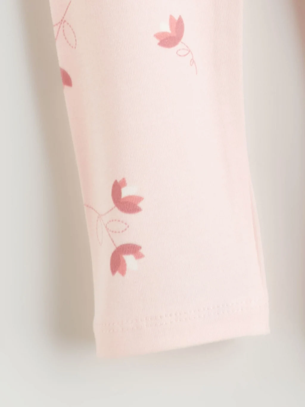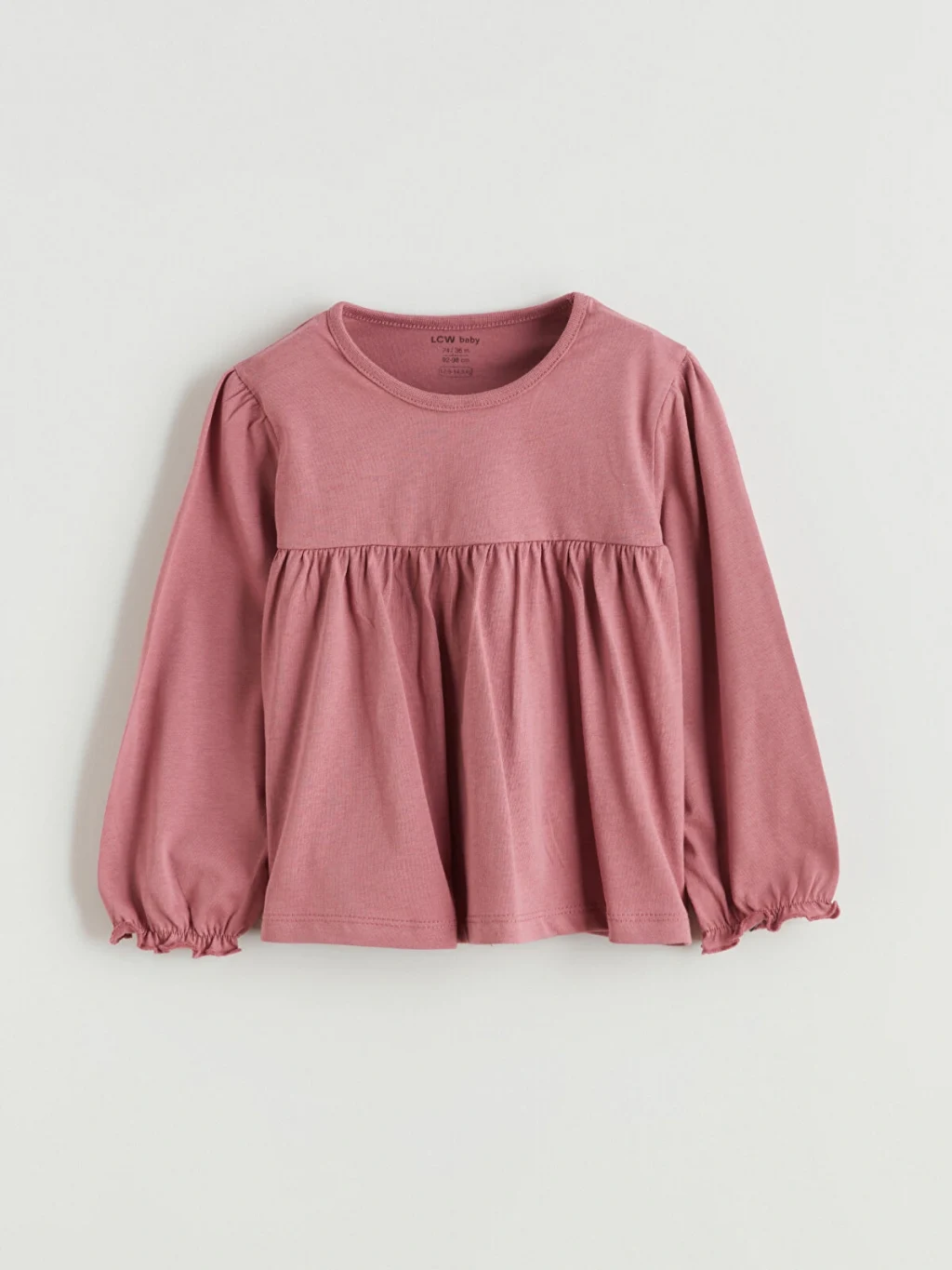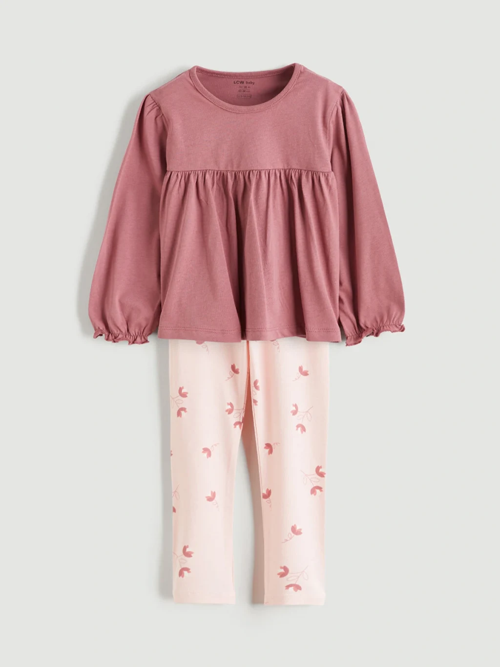 Kız bebek takım, bisiklet yaka, uzun kollu, belden büzgülü ve kol ucu lastikli bluz ile desenli tayttan oluşur.