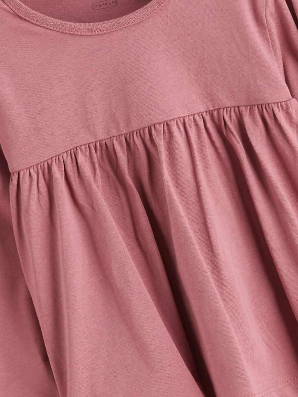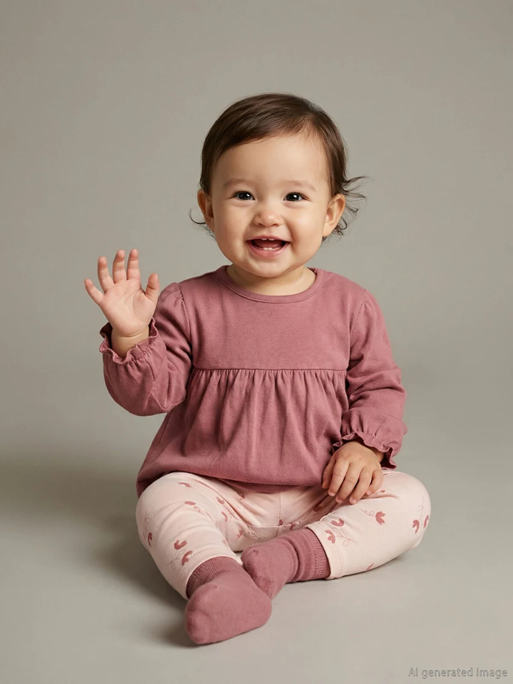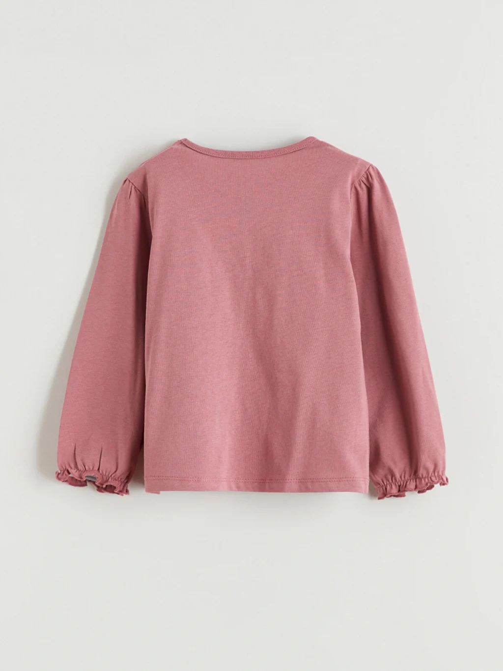 Kız bebek takım, bisiklet yaka, uzun kollu, belden büzgülü ve kol ucu lastikli bluz ile desenli tayttan oluşur.