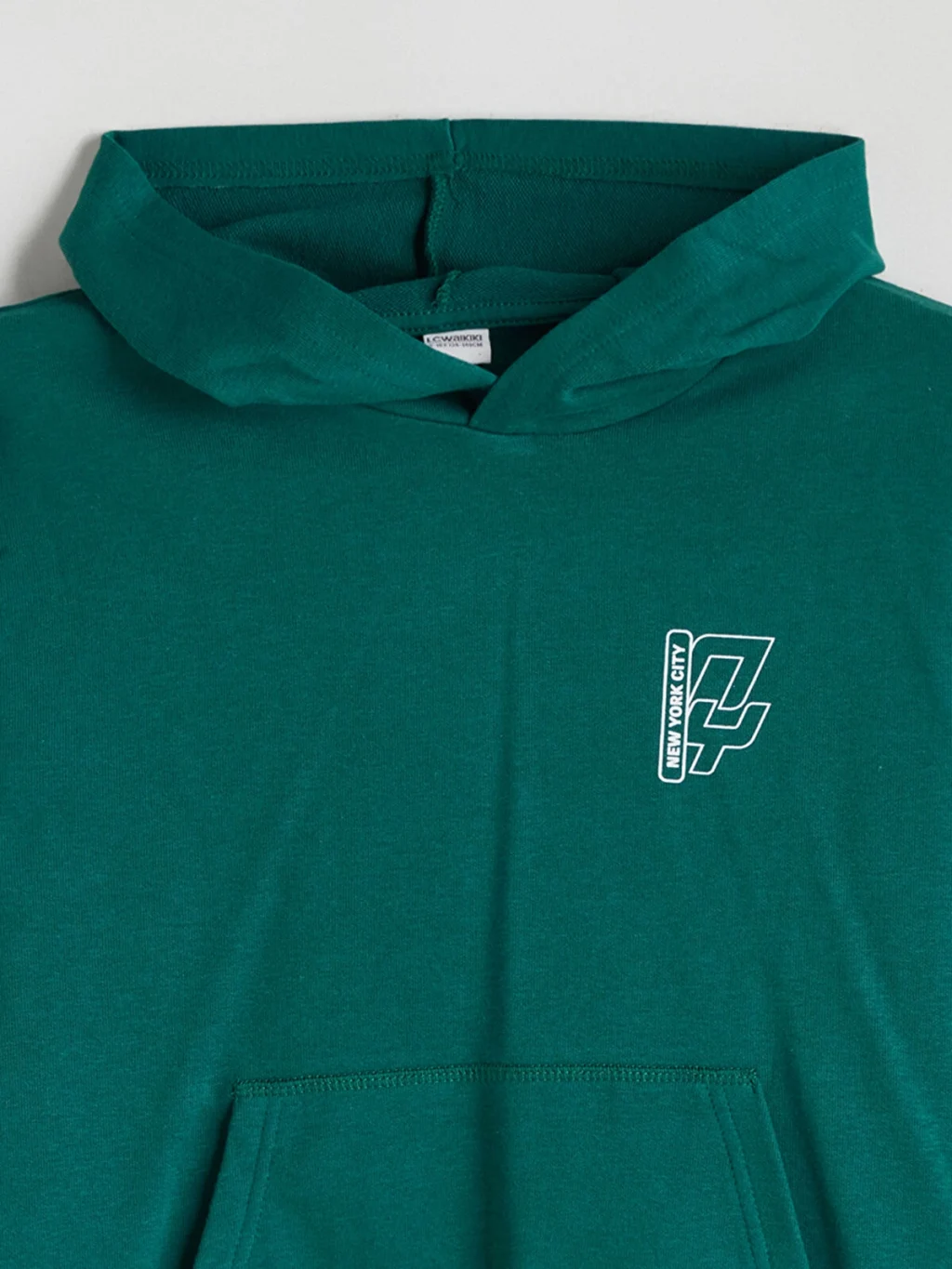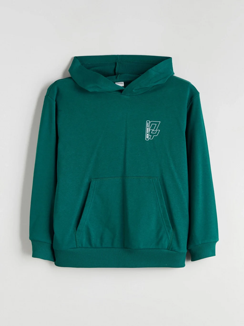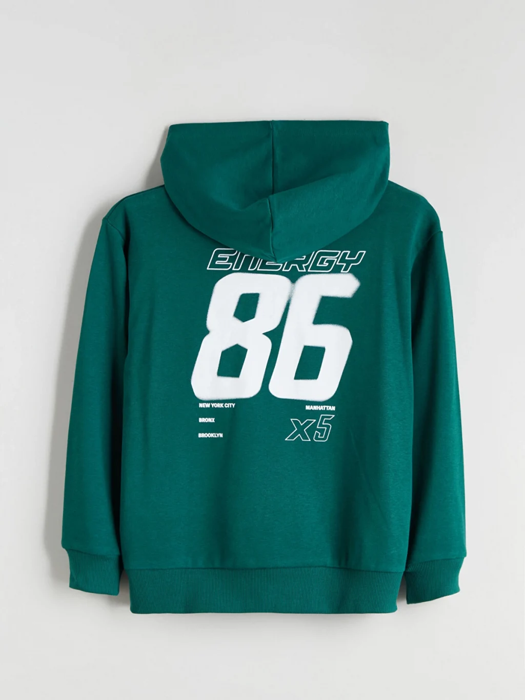 Orta kalınlıkta 3 iplik kumaştan üretilen erkek çocuk sweatshirt, kapüşonlu ve uzun kolludur. Sırtı baskılı, kol ve etek ucu ribanalıdır.