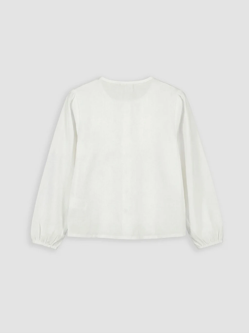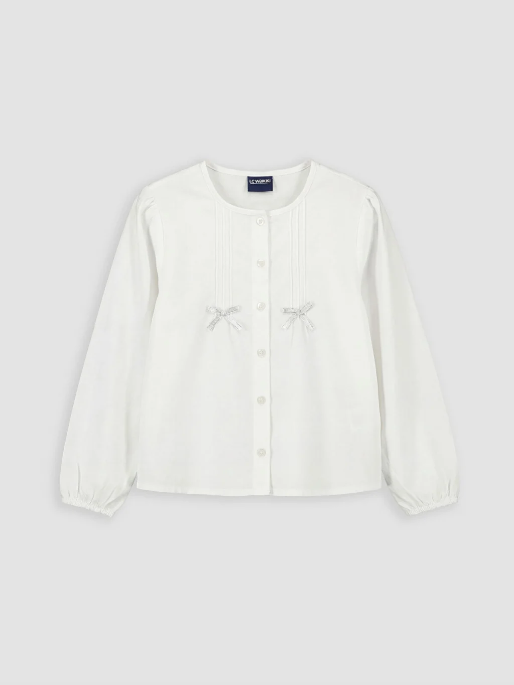 Kız çocuk gömlek, %100 pamuk poplin kumaştan üretilmiştir. Bisiklet yaka, uzun kollu ve önden düğme kapamalıdır. Fiyonk ve nervür detaylıdır.