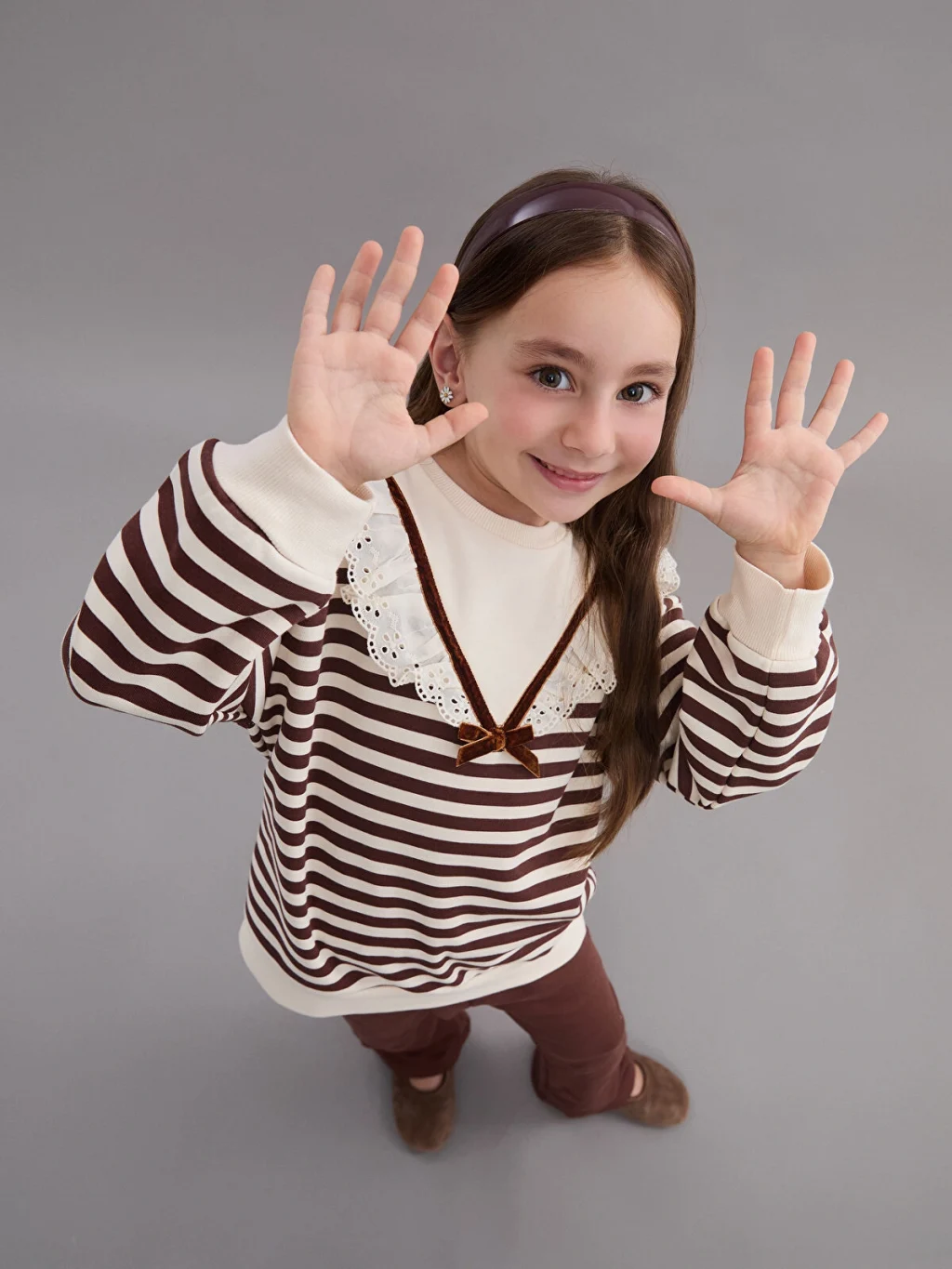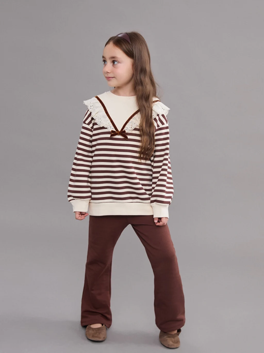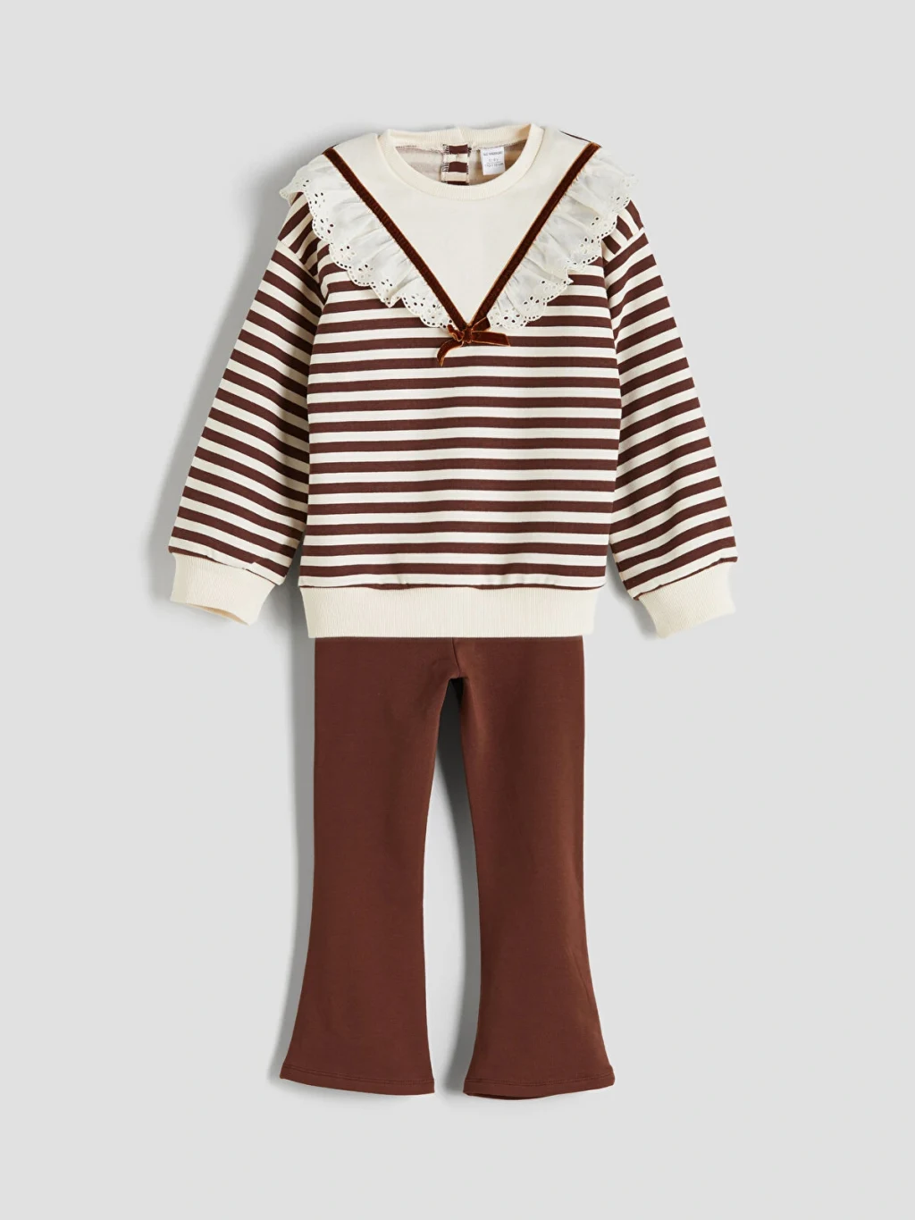 Yüksek pamuk içerikli 3 iplik şardonlu kız çocuk takım. Çizgili, bisiklet yaka, fırfır ve fiyonk detaylı sweatshirt ve ispanyol paça tayttan oluşur.