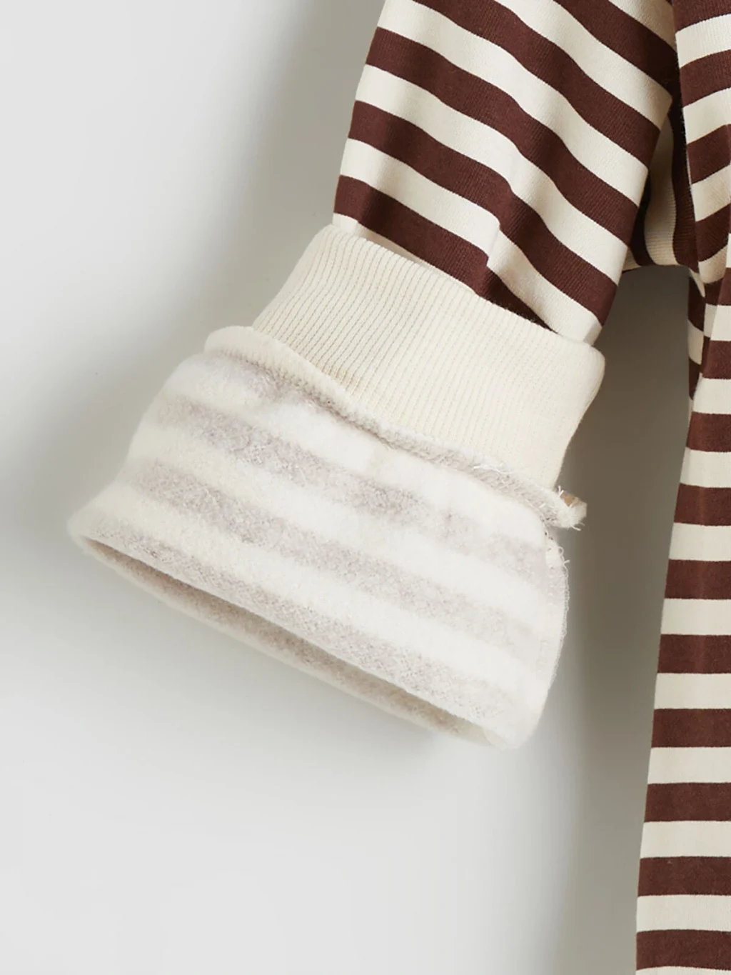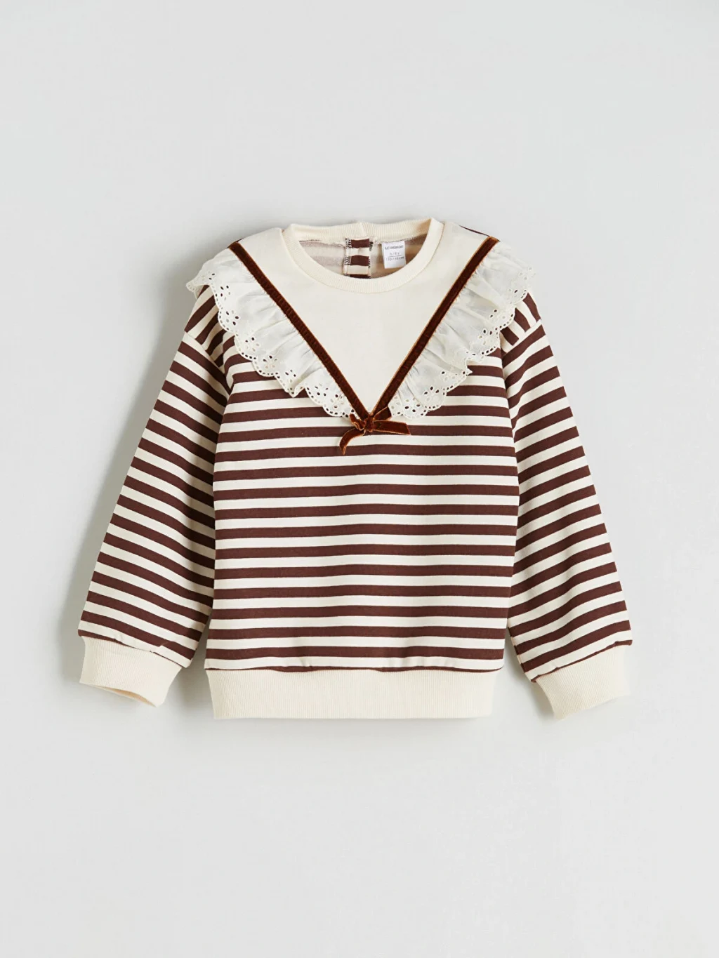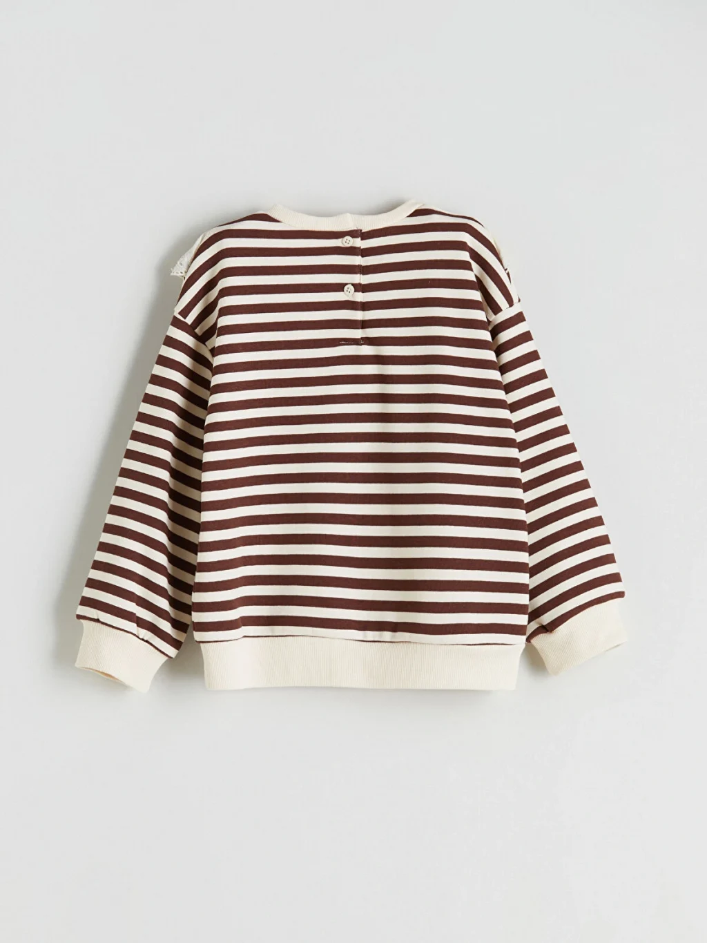 Yüksek pamuk içerikli 3 iplik şardonlu kız çocuk takım. Çizgili, bisiklet yaka, fırfır ve fiyonk detaylı sweatshirt ve ispanyol paça tayttan oluşur.
