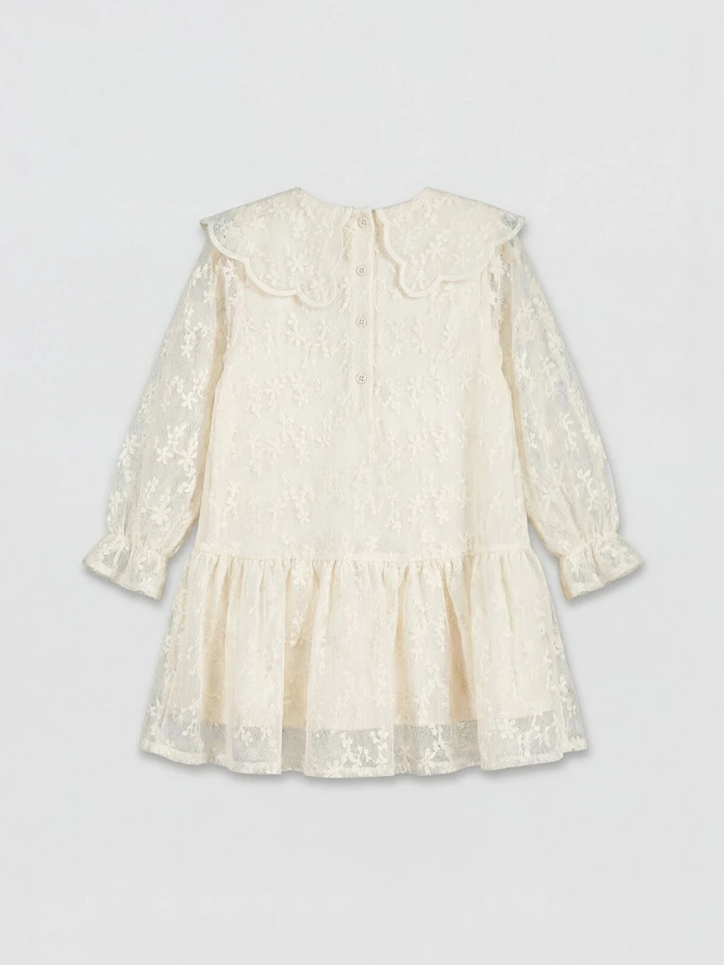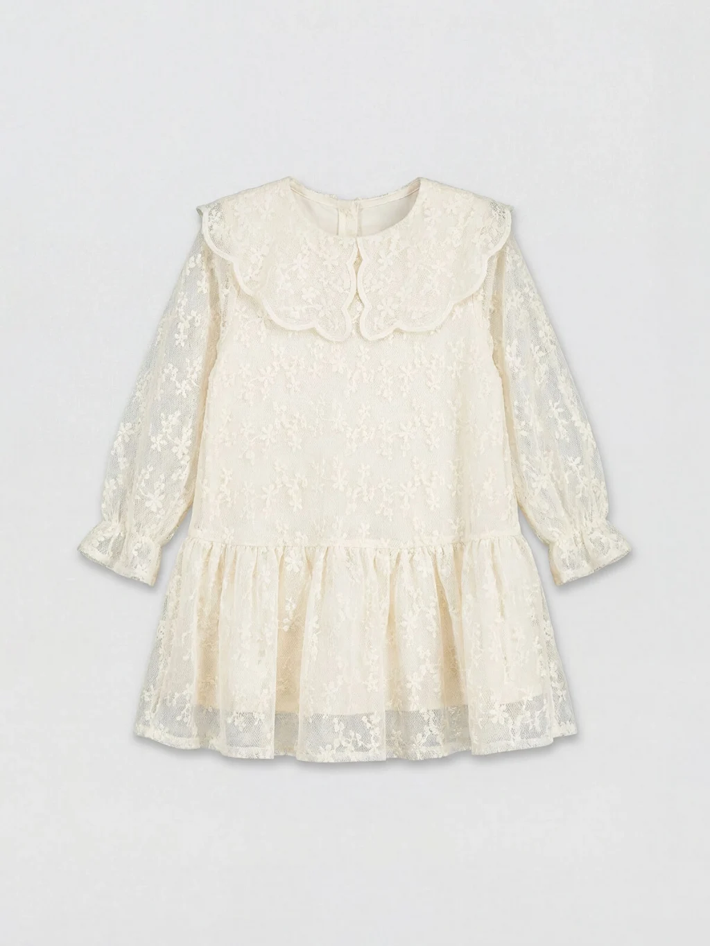 Bebe yakalı ve uzun kollu kız çocuk elbise, nakışlı dantel kumaştan üretilmiştir. %100 pamuk astarlıdır ve sırtı düğme kapamalıdır.