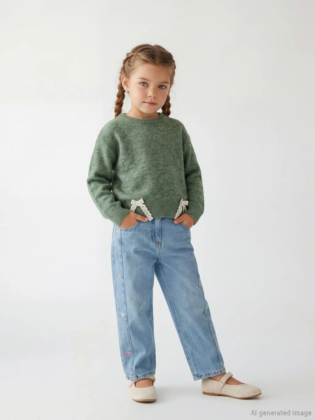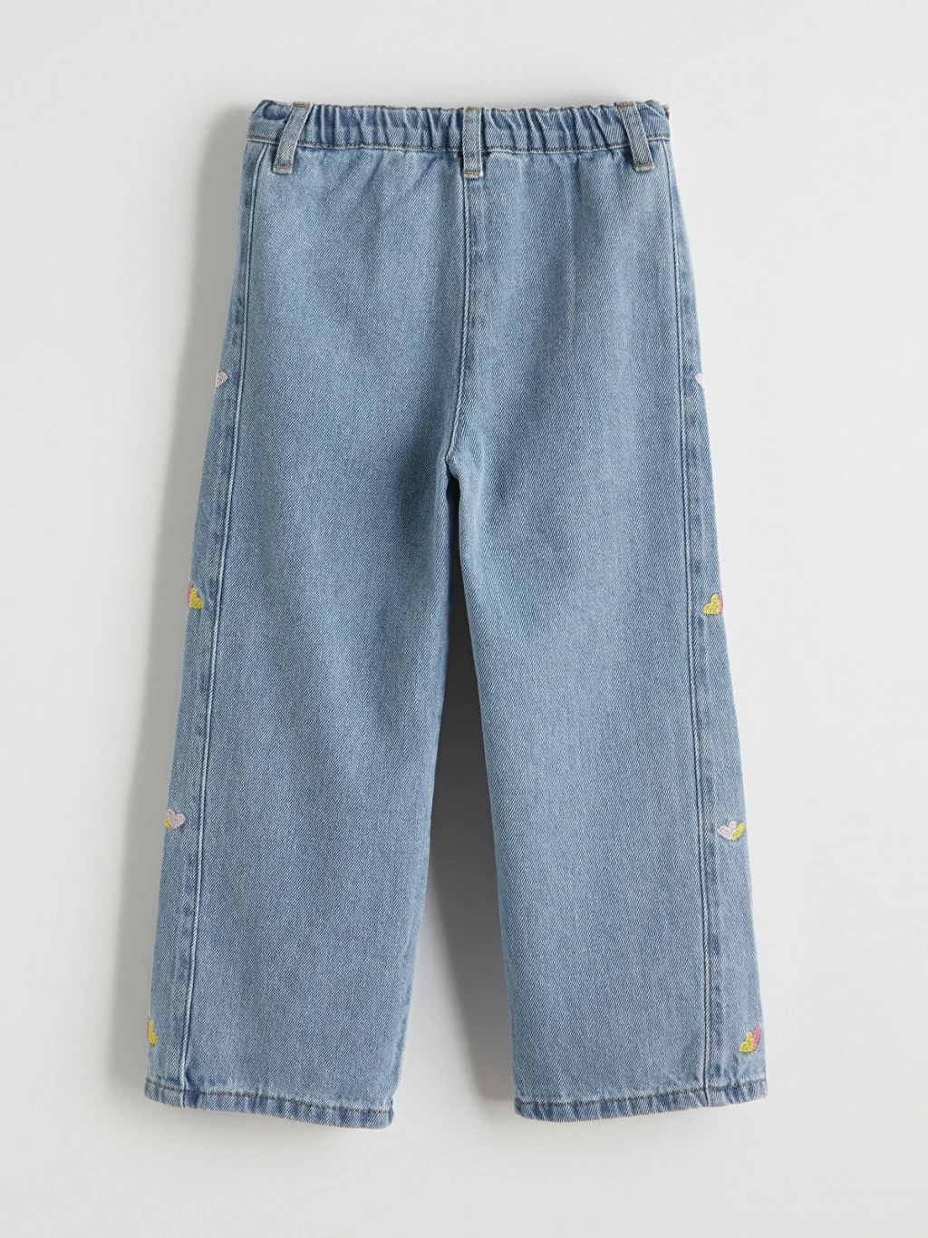 Kız çocuk jean pantolon, pamuklu kumaştan üretilmiştir. Standart kalıplıdır, beş cepli tasarıma sahiptir ve yanları nakışlıdır.