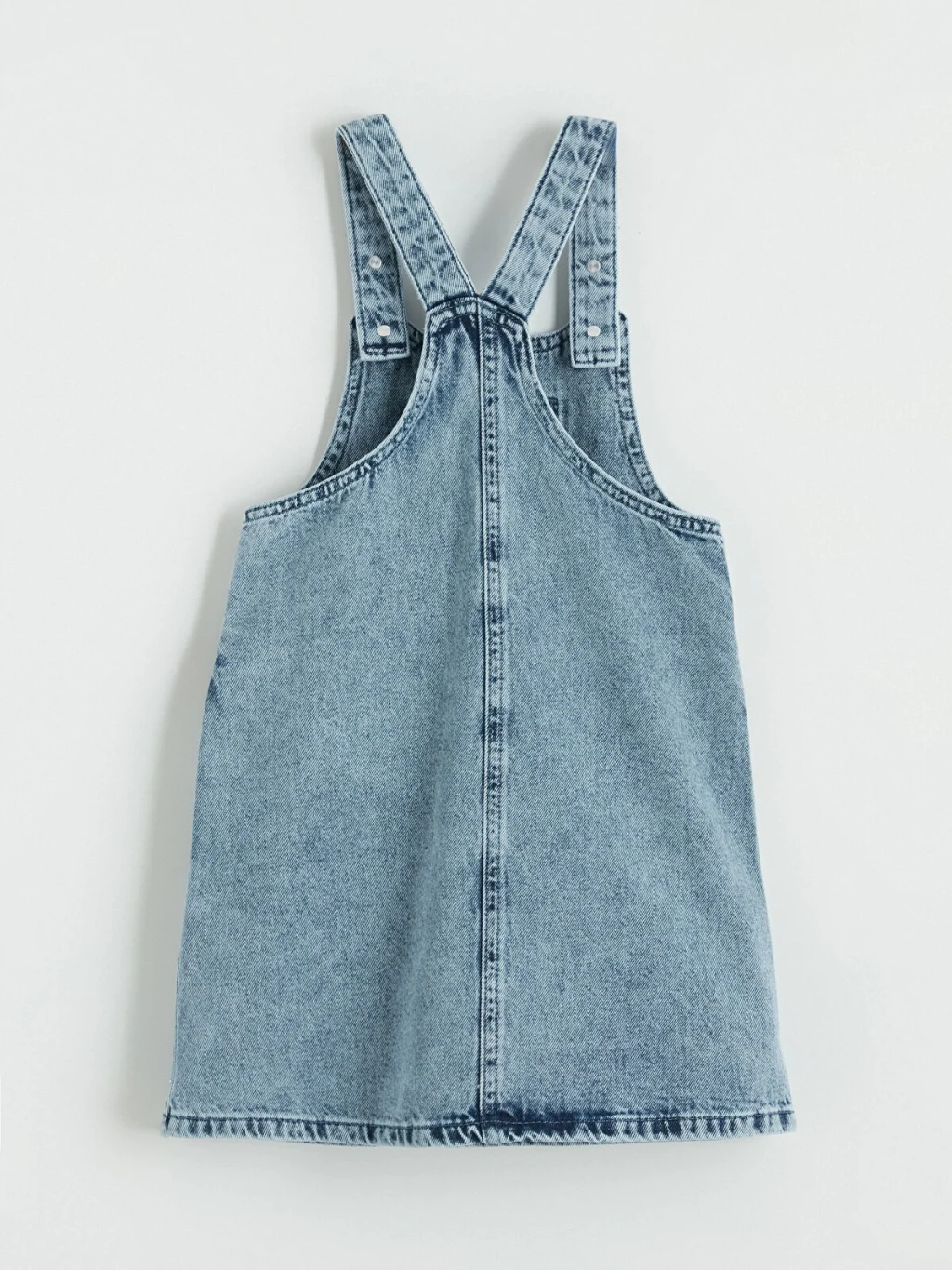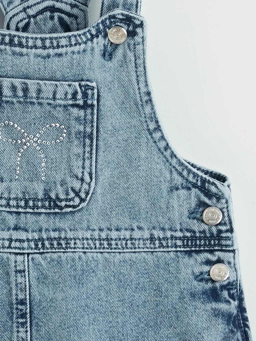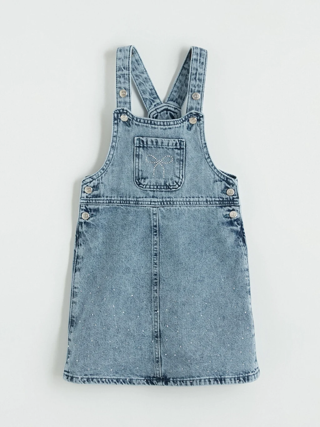 Taş işlemeli, ayarlanabilir askılı ve yandan düğme kapamalı kız çocuk salopet elbise, göğüs ceplidir ve %100 Pamuk kumaştan üretilmiştir.