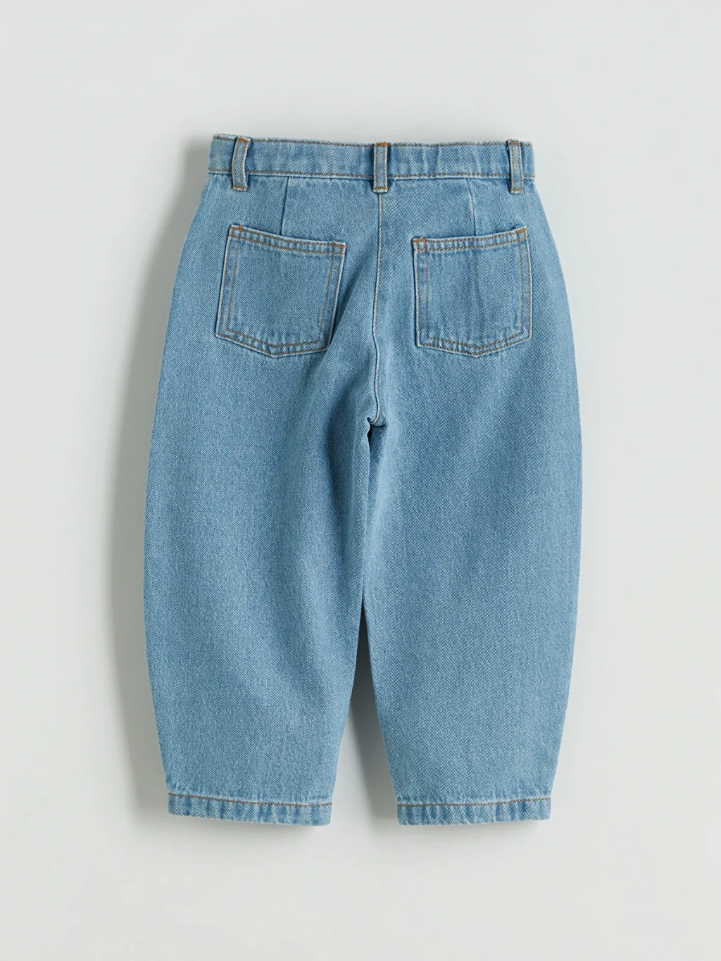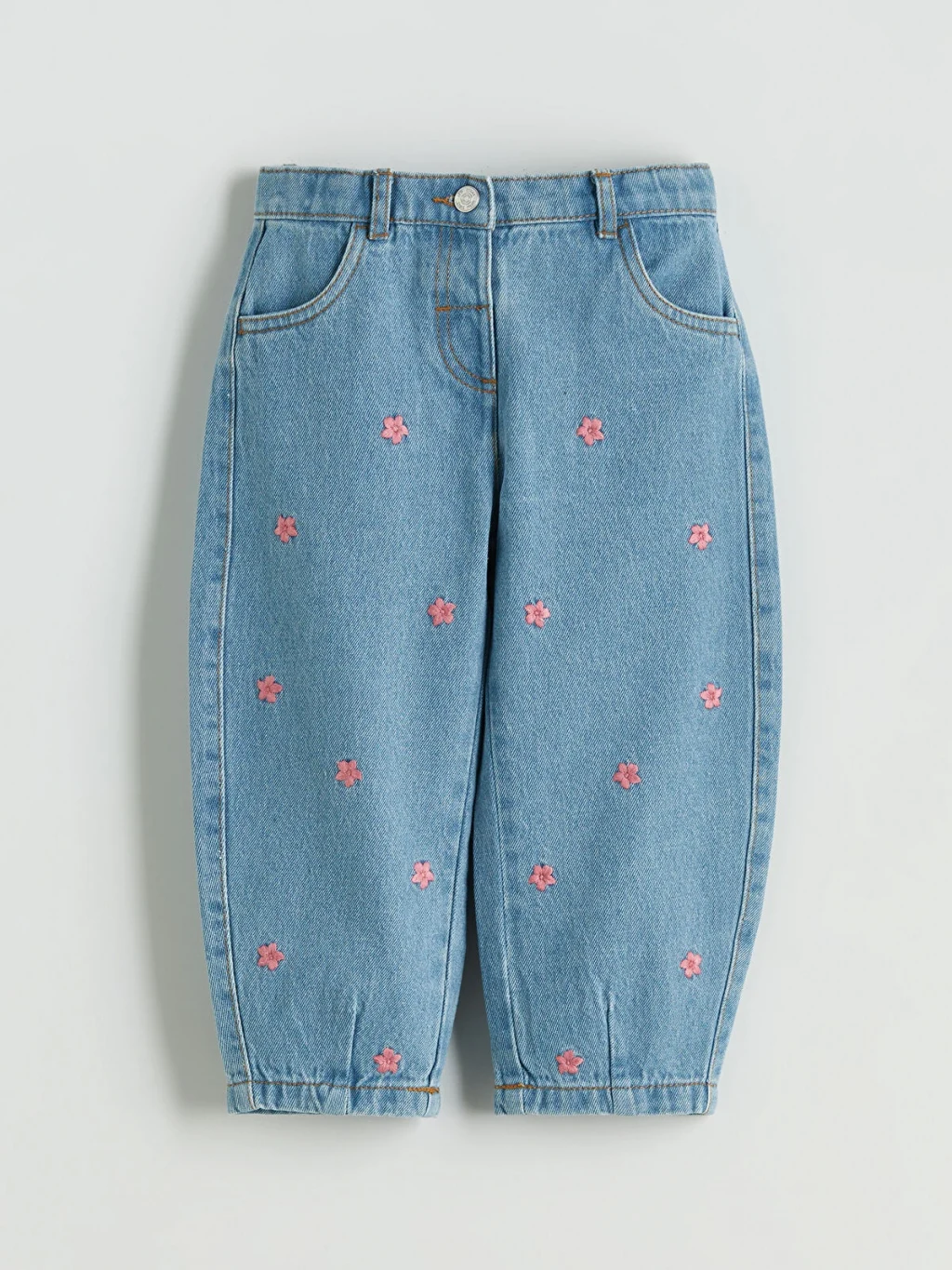 Beli ayarlanabilir lastikli ve çiçek nakışlı kız çocuk jean pantolon rahat kalıplıdır ve iki yandan cepli tasarıma sahiptir.