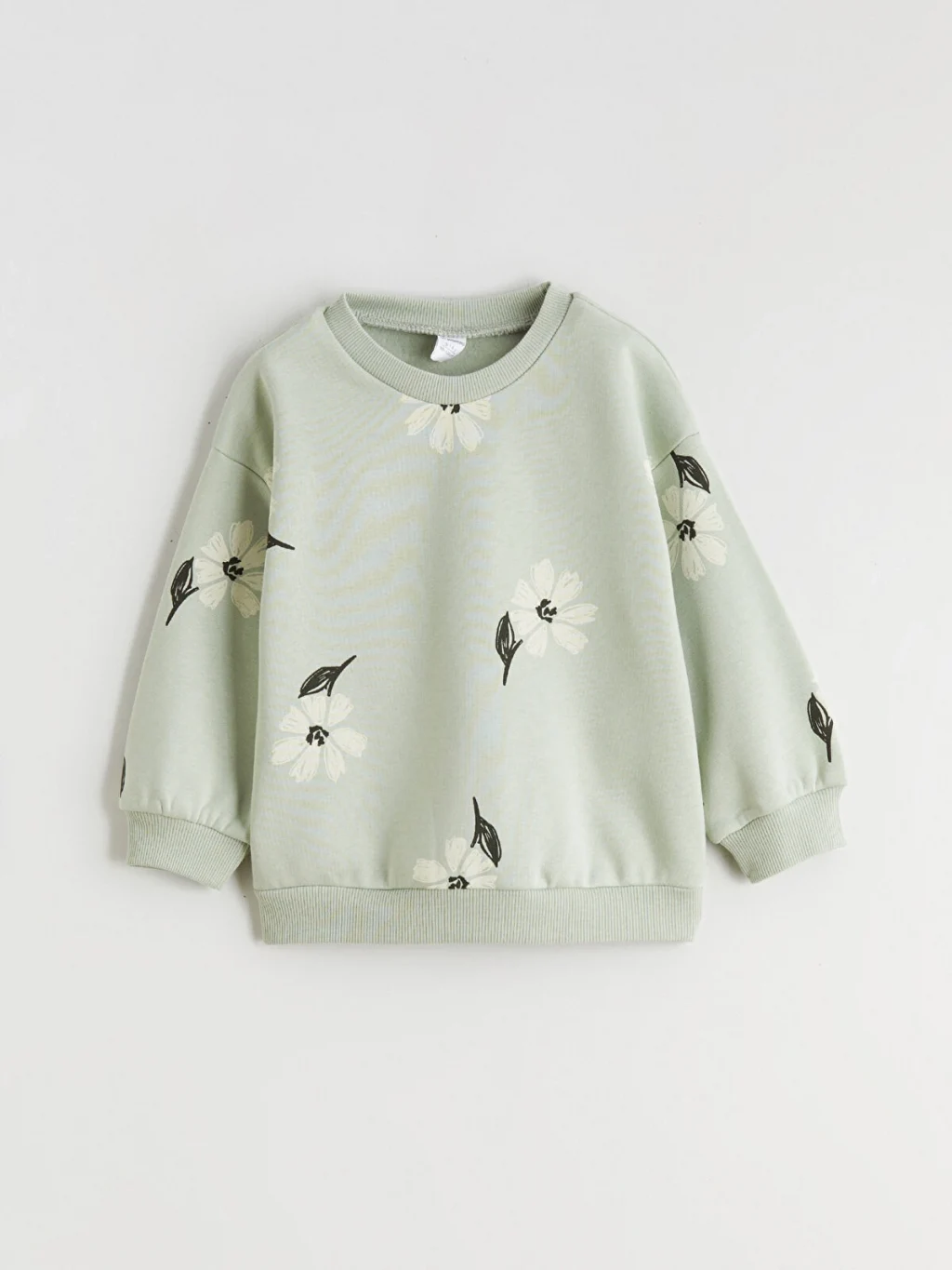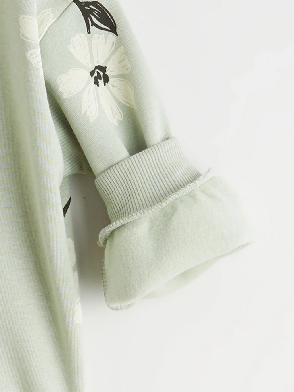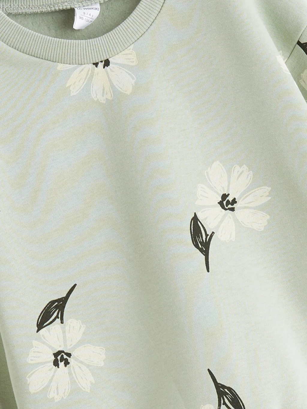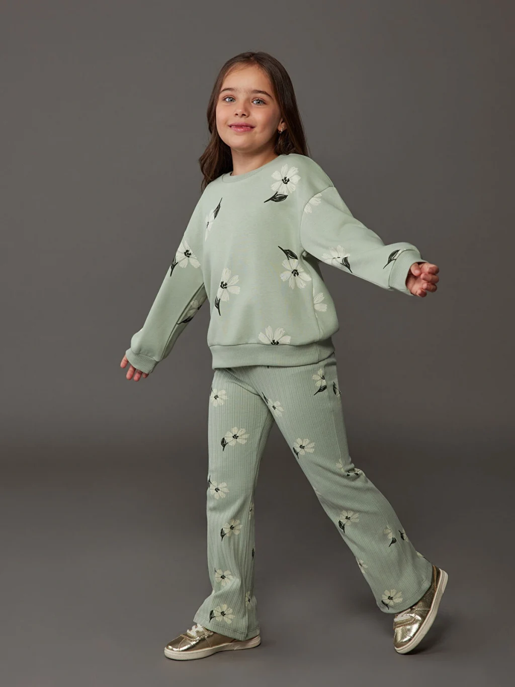 Çiçek desenli kız çocuk takım, bisiklet yaka, uzun kollu sweatshirt ve fitilli, ispanyol paça pantolondan oluşur. 3 iplik şardonlu kumaşa sahiptir.