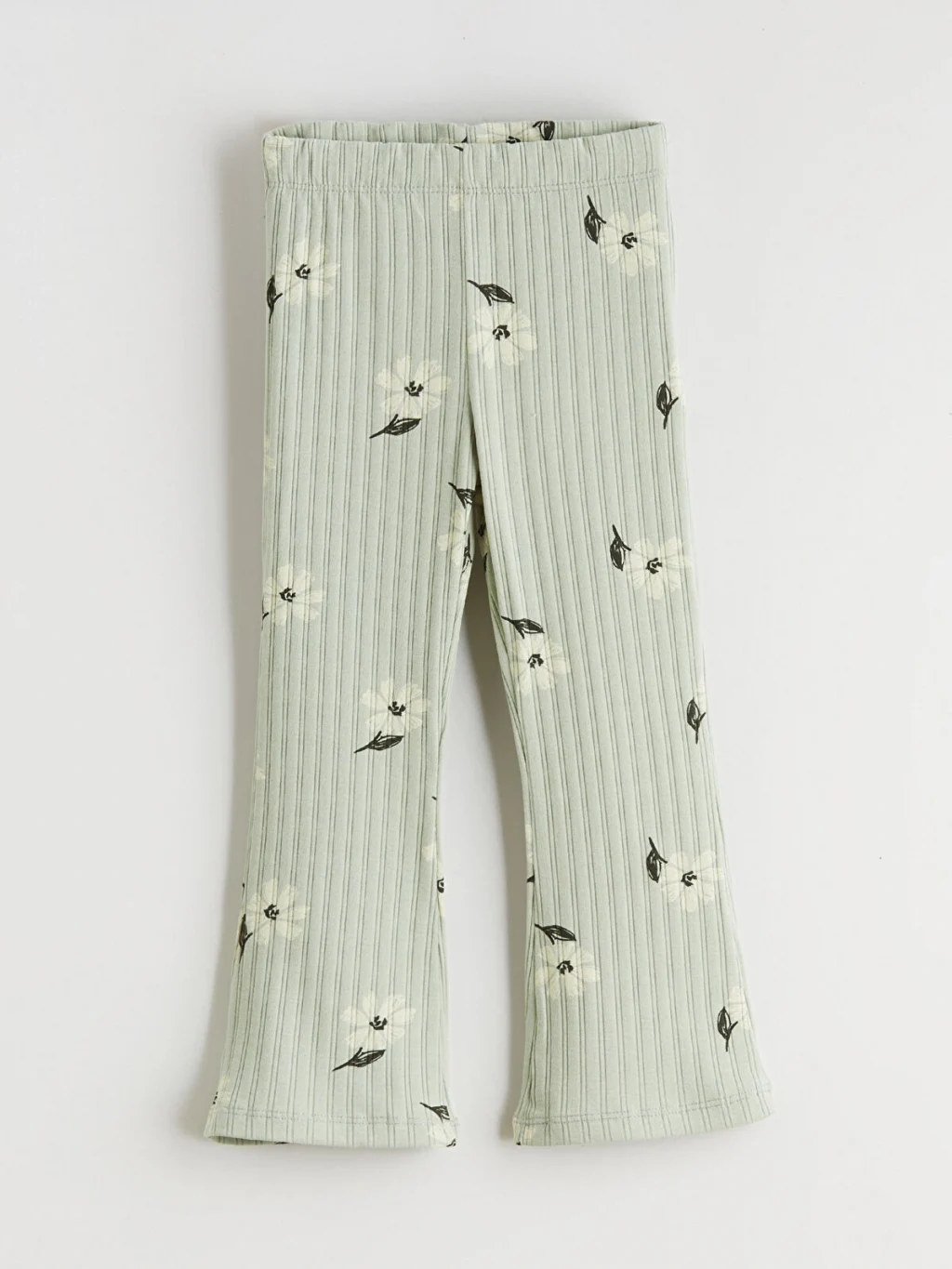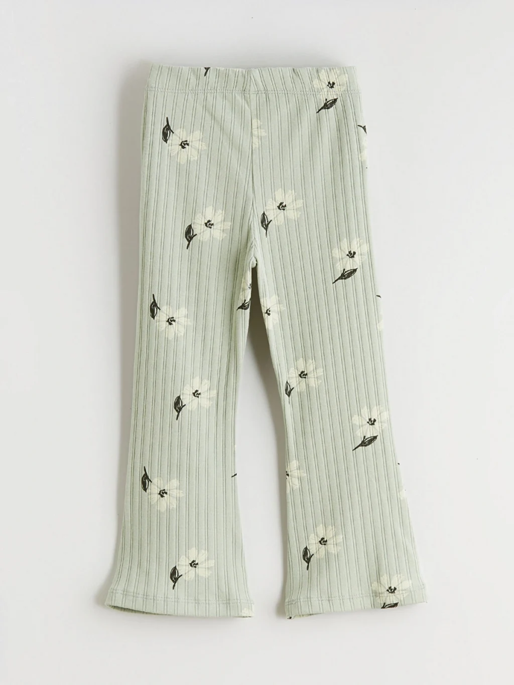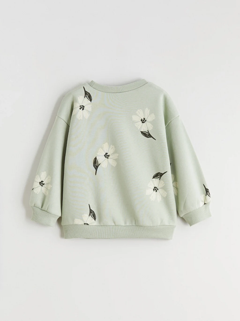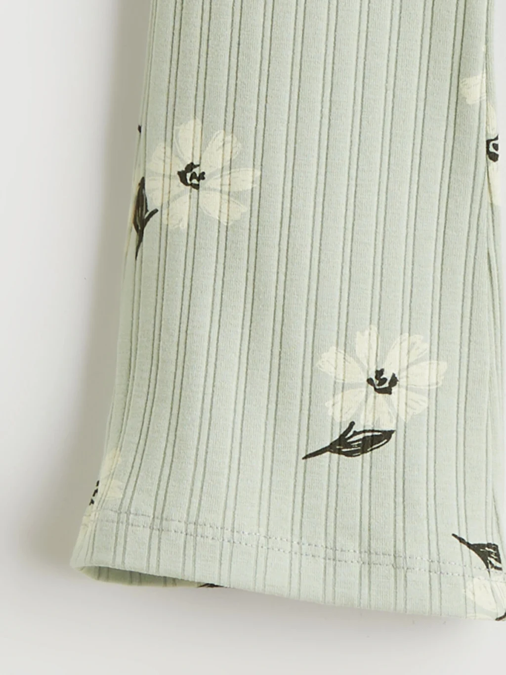 Çiçek desenli kız çocuk takım, bisiklet yaka, uzun kollu sweatshirt ve fitilli, ispanyol paça pantolondan oluşur. 3 iplik şardonlu kumaşa sahiptir.