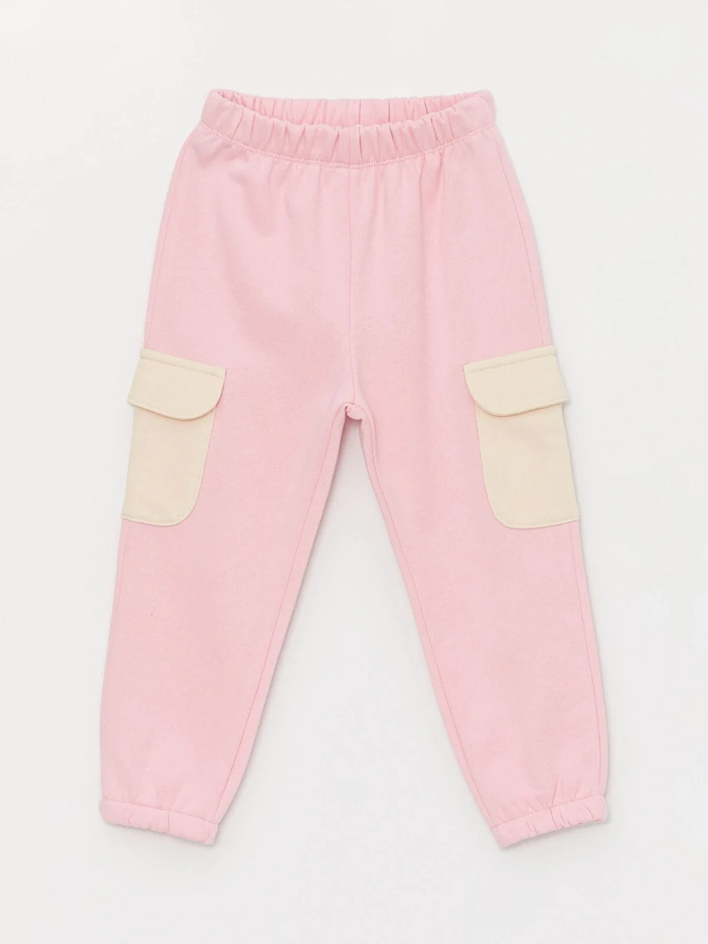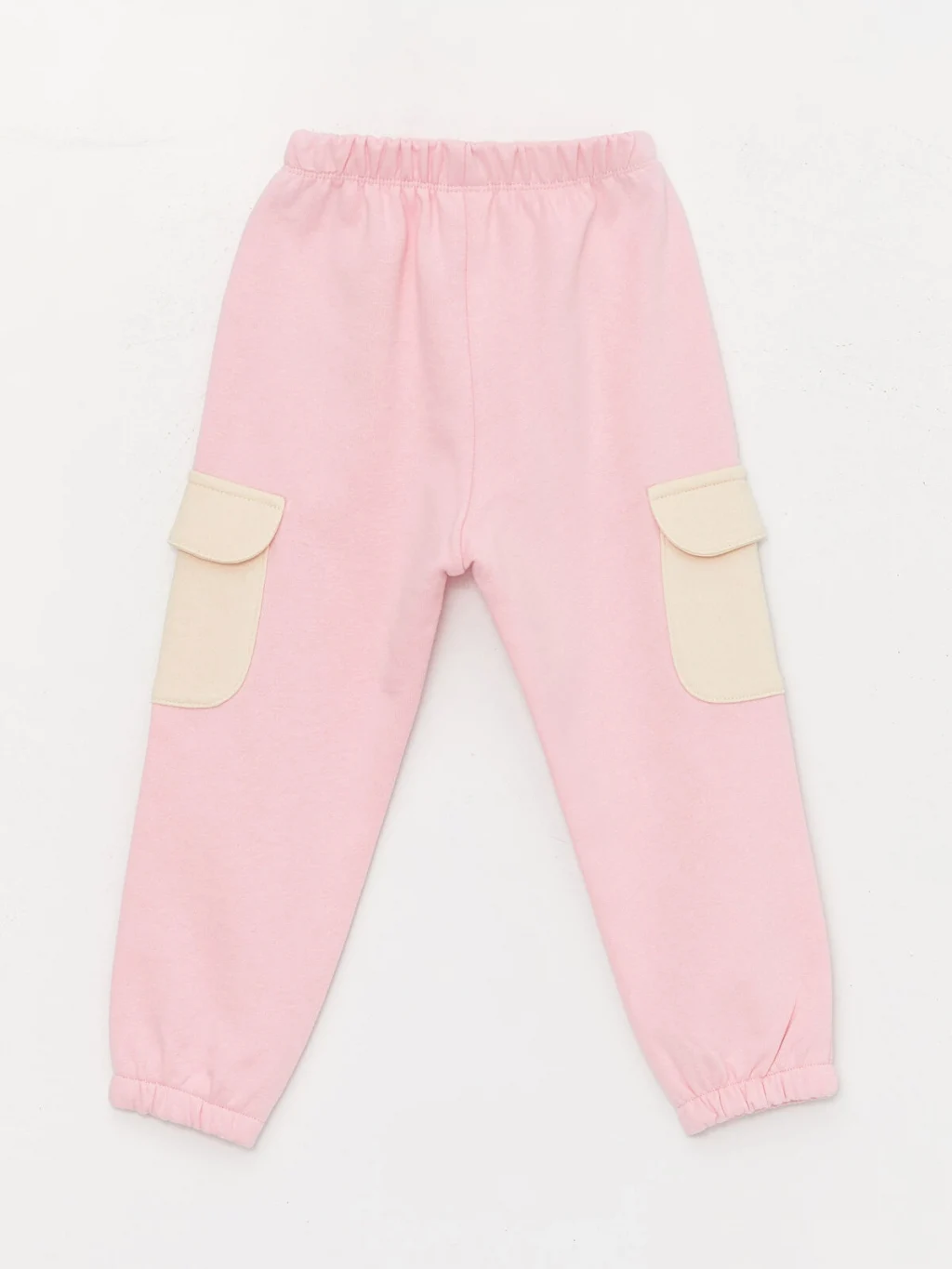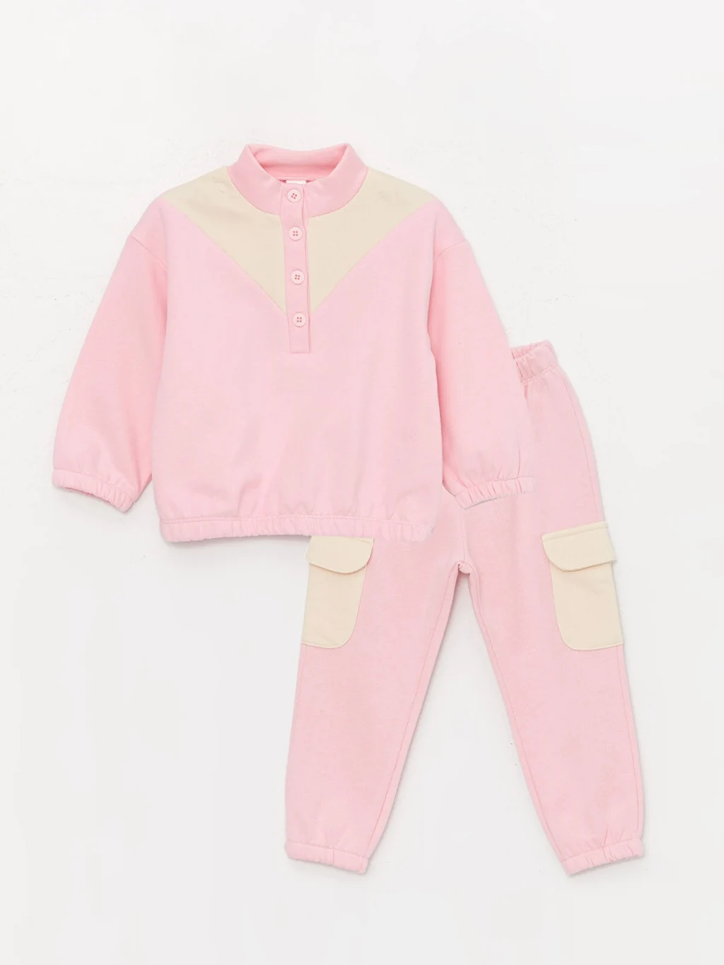 Önden düğmeli balıkçı yaka uzun kollu kız bebek sweatshirt ile yanları kargo cep modelli pantolonun bir araya geldiği şık 2'li takım.