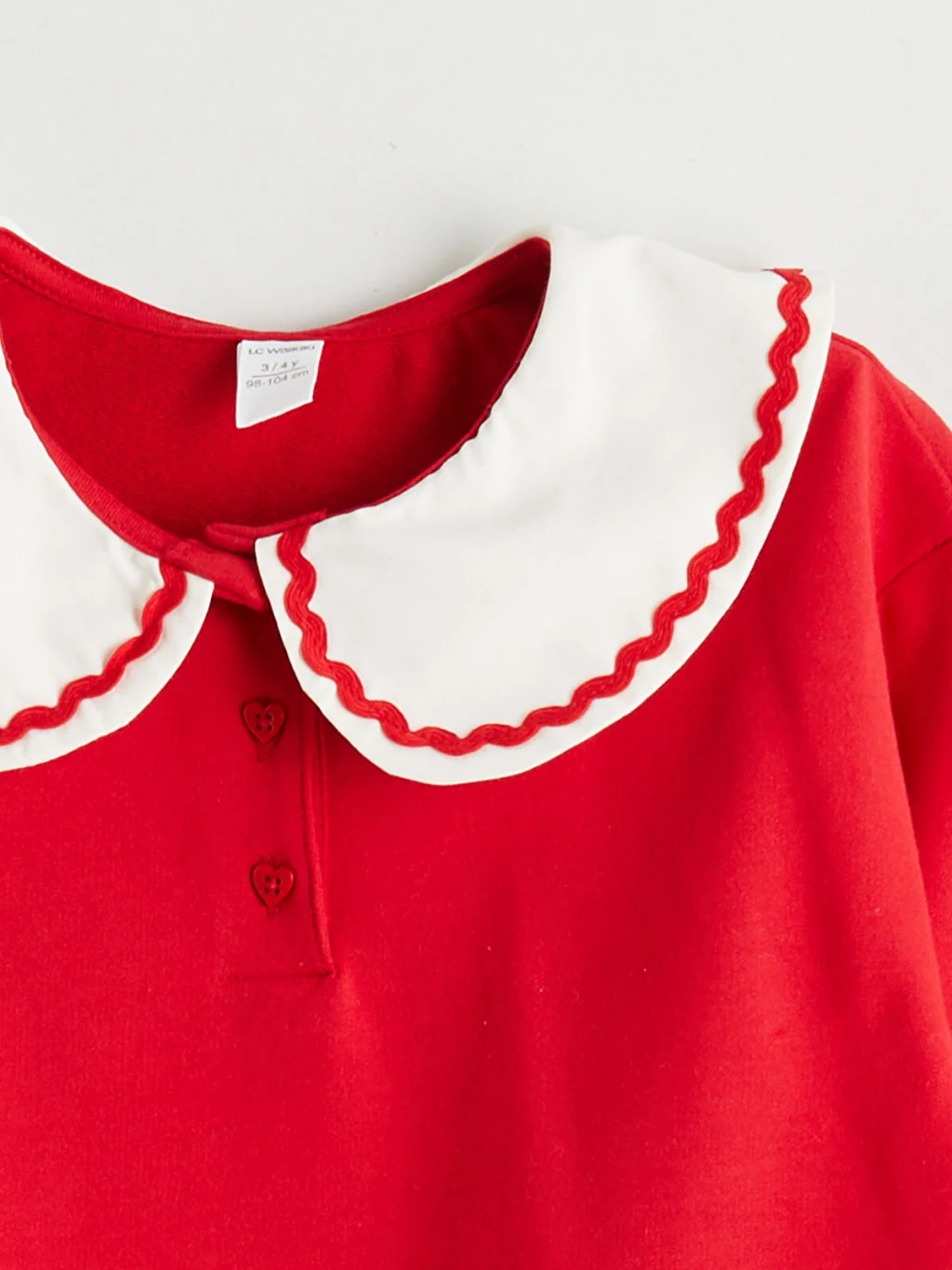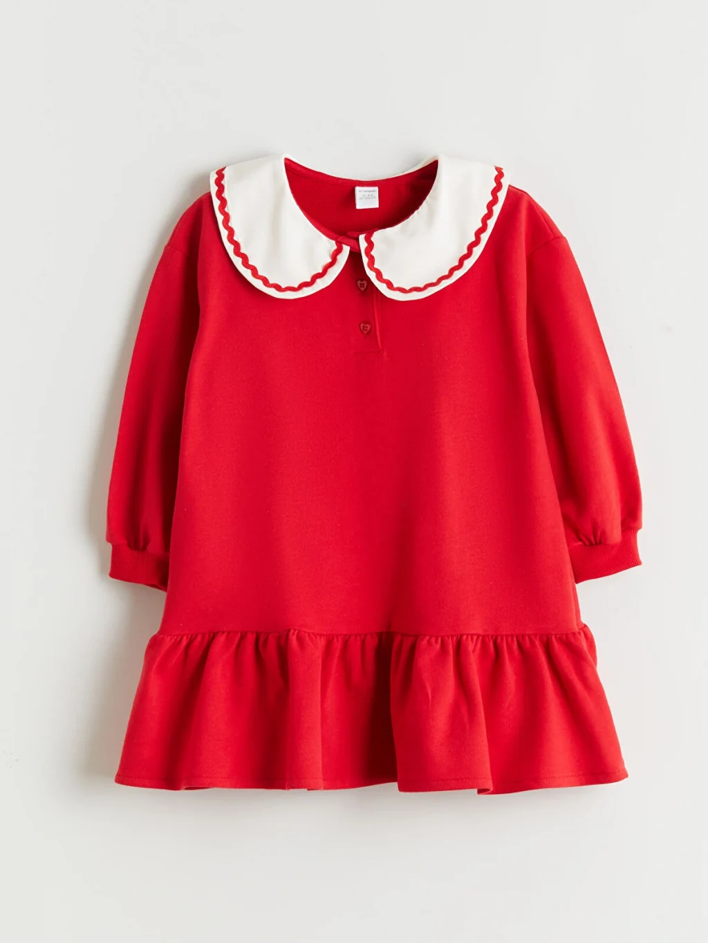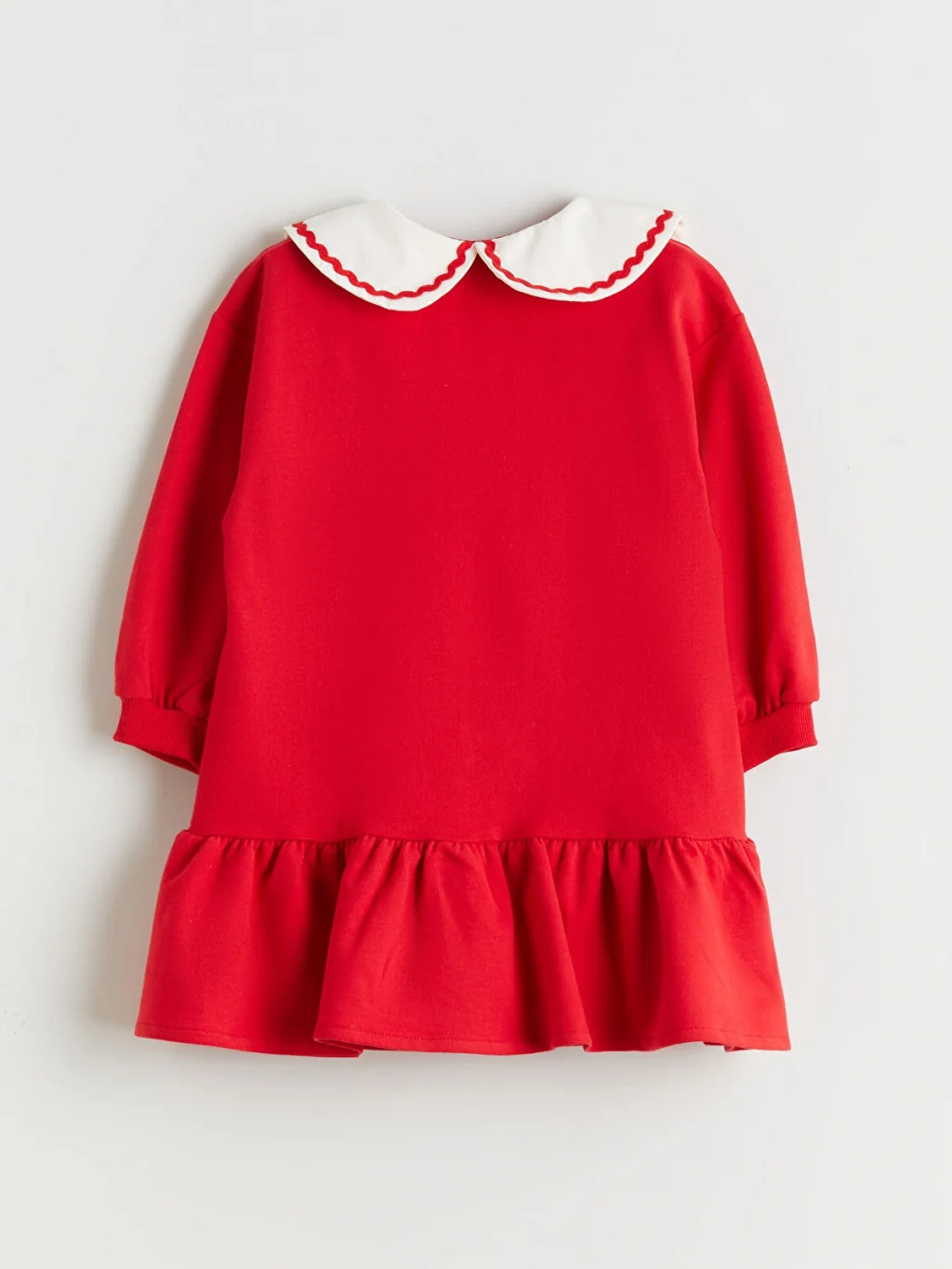 Kenarları işlemeli bebe yakalı kız çocuk elbise, %100 pamuk 2 iplik kumaştan üretilmiştir. Uzun kollu, önden düğme kapamalı ve etek ucu volanlıdır.