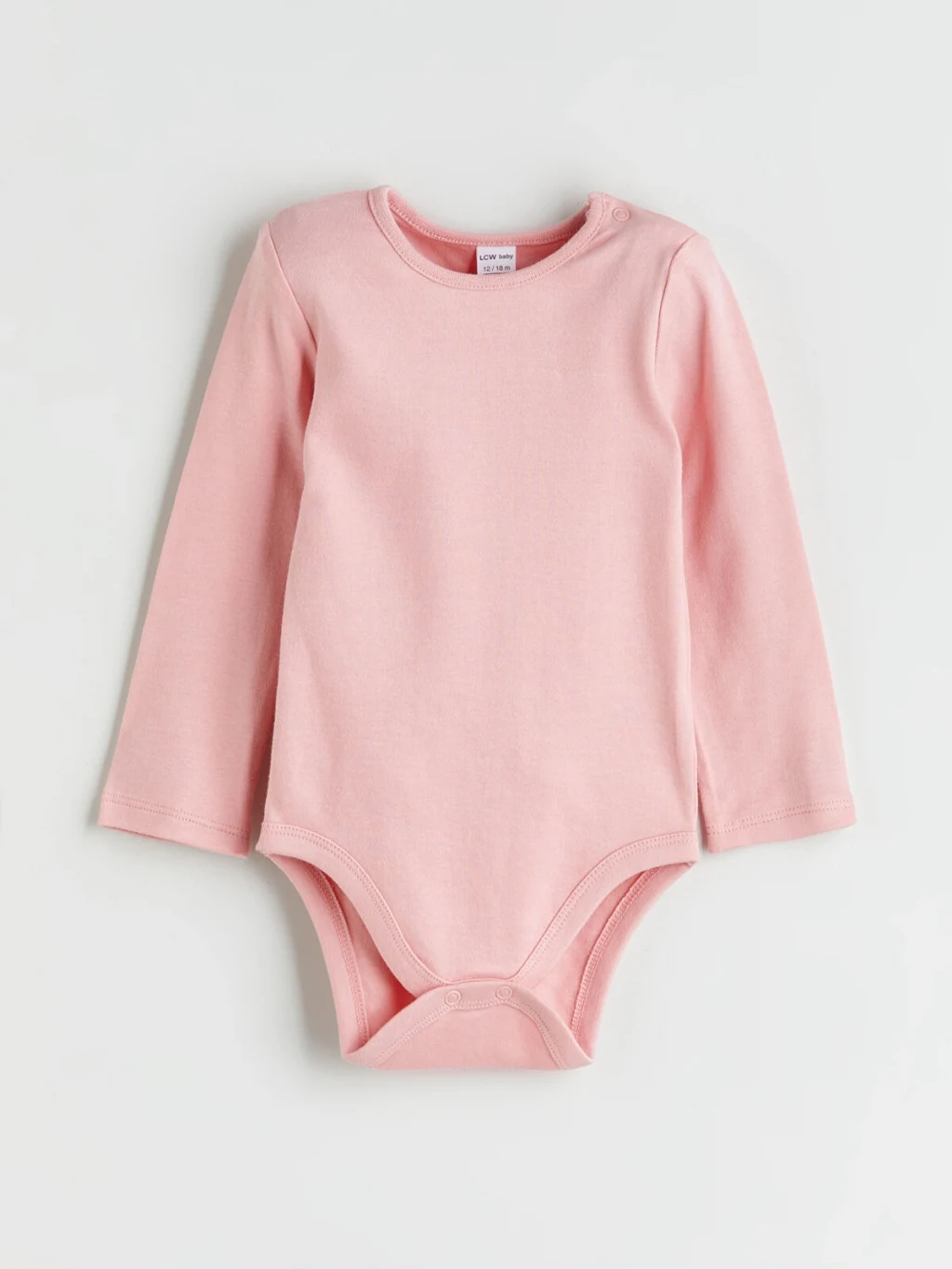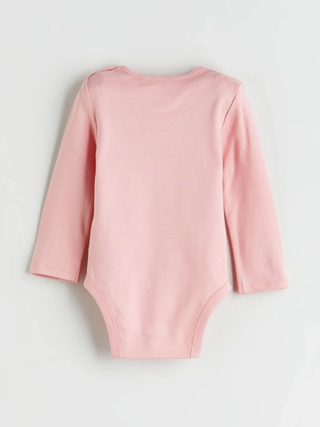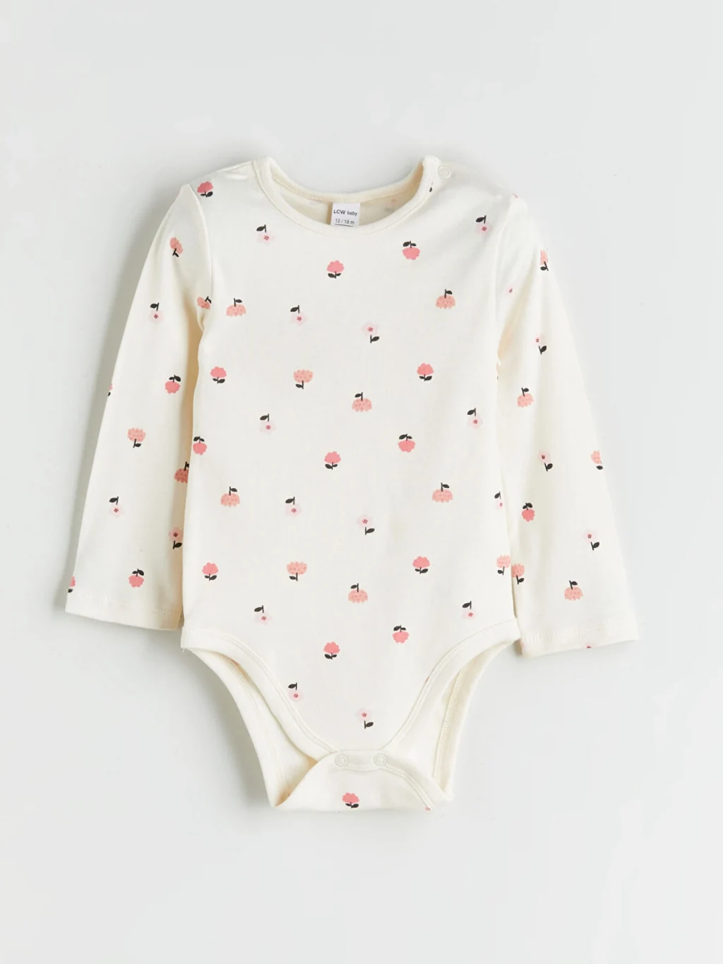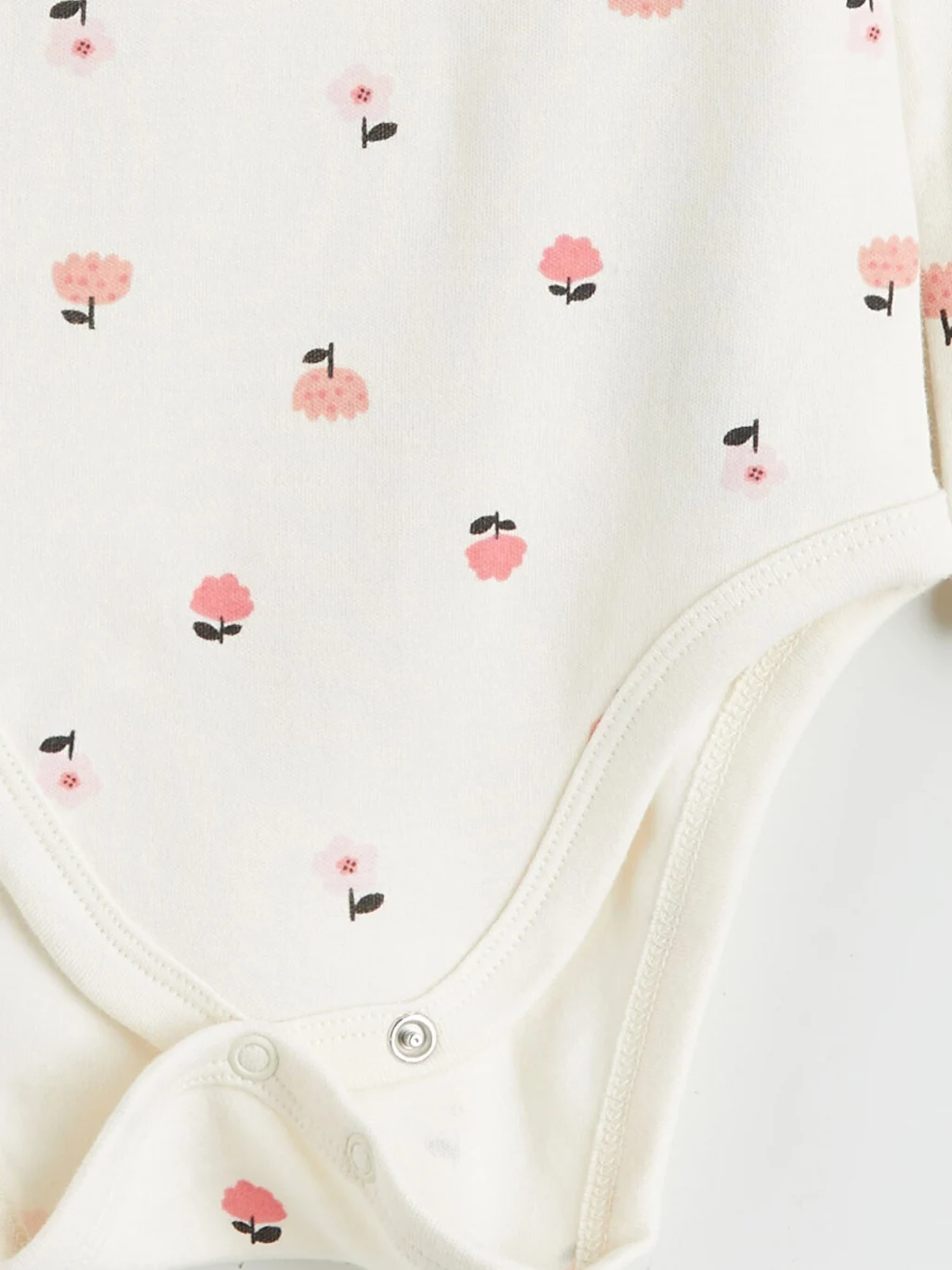 Biri çiçek desenli ve omuzdan çıtçıtlı, diğeri düz olan, uzun kollu, bisiklet yaka, alttan çıtçıt kapamalı 2'li kız bebek body seti.
