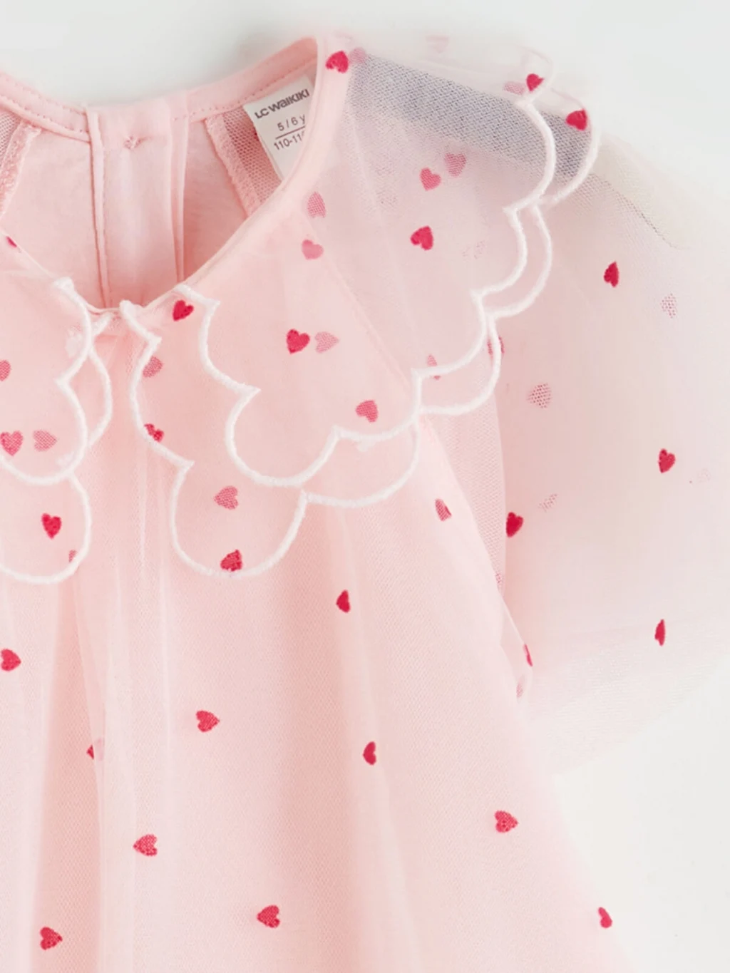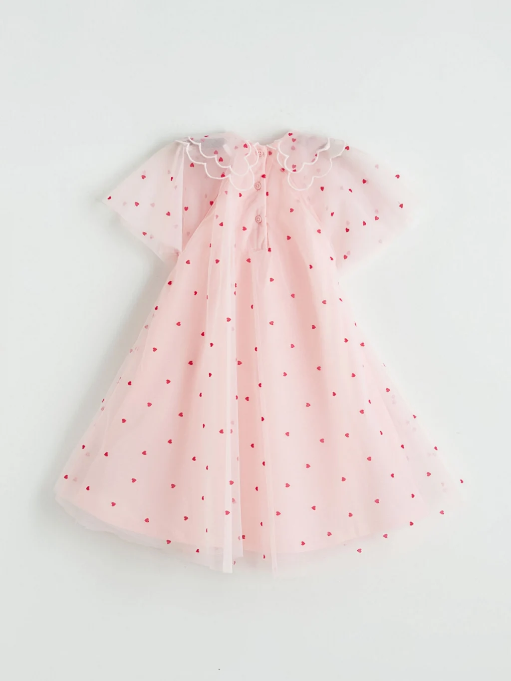 Desenli tül kumaştan üretilmiş, bebe yakalı ve kısa kollu kız bebek elbise, pamuk astarlıdır ve arkadan düğme kapamalıdır.