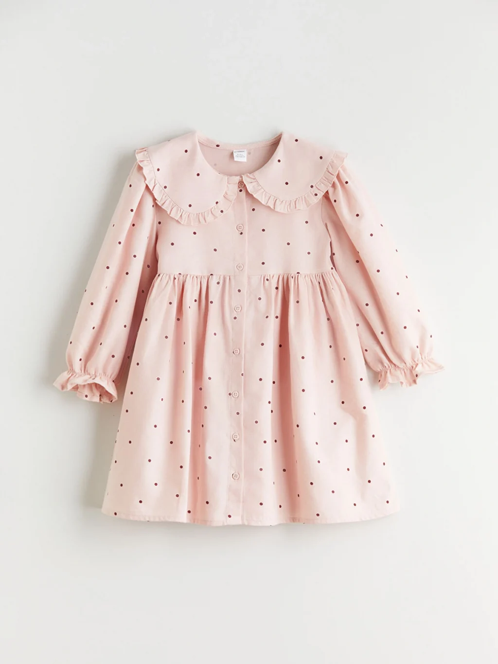 %100 pamuklu, puantiyeli kız çocuk elbise. Fırfırlı bebe yakalı, uzun kollu ve önden düğme kapamalıdır. Kol uçları lastikli ve fırfırlıdır.