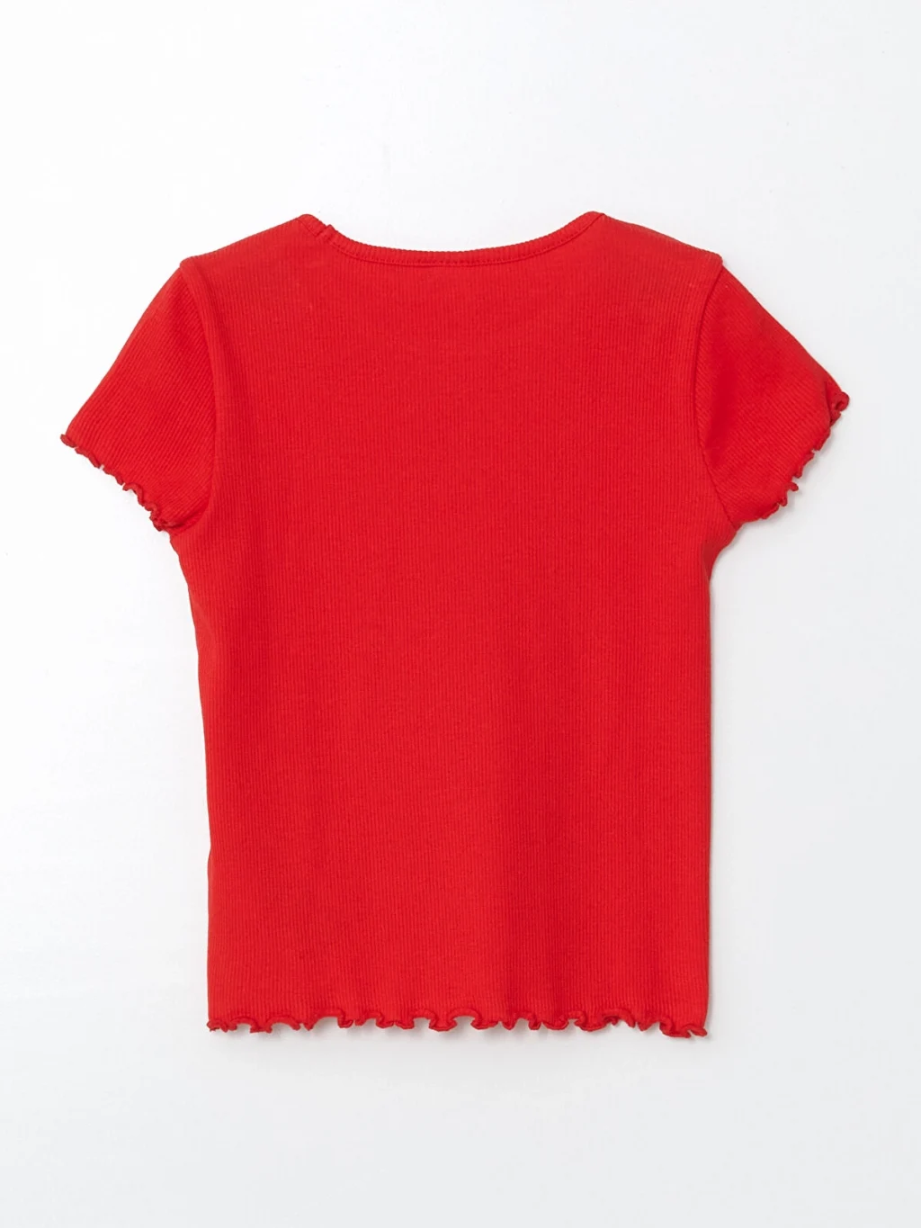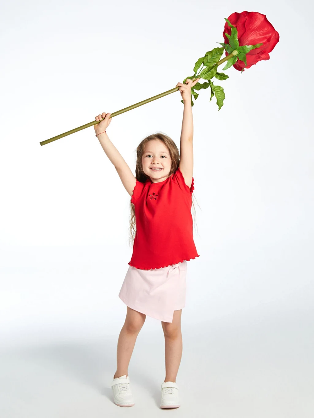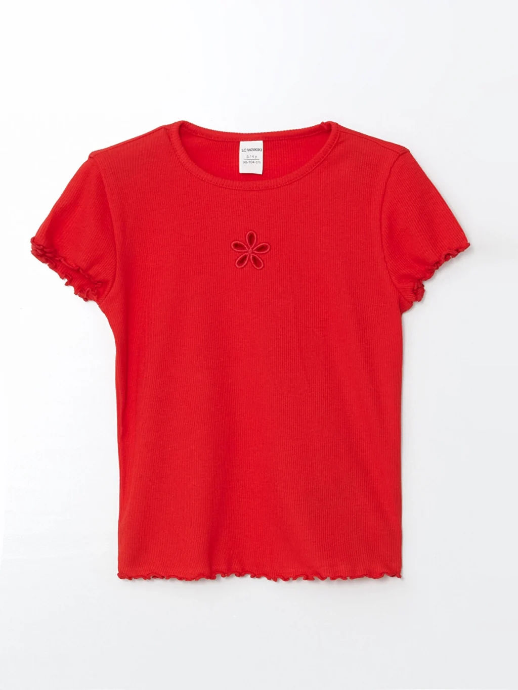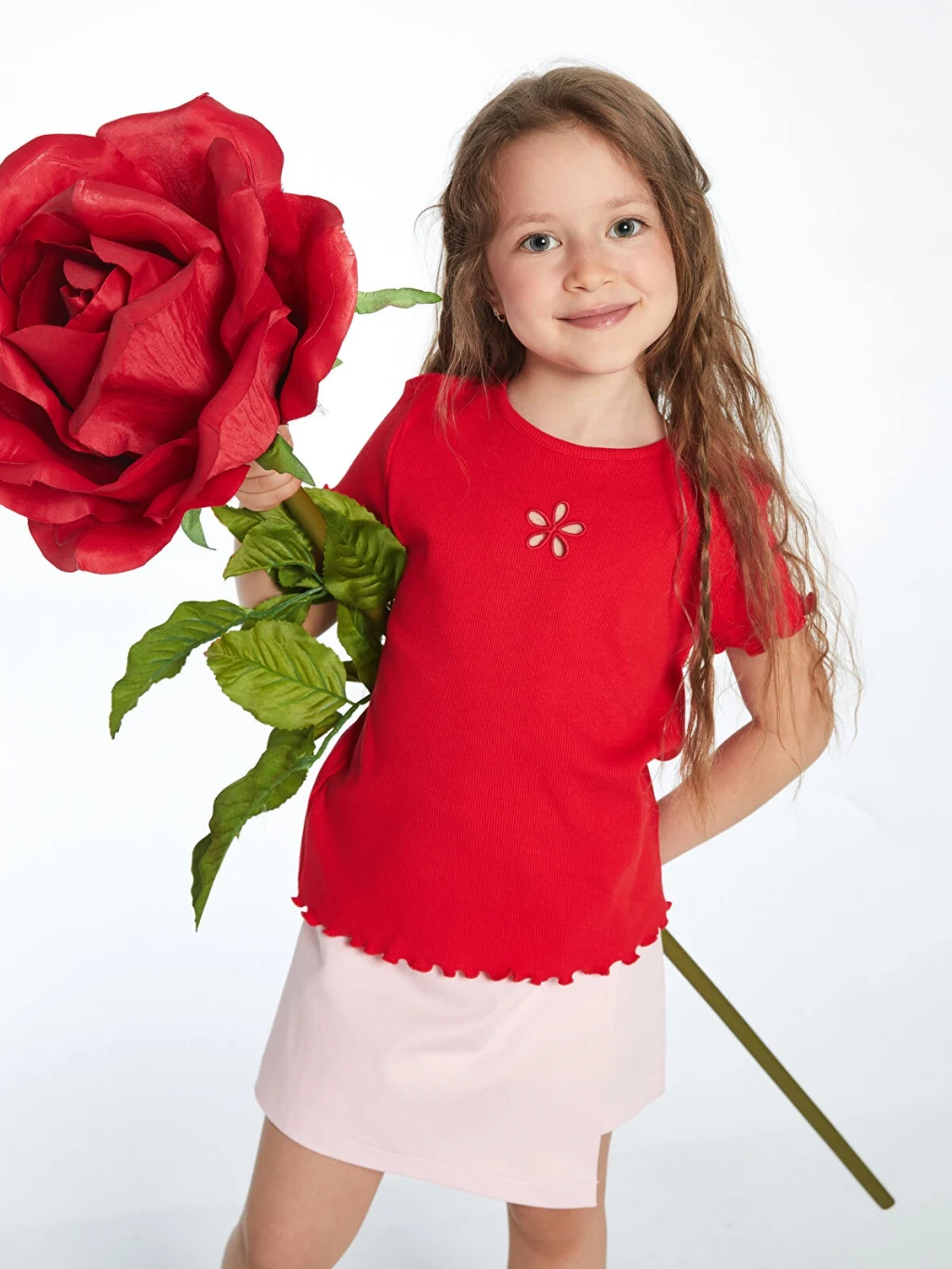 Dar kalıp, bisiklet yaka kız çocuk tişört, yüksek pamuk içerikli penye kumaşlıdır. Kısa kollu, yaka altı çiçek kesik detaylı, kol ve etek ucu fırfırlıdır.