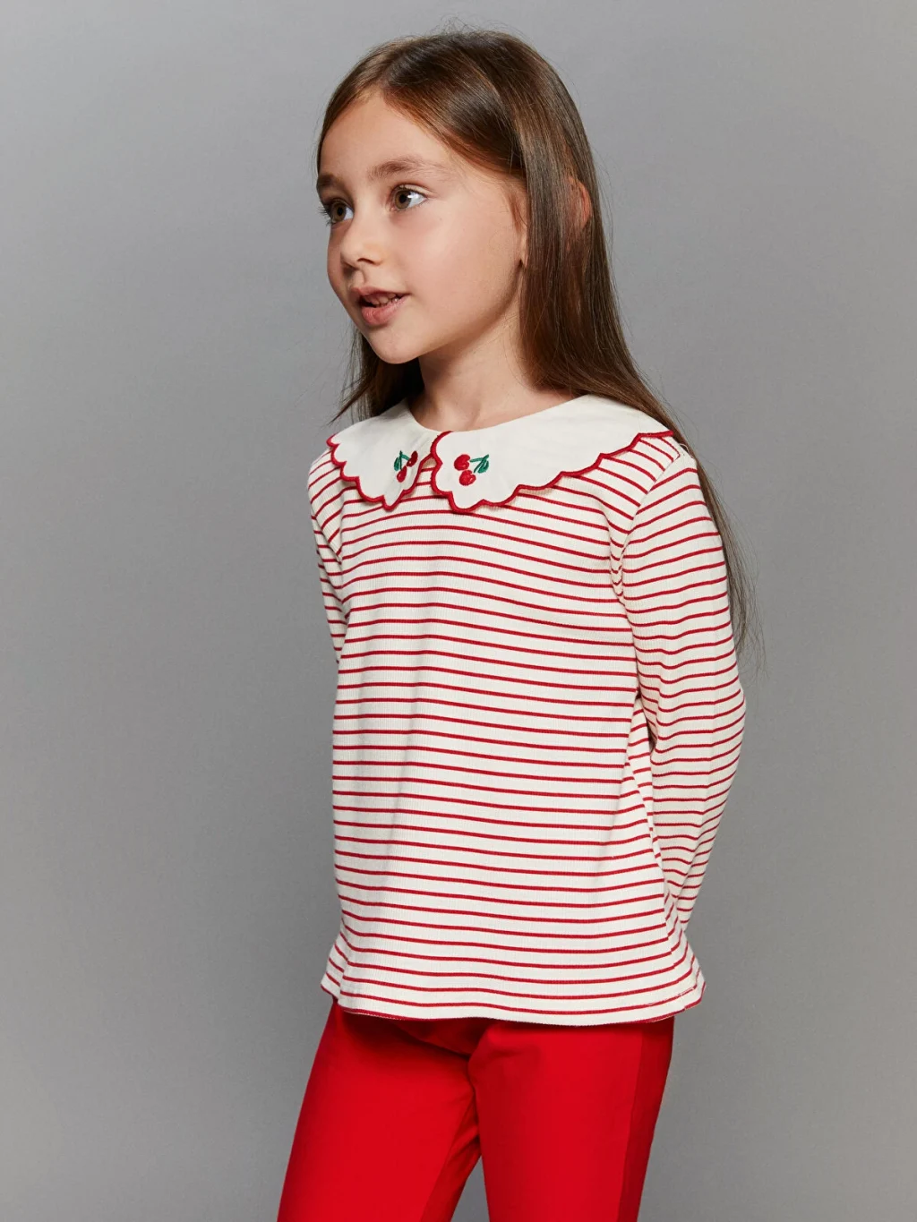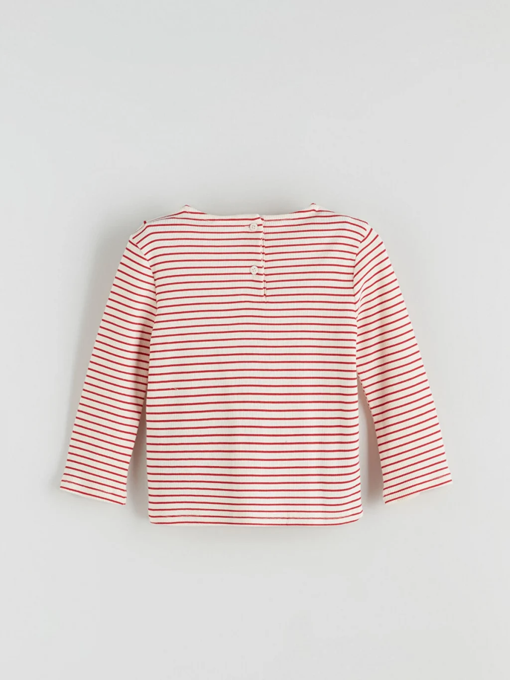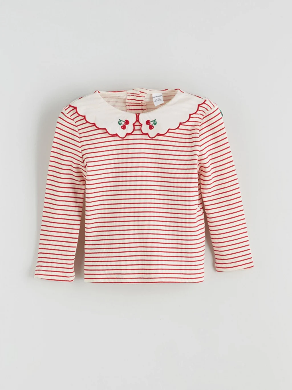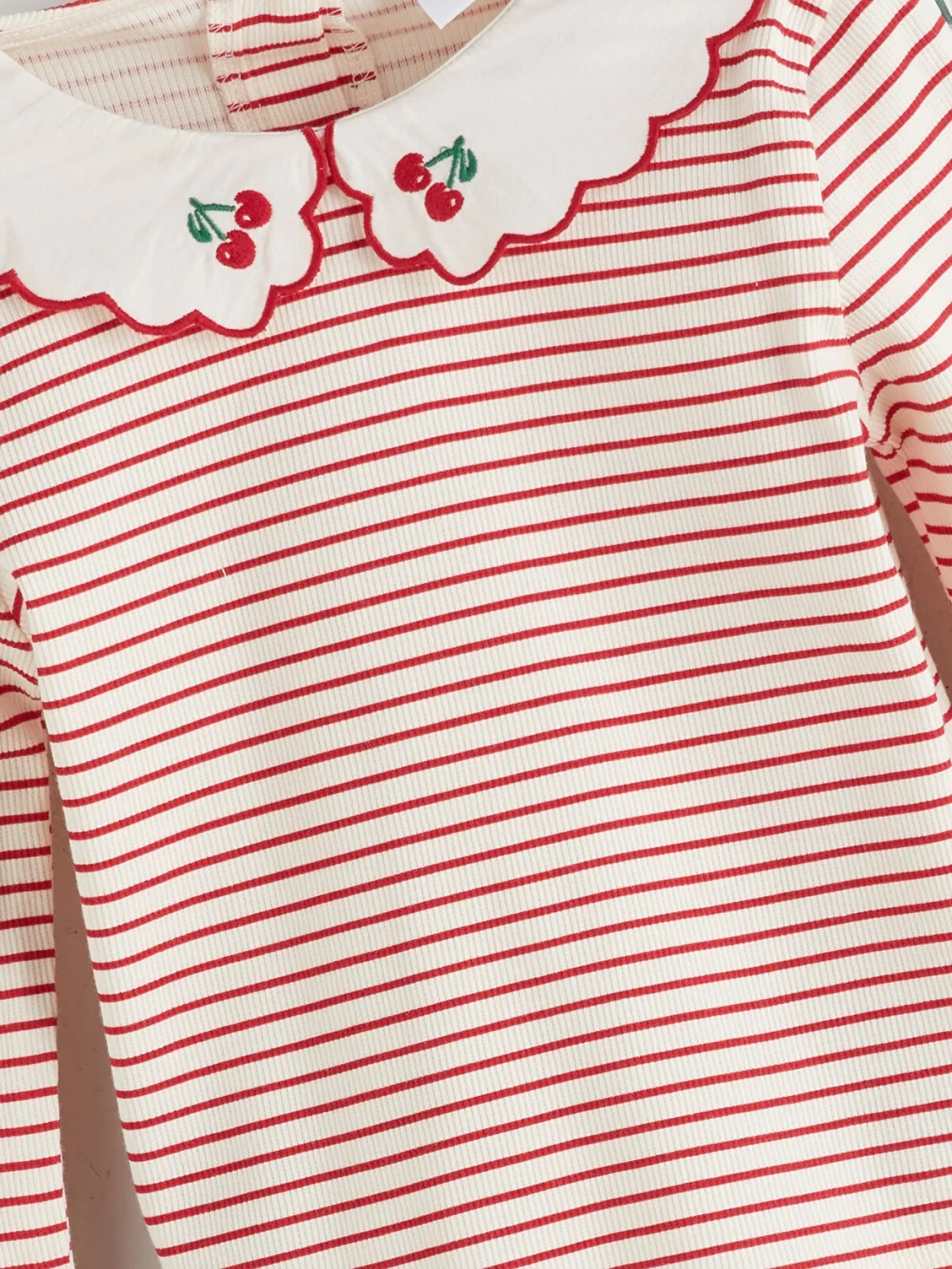 Dar kalıp, kaşkorse kumaştan üretilmiş kız çocuk tişört; çizgili, uzun kollu ve nakış detaylı, dalgalı kenarlı bebe yakalıdır. Enseden düğmelidir.