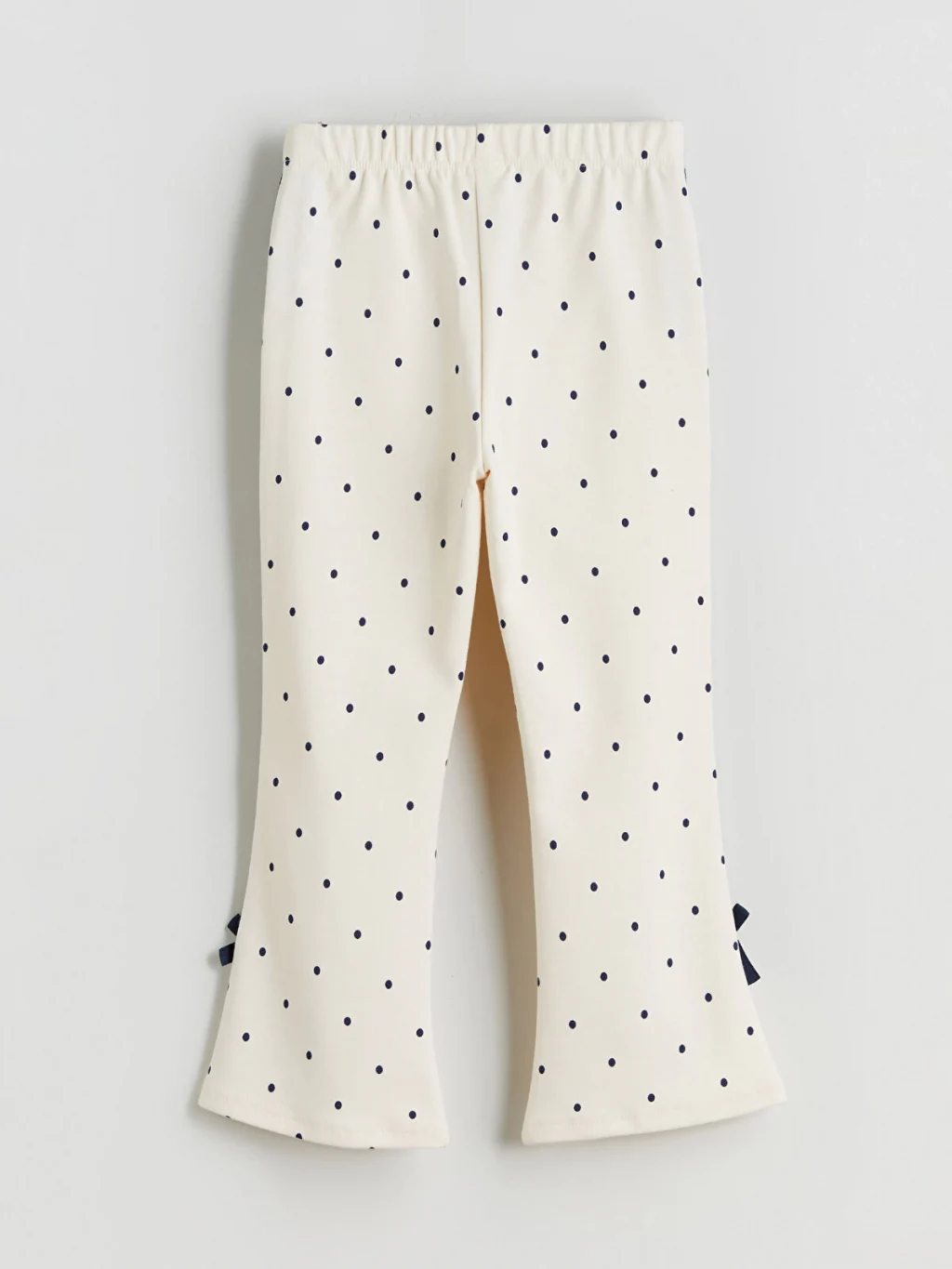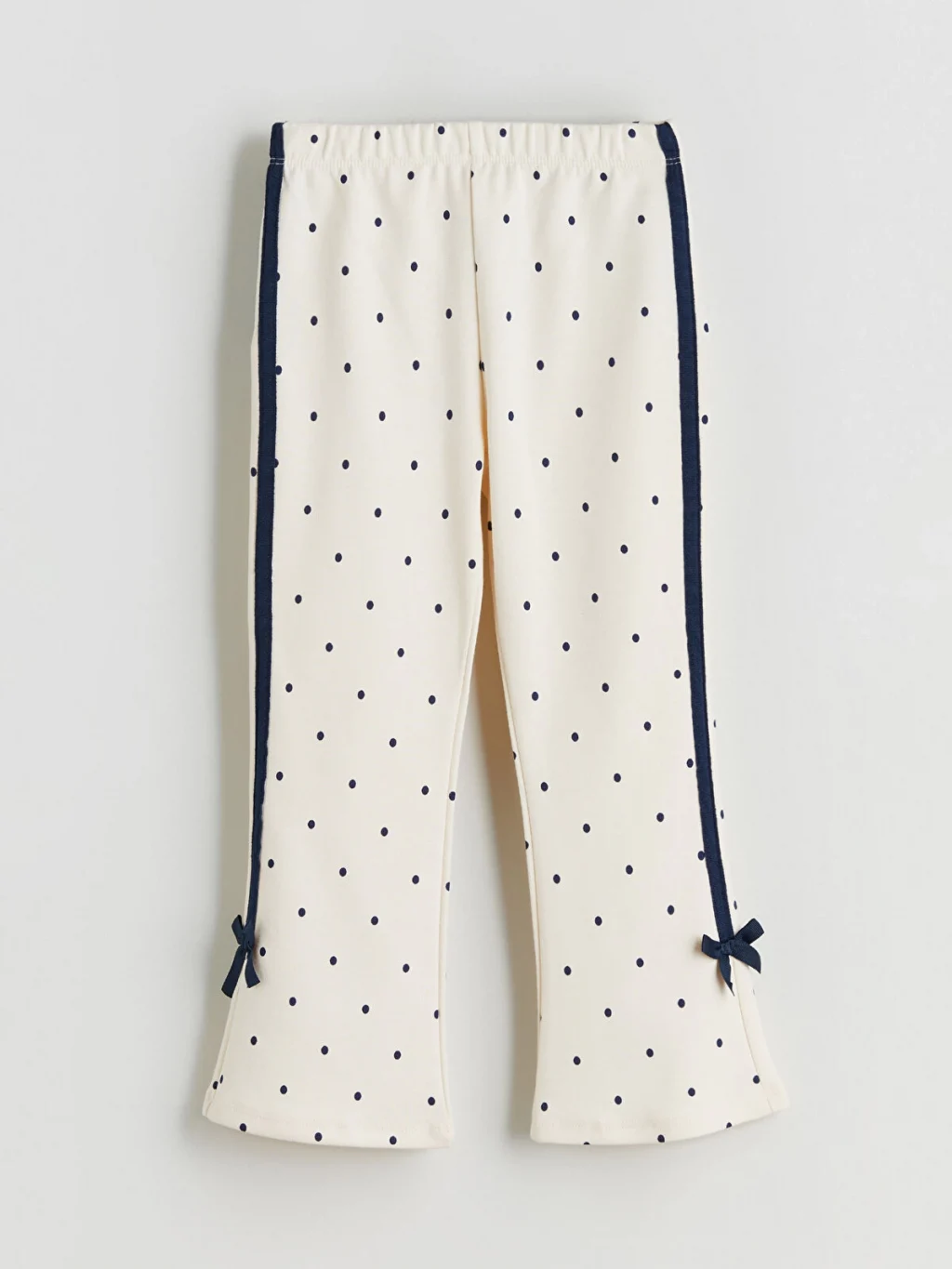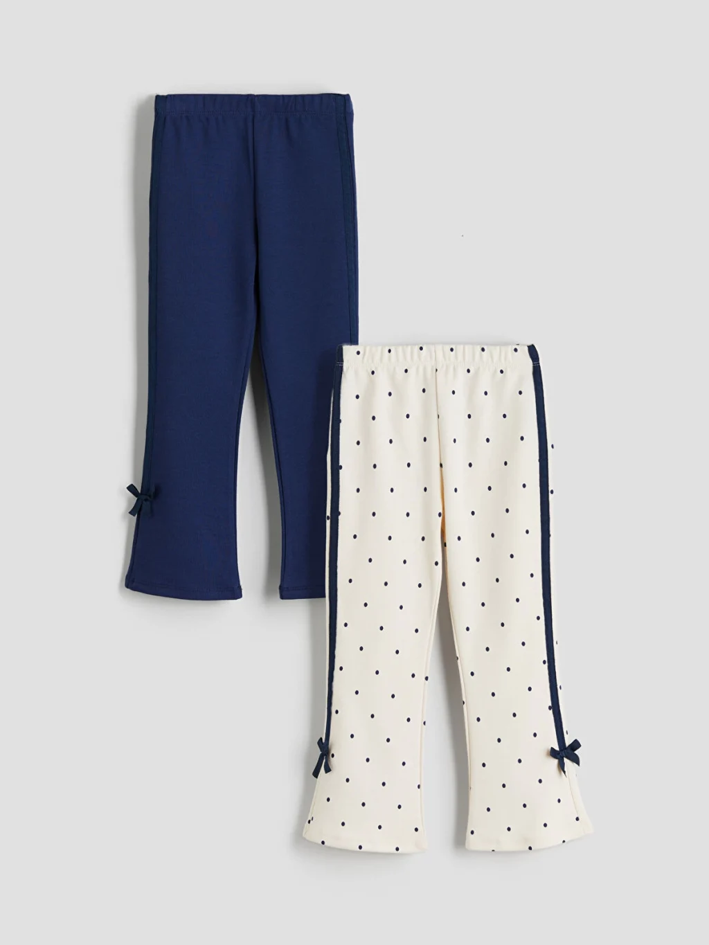 Kız bebek 2'li tayt takımı, beli lastikli ve İspanyol paça kesimlidir. Paçaları yandan yırtmaçlı ve fiyonk detaylıdır. Biri düz, diğeri puantiyelidir.