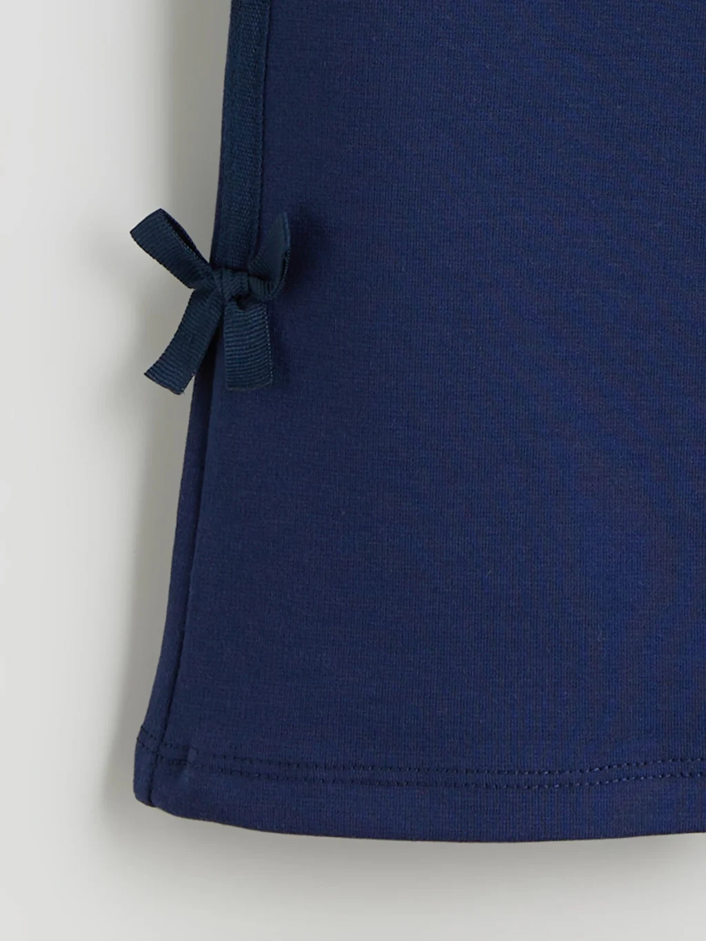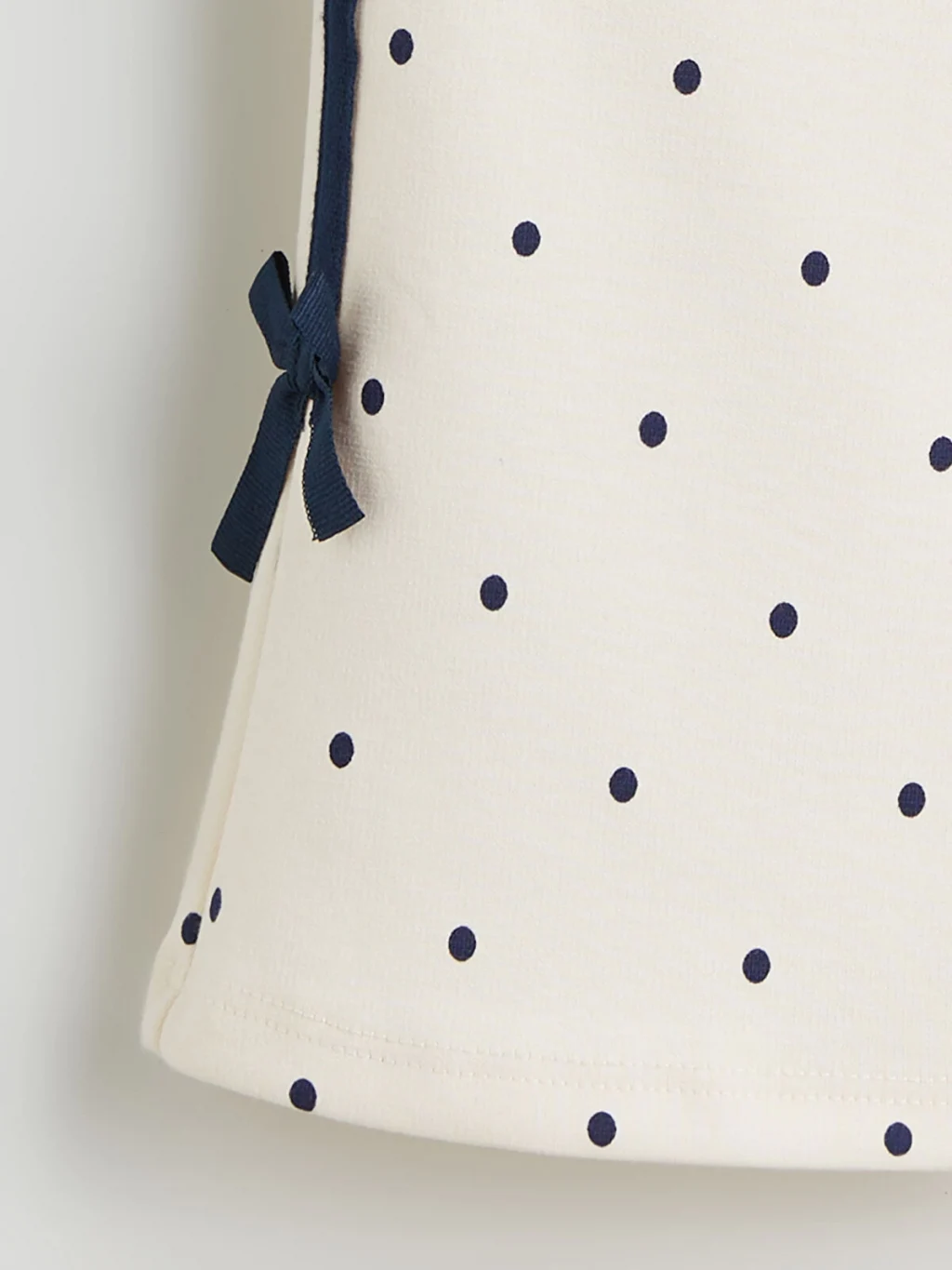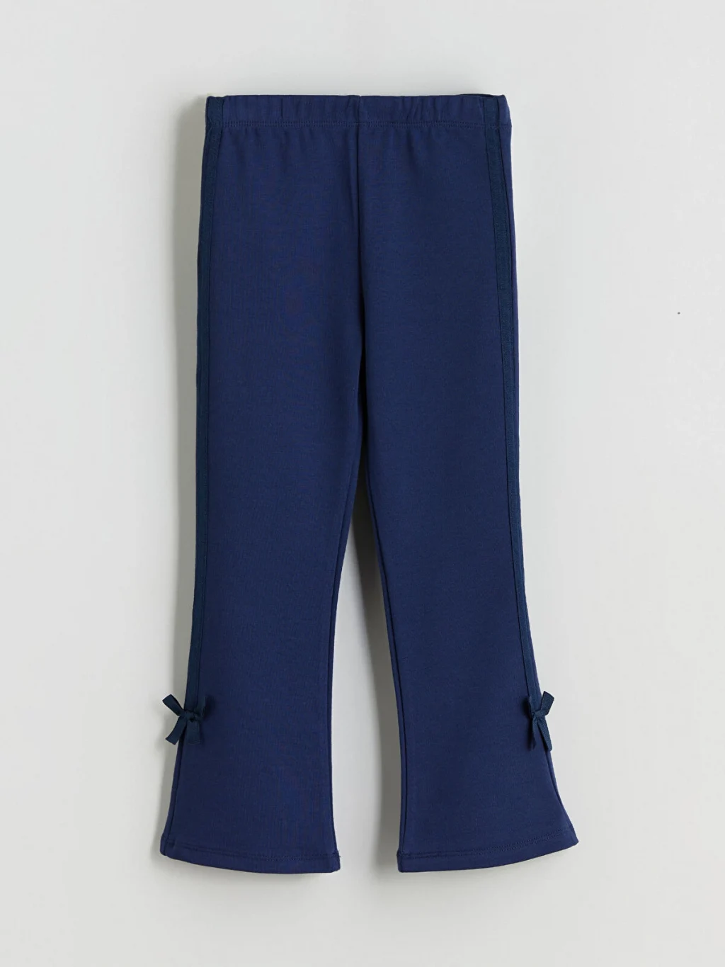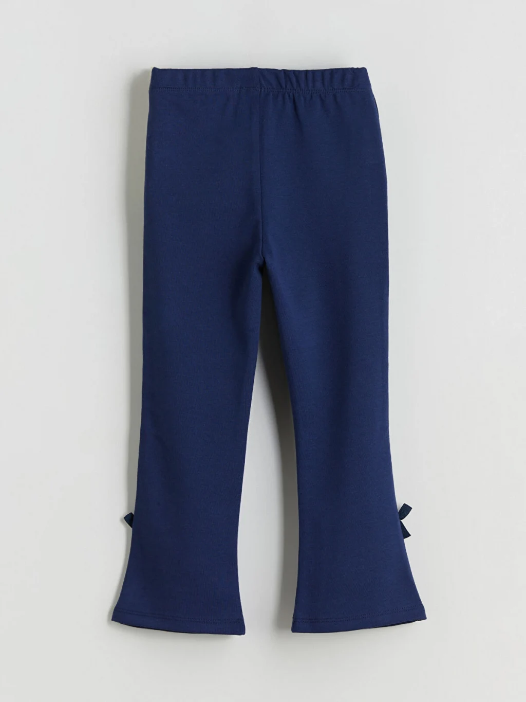 Kız bebek 2'li tayt takımı, beli lastikli ve İspanyol paça kesimlidir. Paçaları yandan yırtmaçlı ve fiyonk detaylıdır. Biri düz, diğeri puantiyelidir.