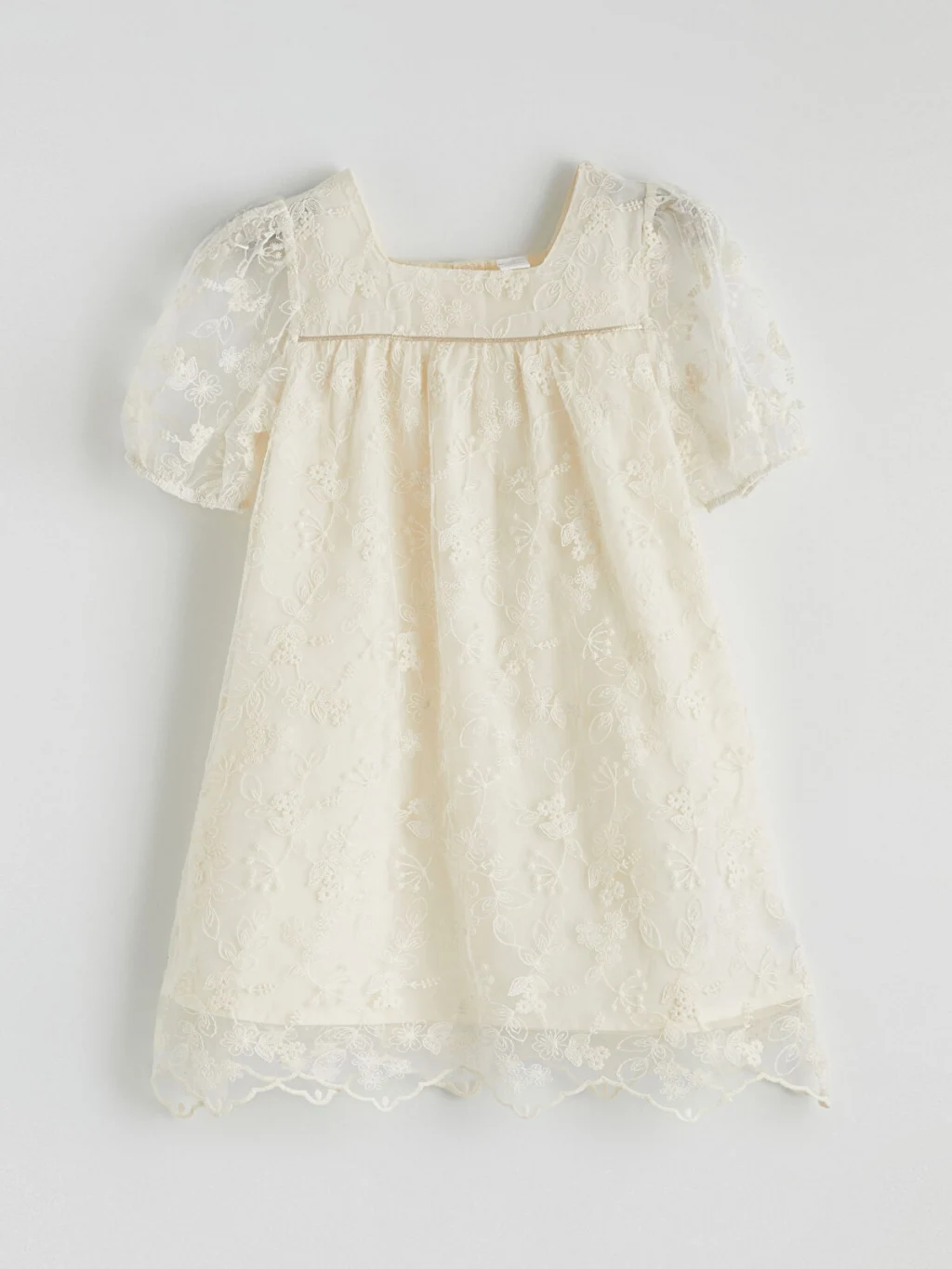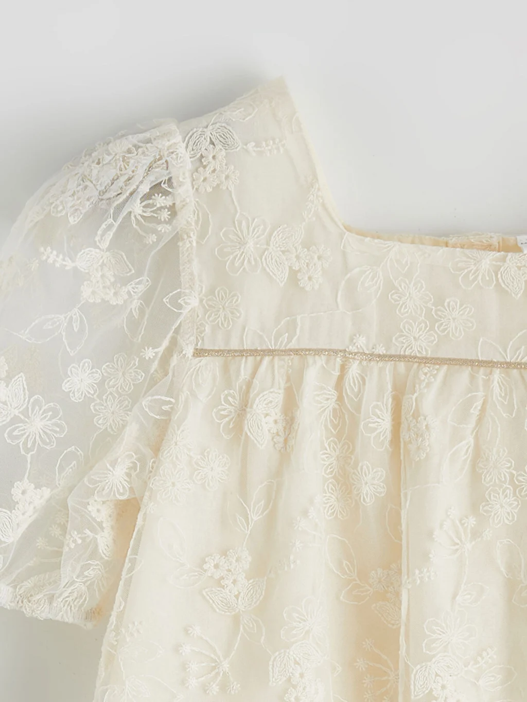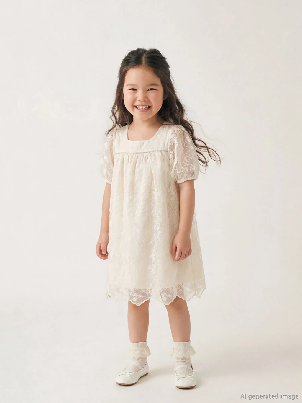 Kare yakalı ve kısa balon kollu kız çocuk elbise, tamamı nakışlı dantel kumaştan üretilmiştir. Arkadan düğme kapamalıdır.