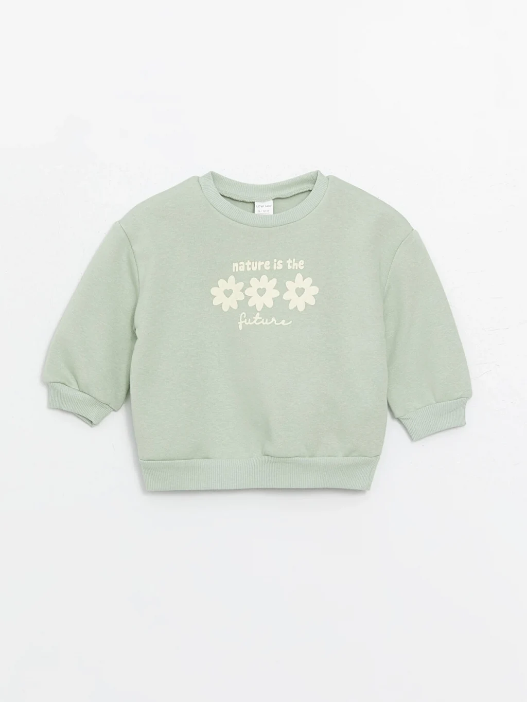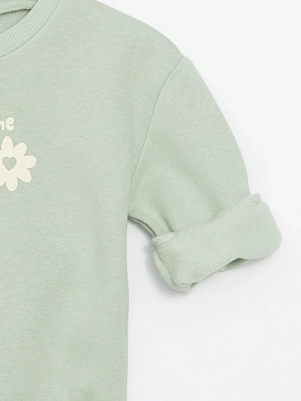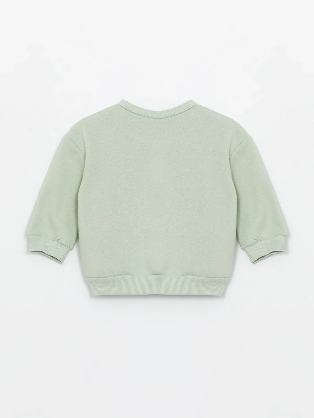 3 iplik şardonlu kumaştan üretilen kız bebek sweatshirt, sevimli baskısı ile dikkat çeker. Manşetleri ve etek ucu ribanalı detayları, rahat bir oturuş sağlar. Bebeğiniz için konforlu bir seçenek.