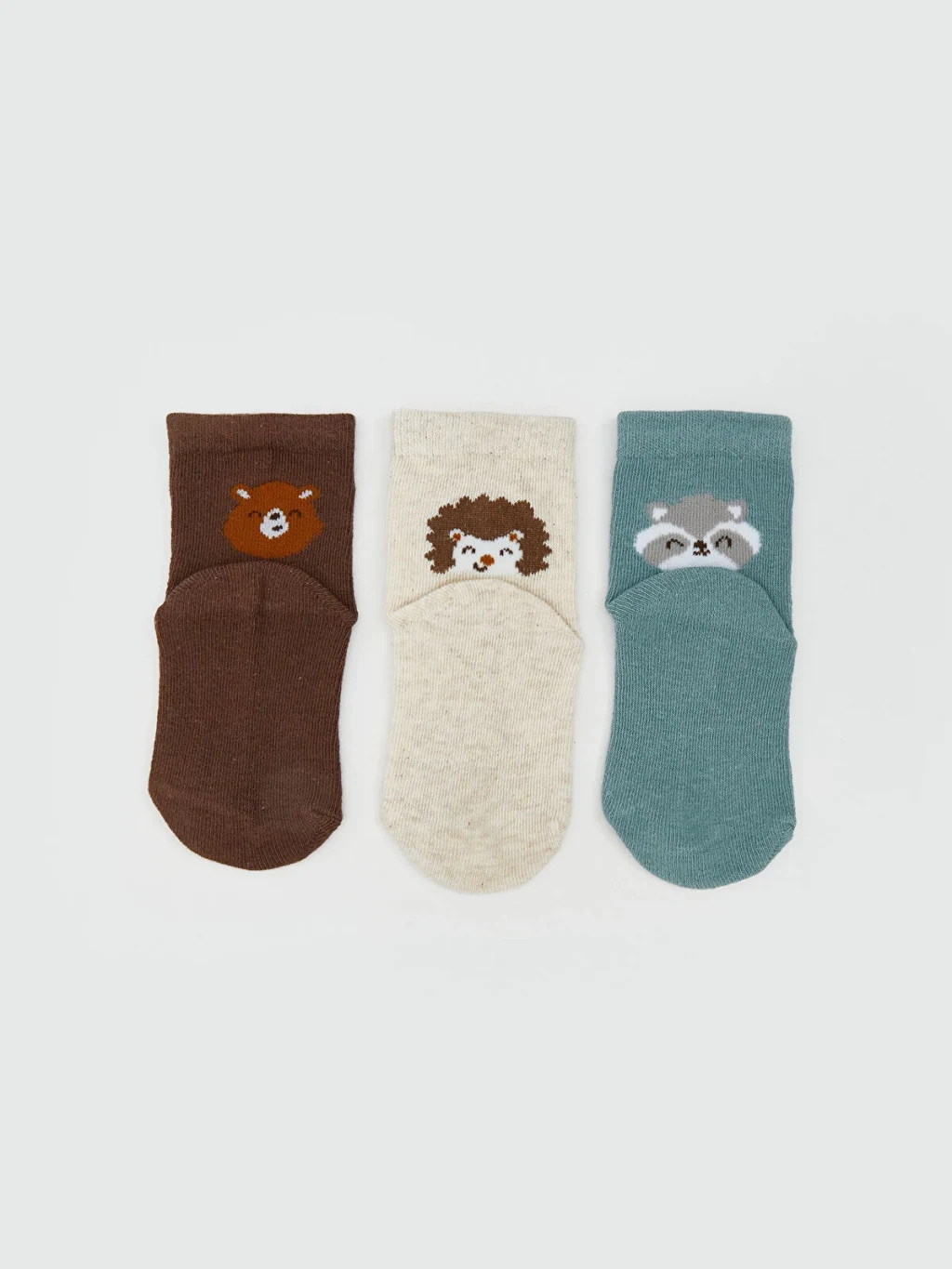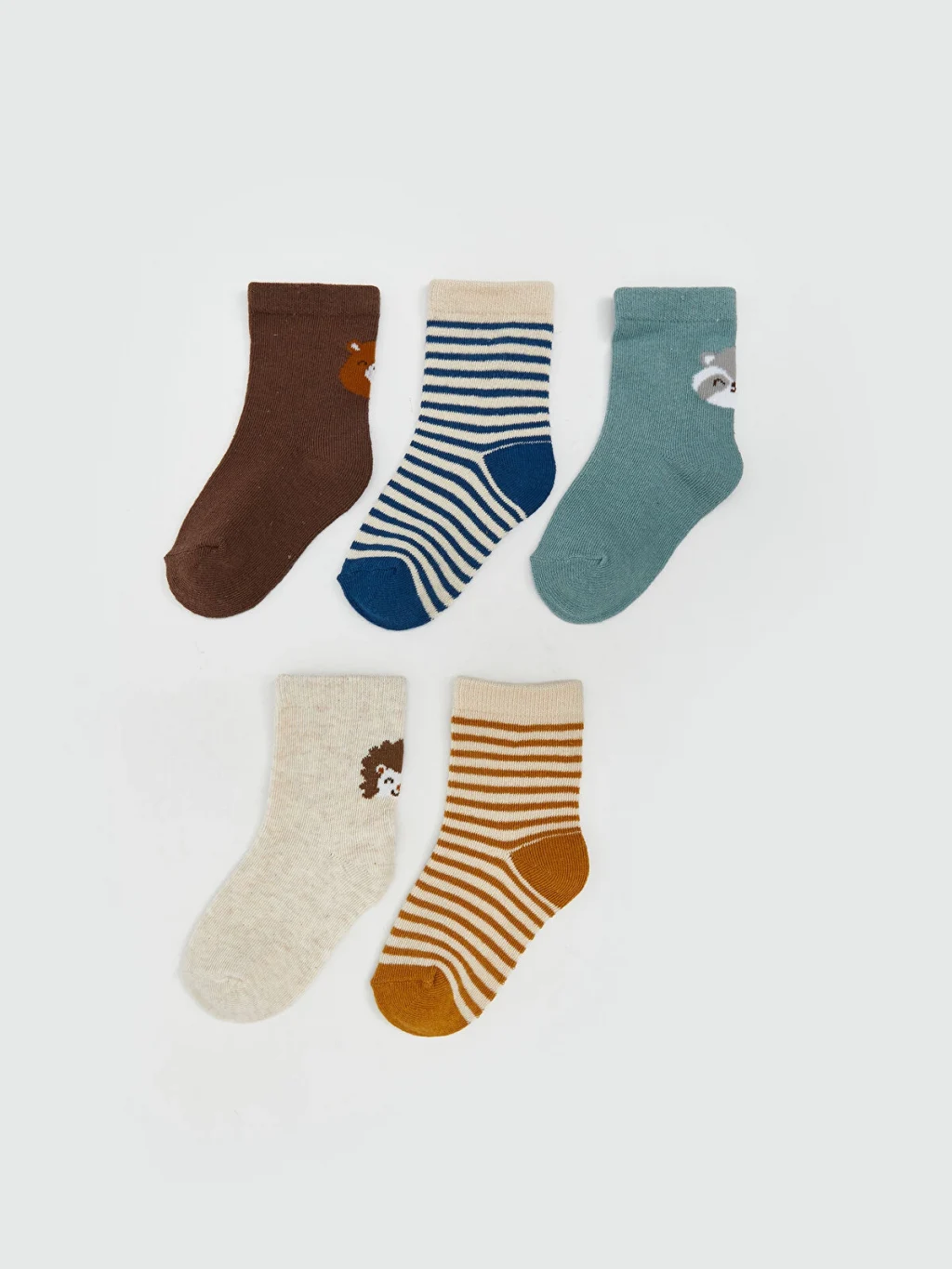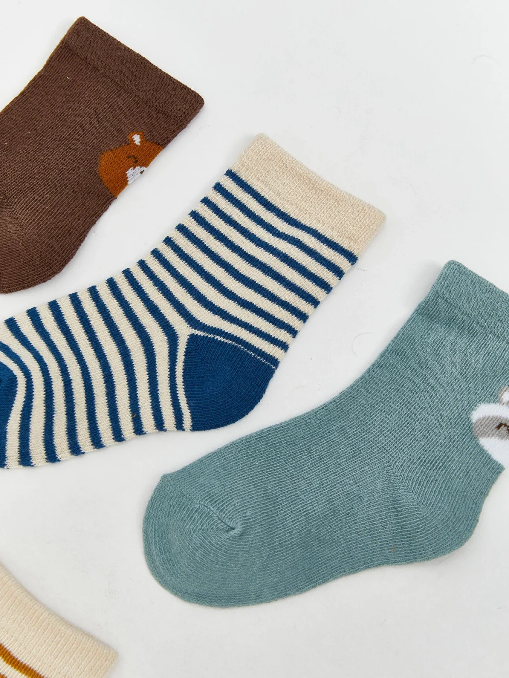 Erkek bebek soket çorap seti, ikisi çizgili üçü baskılı 5 adet çoraptan oluşur.