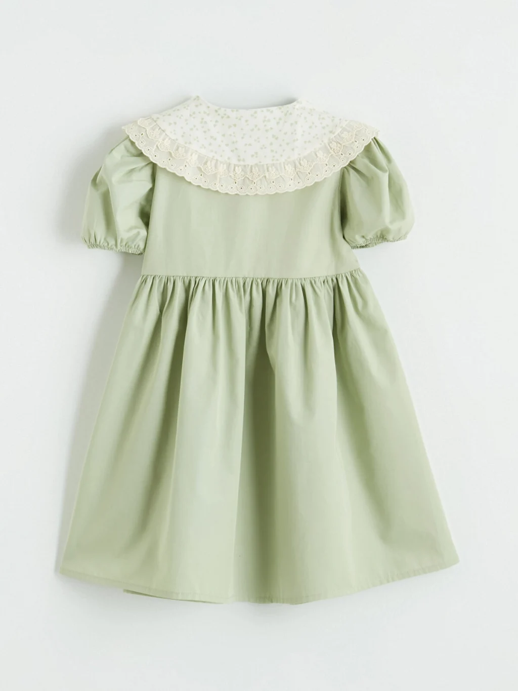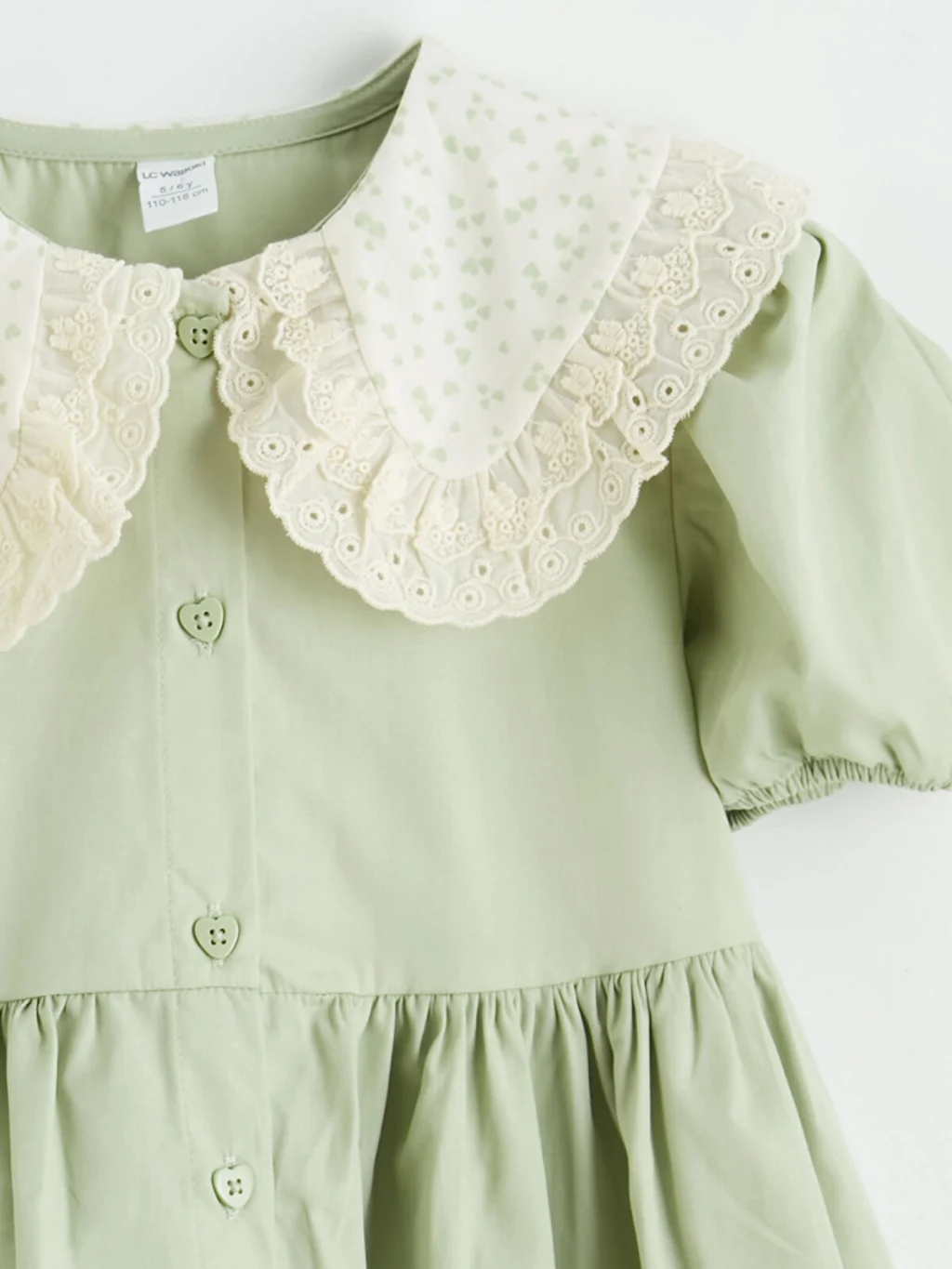 Kız çocuk elbise, krinkle kumaştan üretilmiştir. Desenli ve fırfırlı bebe yakalı, kısa balon kollu ve önden düğme kapamalıdır.