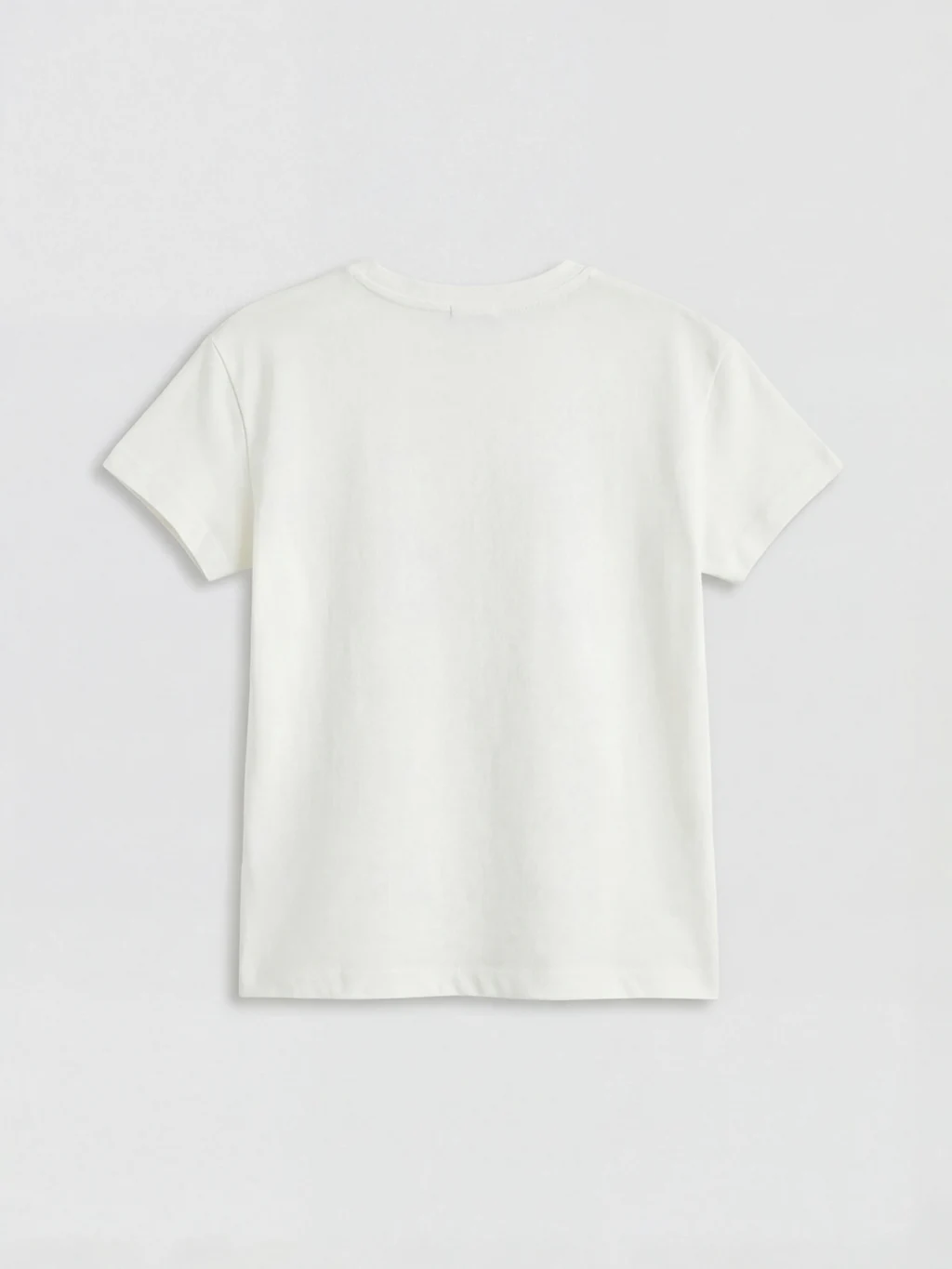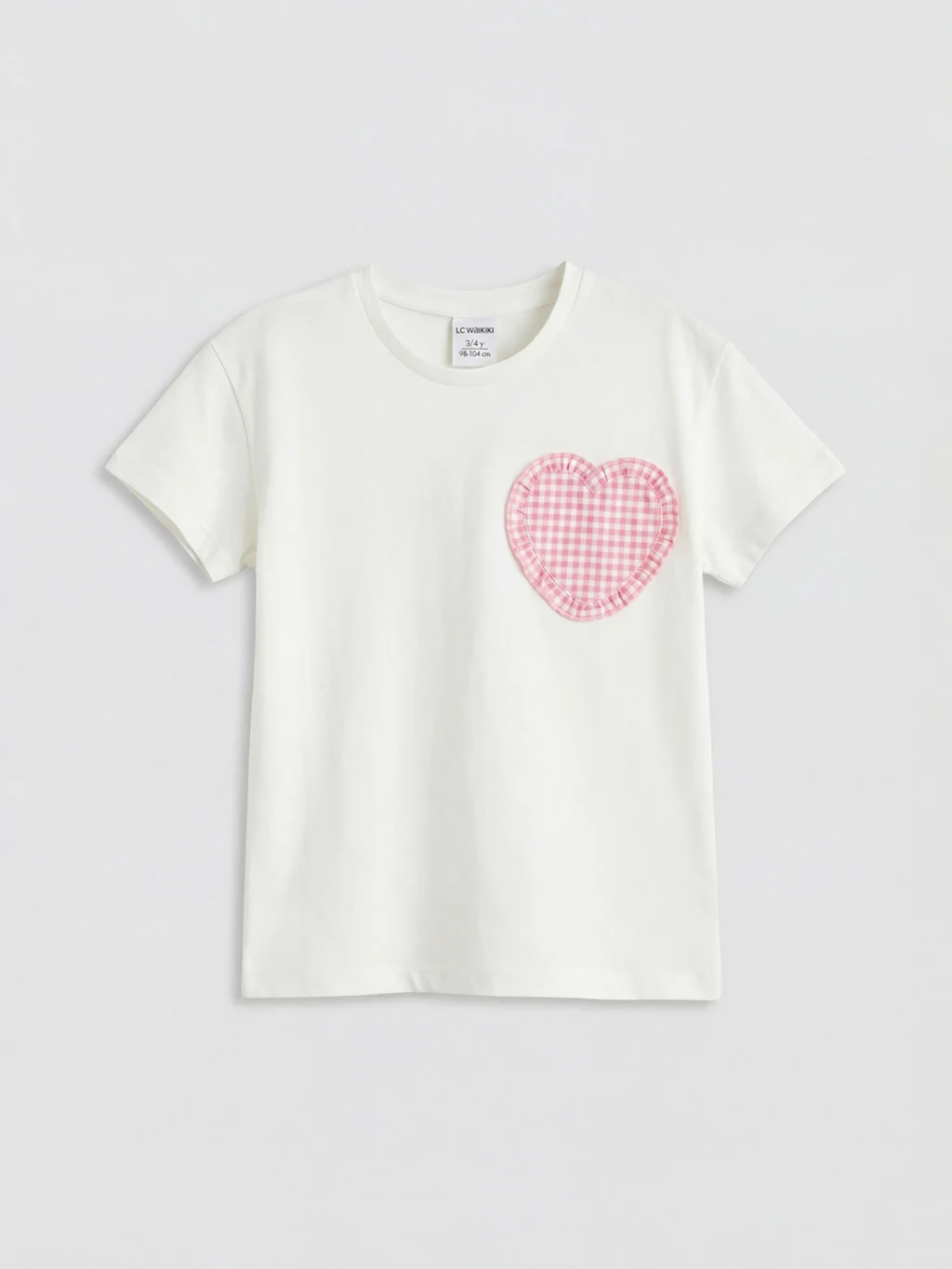 Bisiklet yaka ve kısa kollu kız bebek tişört, %100 pamuklu penye kumaştan üretilmiştir ve kalp şeklinde fırfırlı cep detayı bulunur.