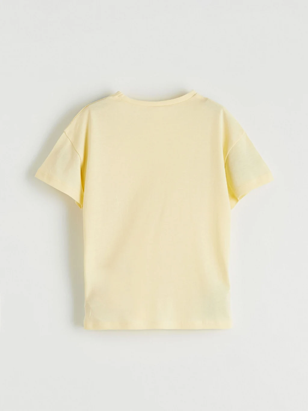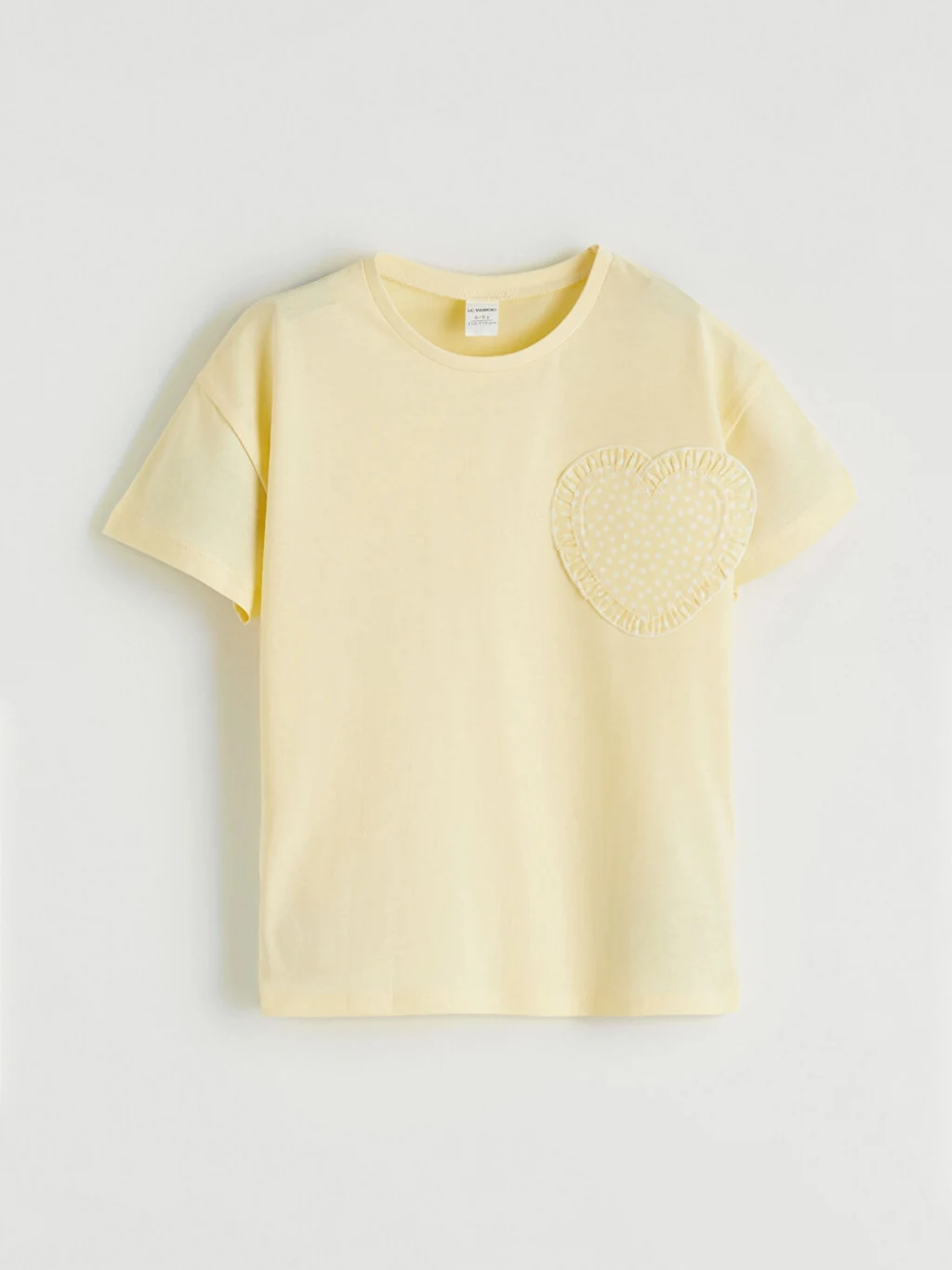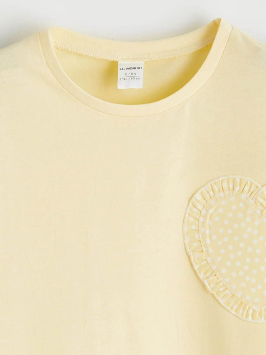Kız bebek tişört, %100 pamuklu penye kumaştan üretilmiştir. Bisiklet yaka ve kısa kolludur. Kalp şeklinde, fırfırlı ve desenli cep detaylıdır.