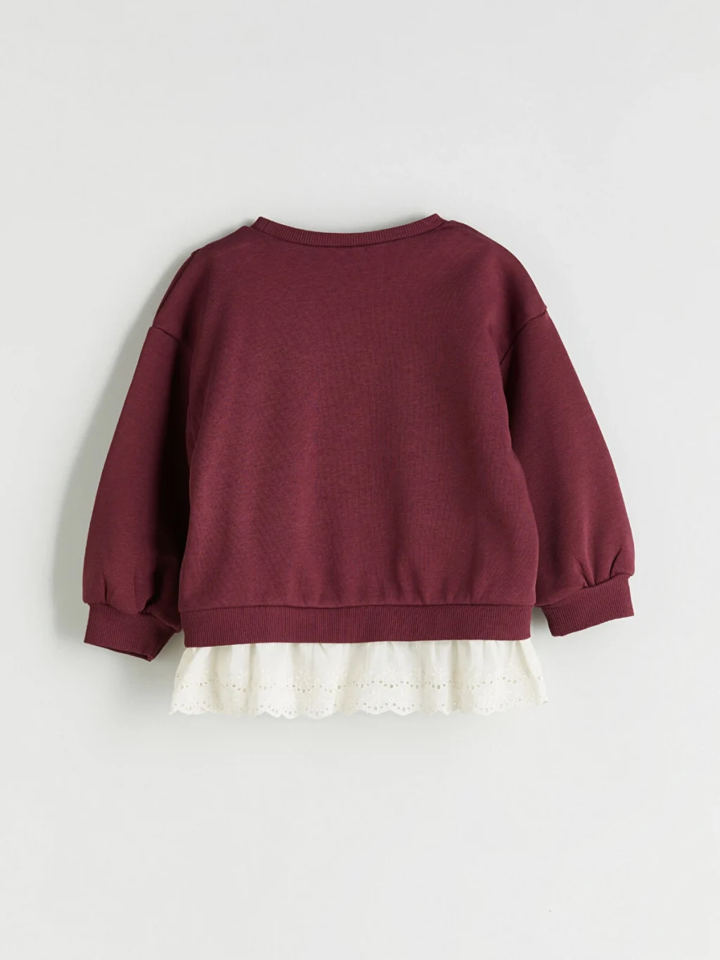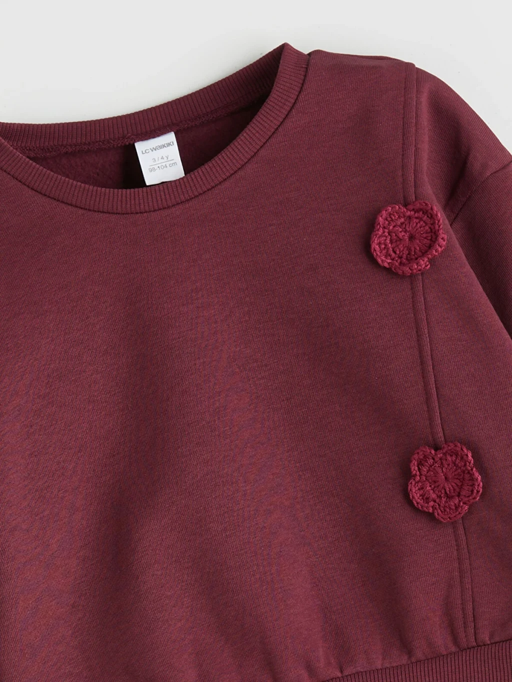 Bisiklet yaka, uzun kollu kız çocuk sweatshirt, kalın 3 iplik şardonlu kumaştan üretilmiştir. Önünde çiçek aplikesi, etek ucunda brode detayı vardır.