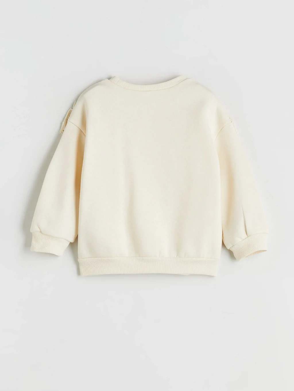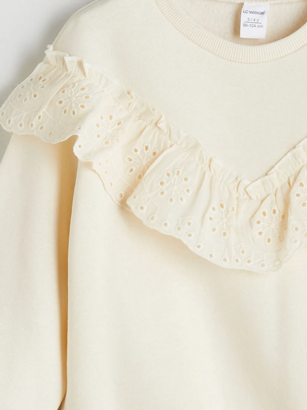 Bisiklet yaka kız çocuk sweatshirt, uzun kolludur. Göğüs kısmında V şeklinde fisto detaylı fırfırı bulunur. Kol uçları ve etek ucu ribanalıdır.