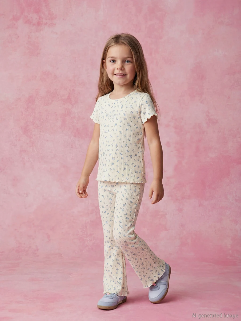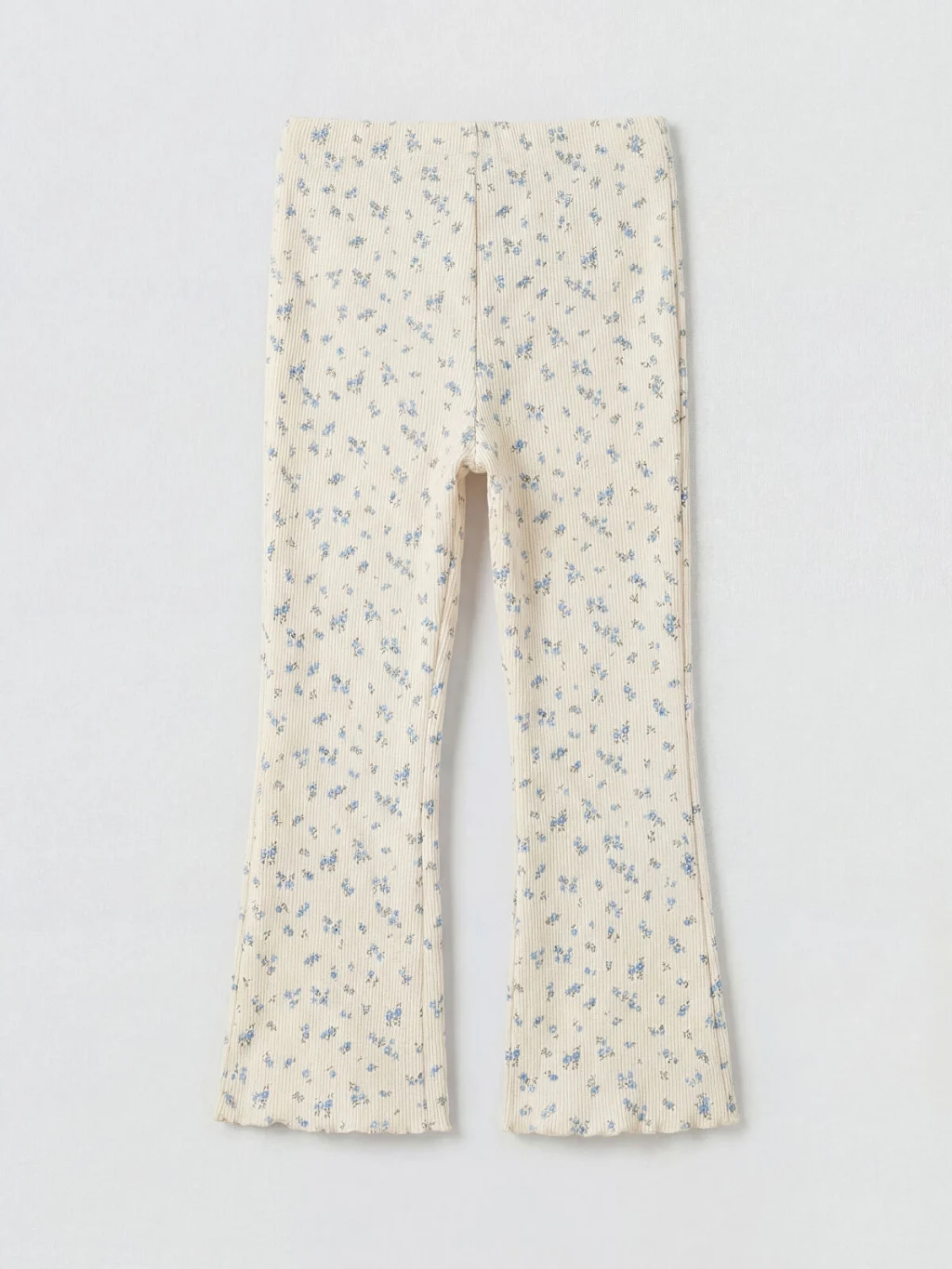 Beli lastikli, çiçek desenli kız çocuk tayt, kaşkorse kumaştan üretilmiştir ve ispanyol paça kesime sahiptir.