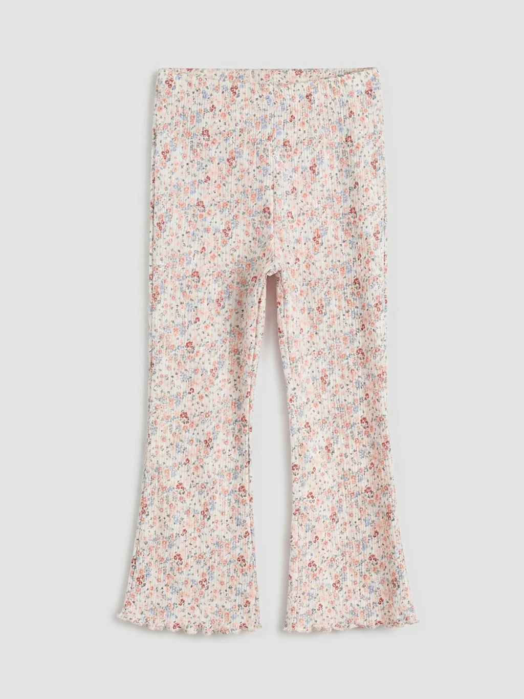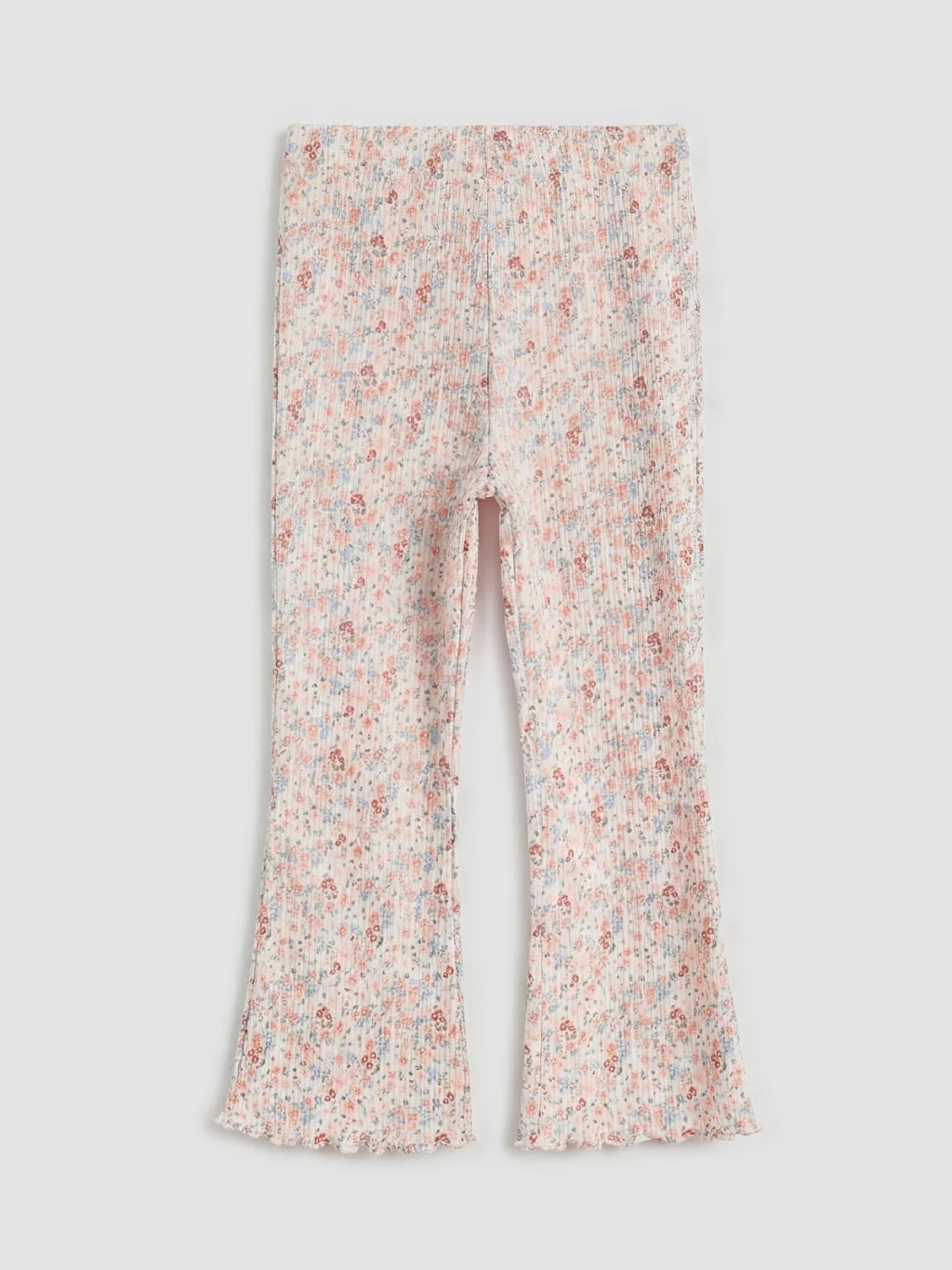 Beli lastikli, ispanyol paça kesimli ve paçaları kıvrımlı kız çocuk tayt, çiçek desenli kaşkorse kumaşa sahiptir.