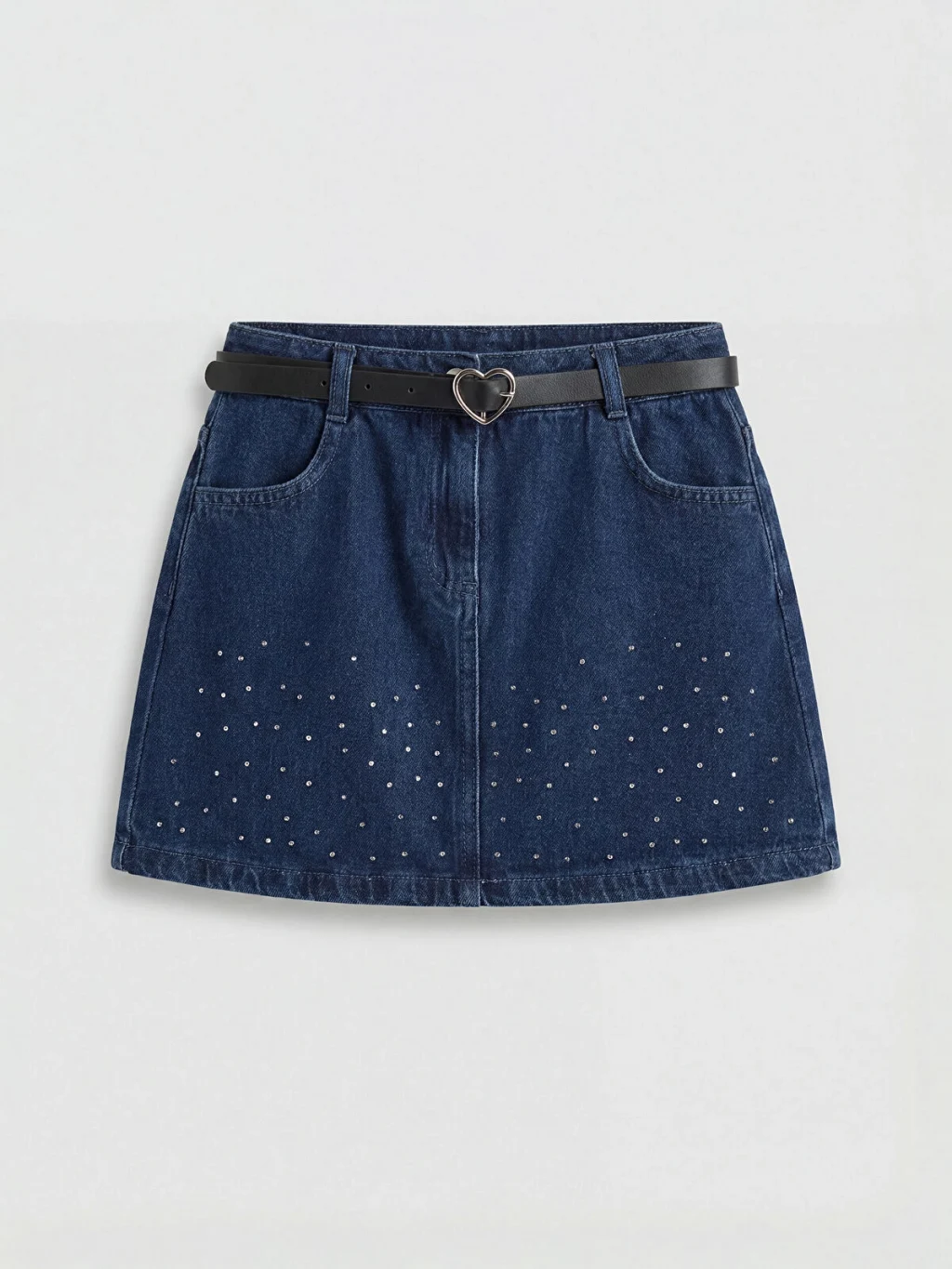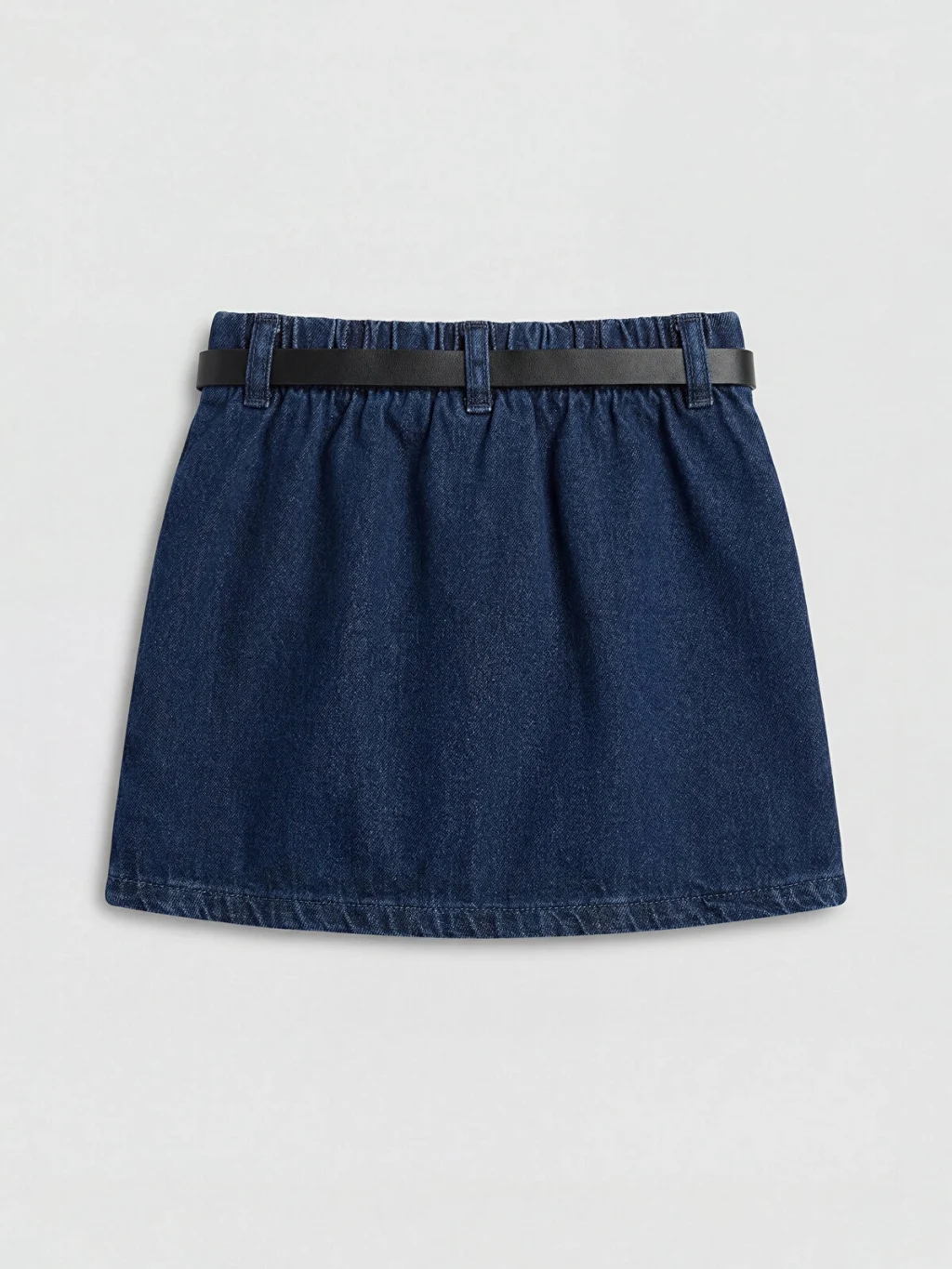 Kız çocuk etek, %100 pamuk denim görünümlü kumaştan üretilmiştir. Taş işlemeli, cepli, fermuar ve düğme kapamalıdır. Kemer dahildir.