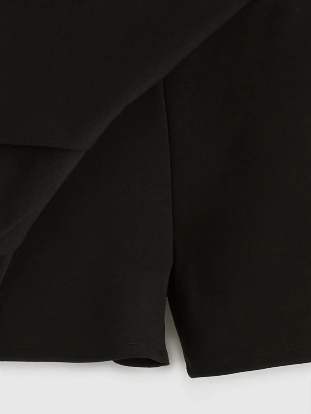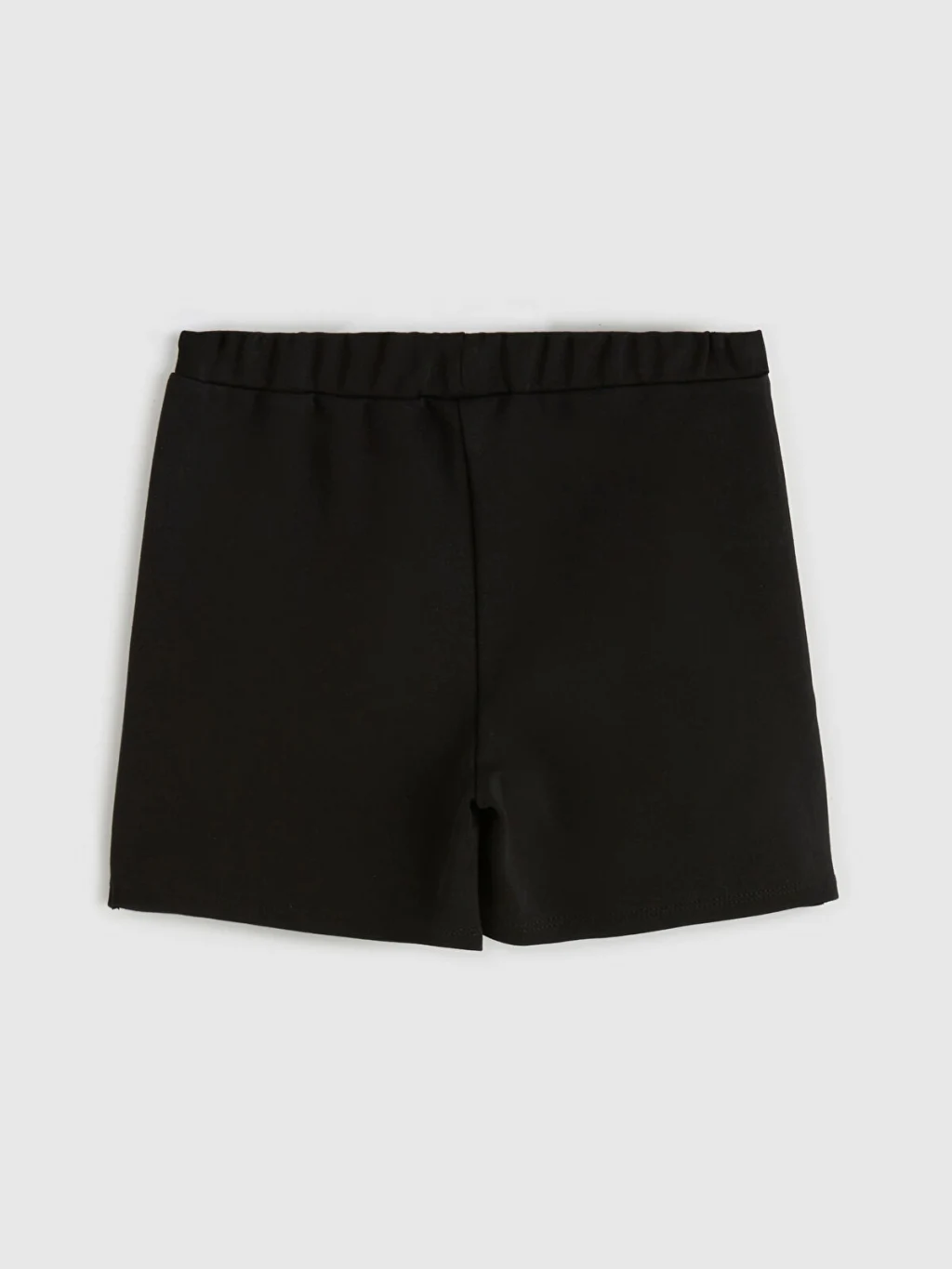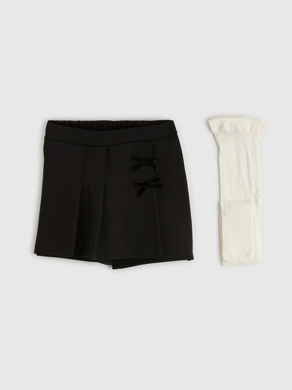 Kız çocuk için beli lastikli, fiyonk ve pili detaylı şort ile külotlu çoraptan oluşan takım, yüksek pamuk içerikli kumaştan üretilmiştir.