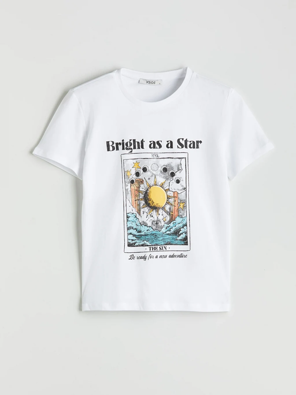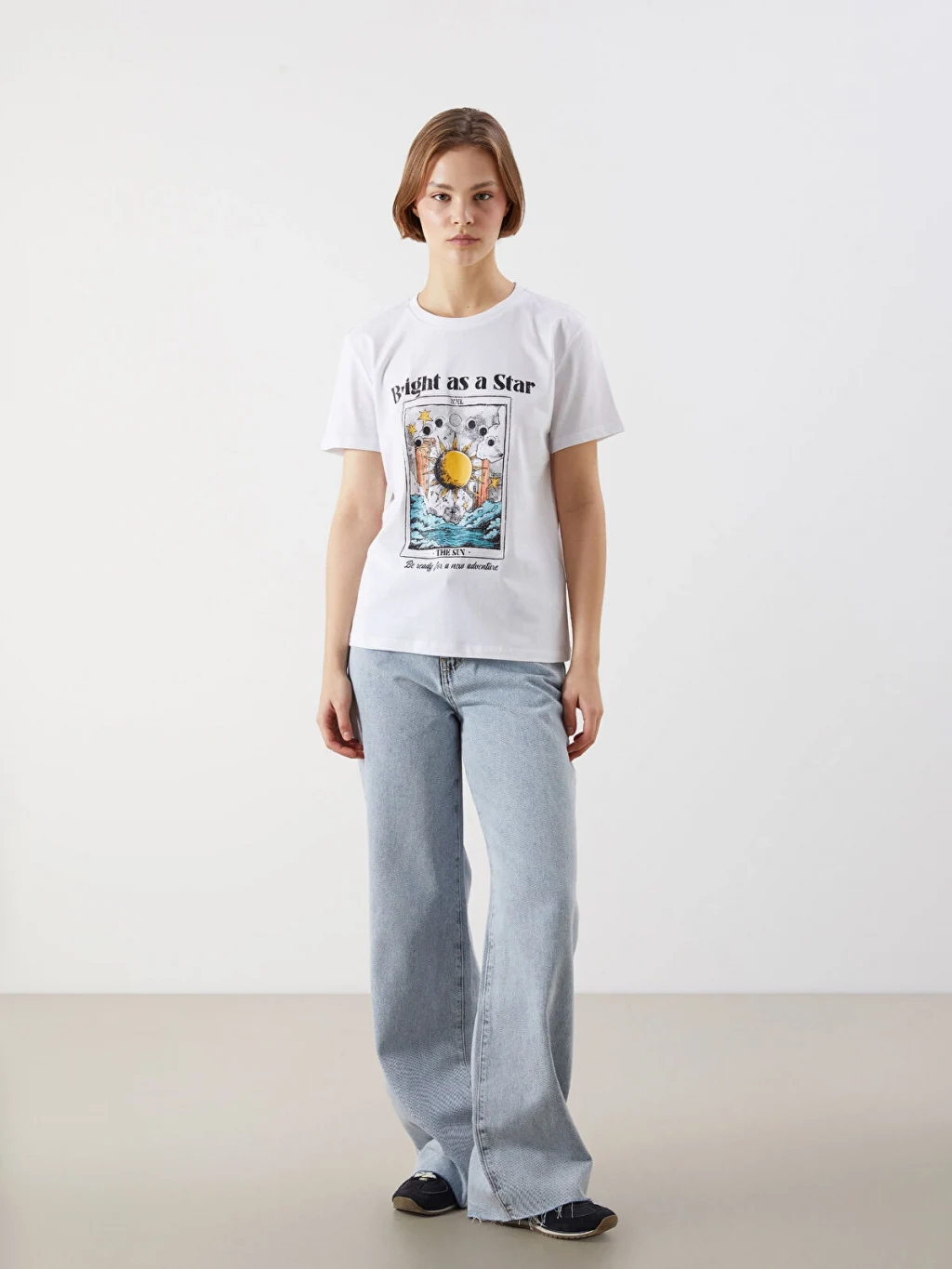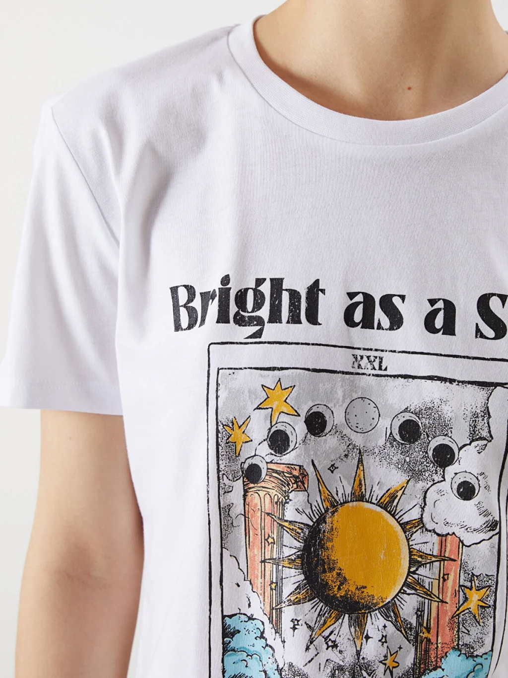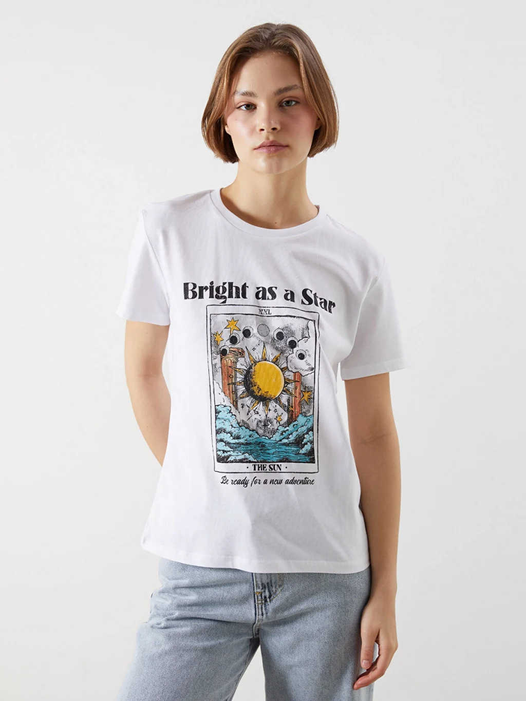 Standart kalıp, bisiklet yaka ve kısa kollu kadın tişört, %100 pamuklu penye kumaştan üretilmiştir. Ön yüzü baskılıdır.