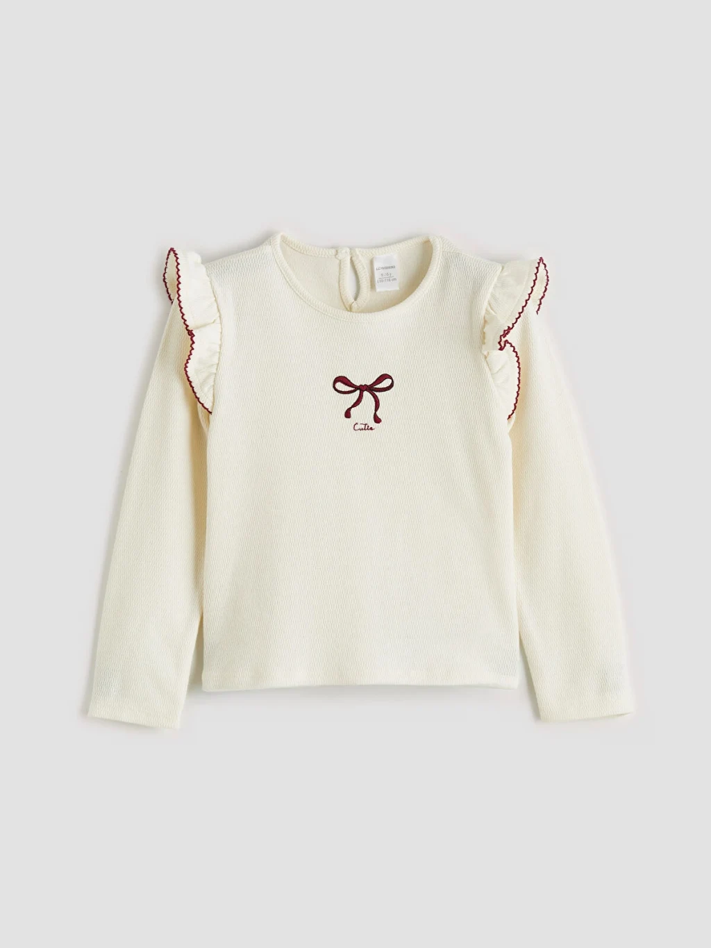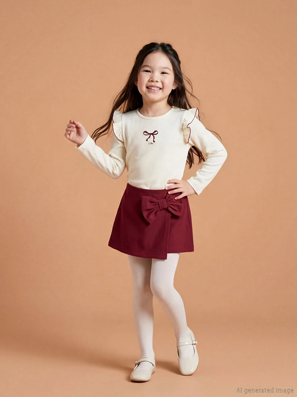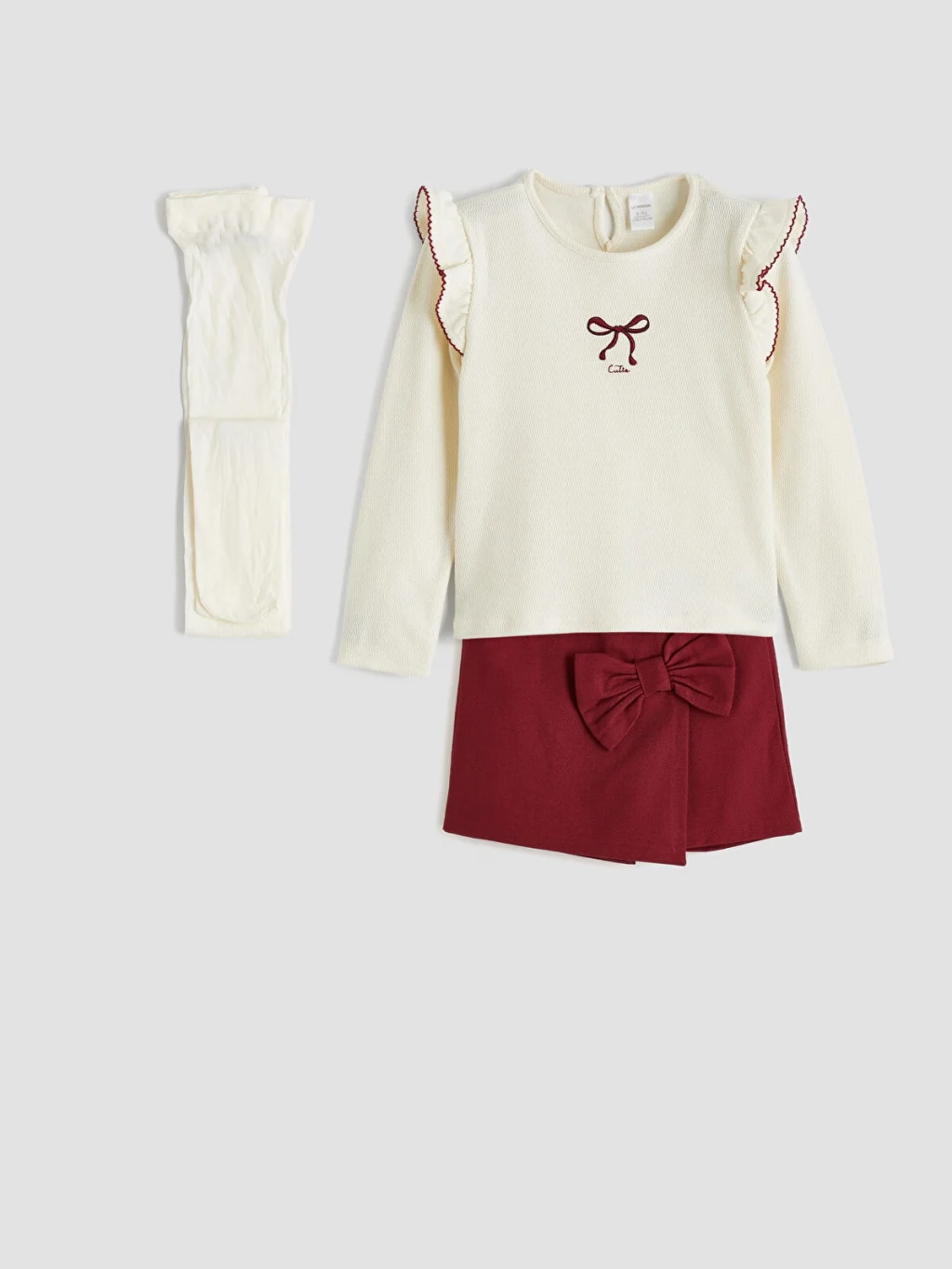 Kız çocuk takım, bisiklet yaka, uzun kollu, fırfırlı üst, fiyonk detaylı şort etek ve külotlu çoraptan oluşur.