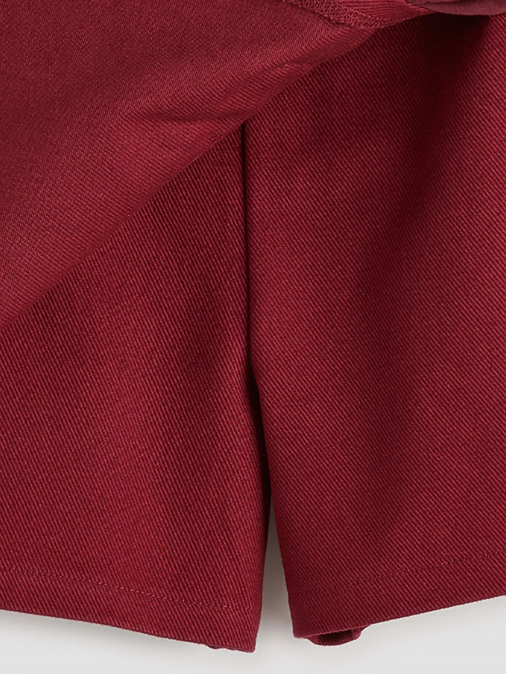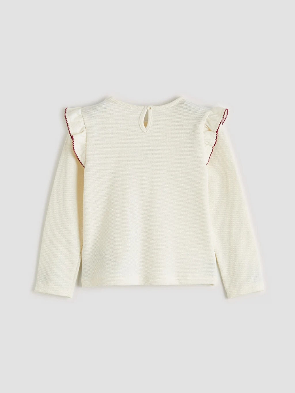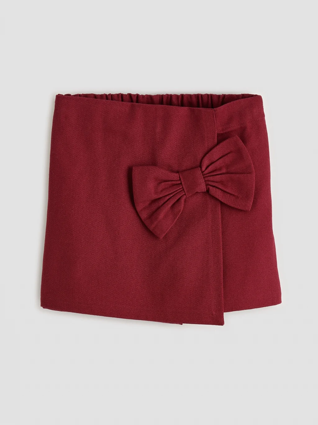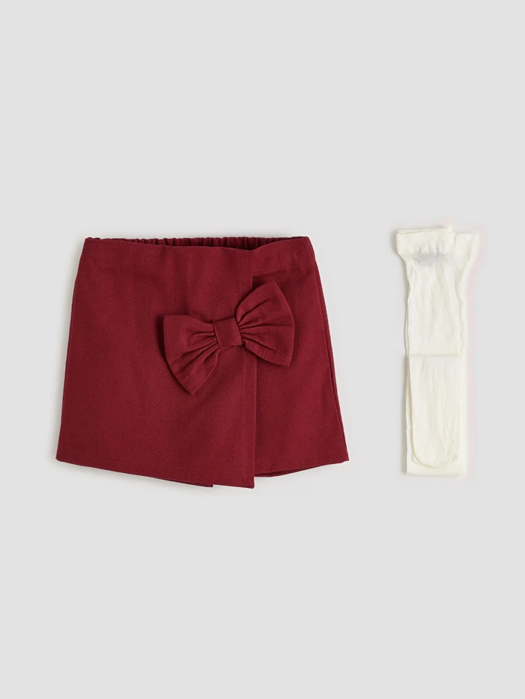 Kız çocuk takım, bisiklet yaka, uzun kollu, fırfırlı üst, fiyonk detaylı şort etek ve külotlu çoraptan oluşur.