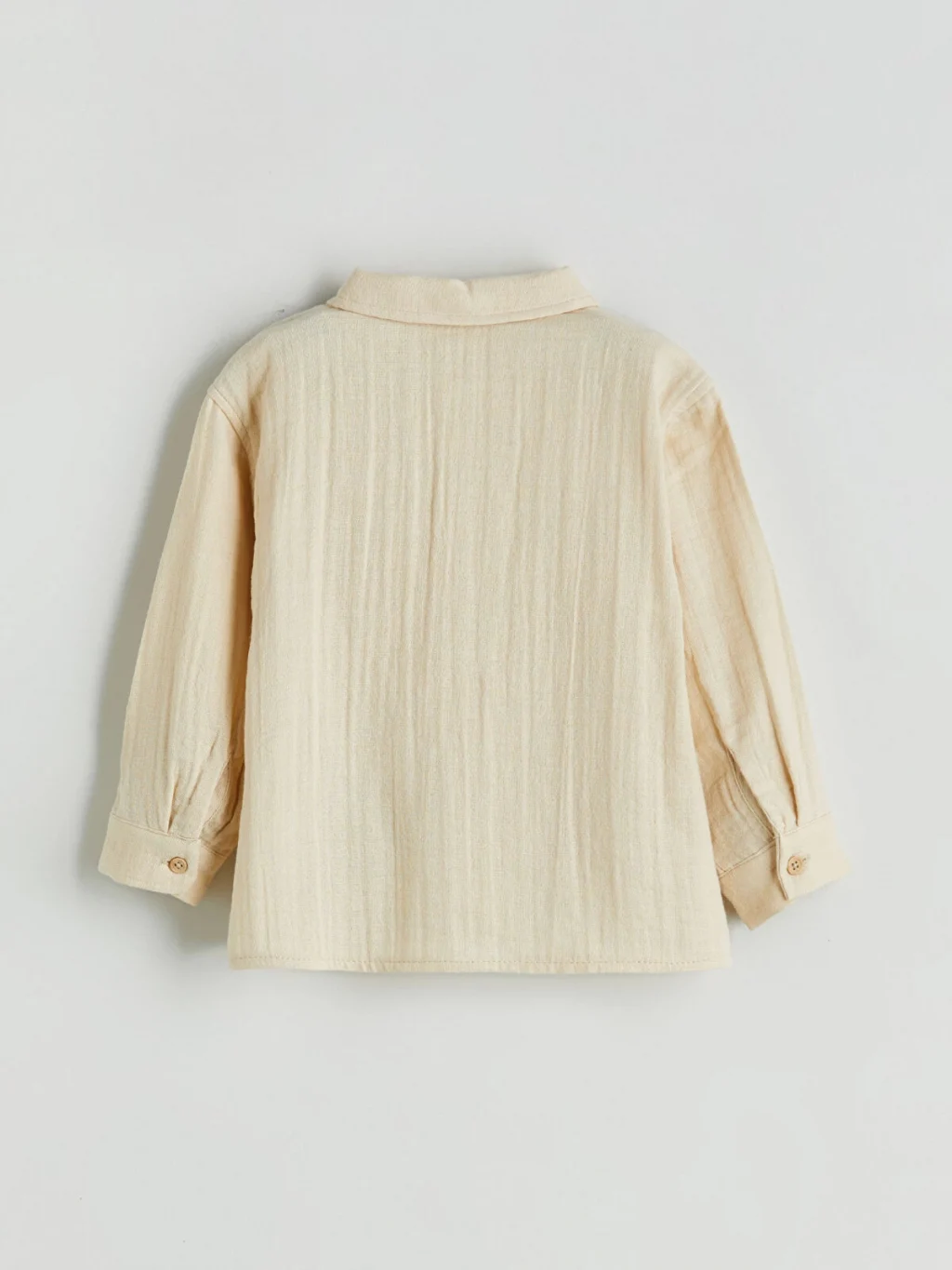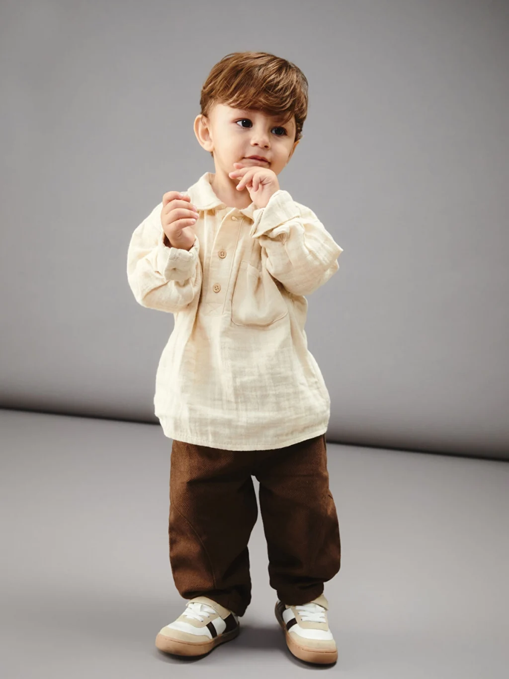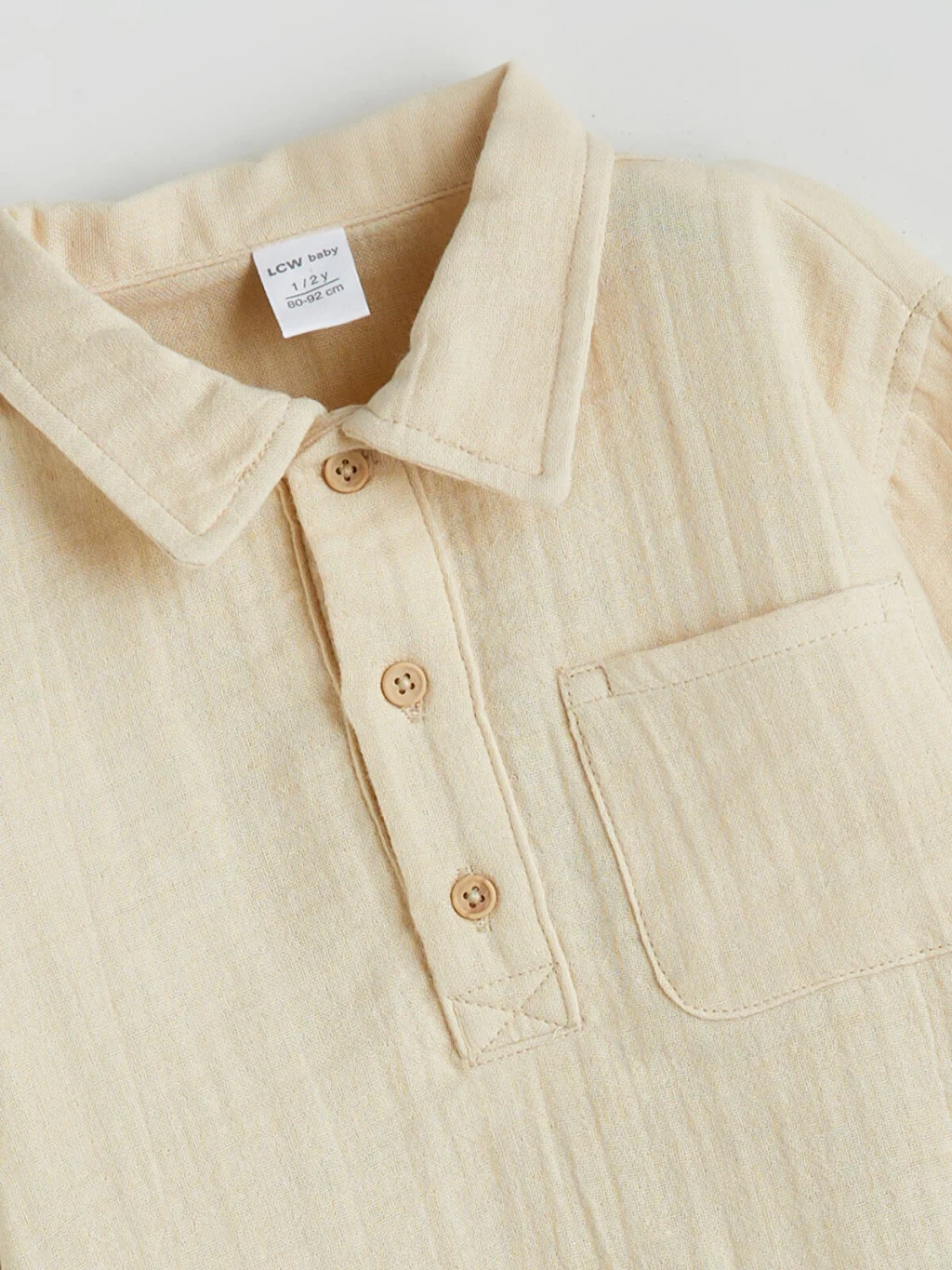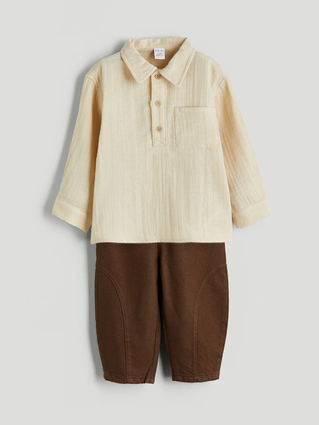 Erkek bebek takım, gömlek yaka, uzun kollu, yarım düğme kapamalı ve göğüs cepli üst ile dikiş detaylı pantolondan oluşur.